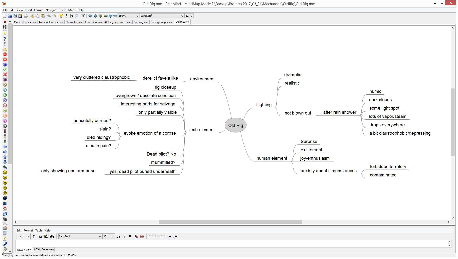When I got my facts right and the correct inspirational material at hand I proceed to structure what I want to show. I bring the loose notes, which I mentioned above, into a mind map, together with everything else I can brainstorm up on the task at hand.It does not matter, if you do this digitally or on a piece of paper, but since my paper mind maps tend to get really messy really fast, I prefer to use another freeware tool for this: Free Mind (http://freemind.sourceforge.net/wiki/index.php/Main_Page). Nothing fancy again, but useful to keep things orderly and also a bit more condensed and with more relational order than pure bullet point lists ;). The following is not an image related to the actual project, but you get the idea about Free Mind