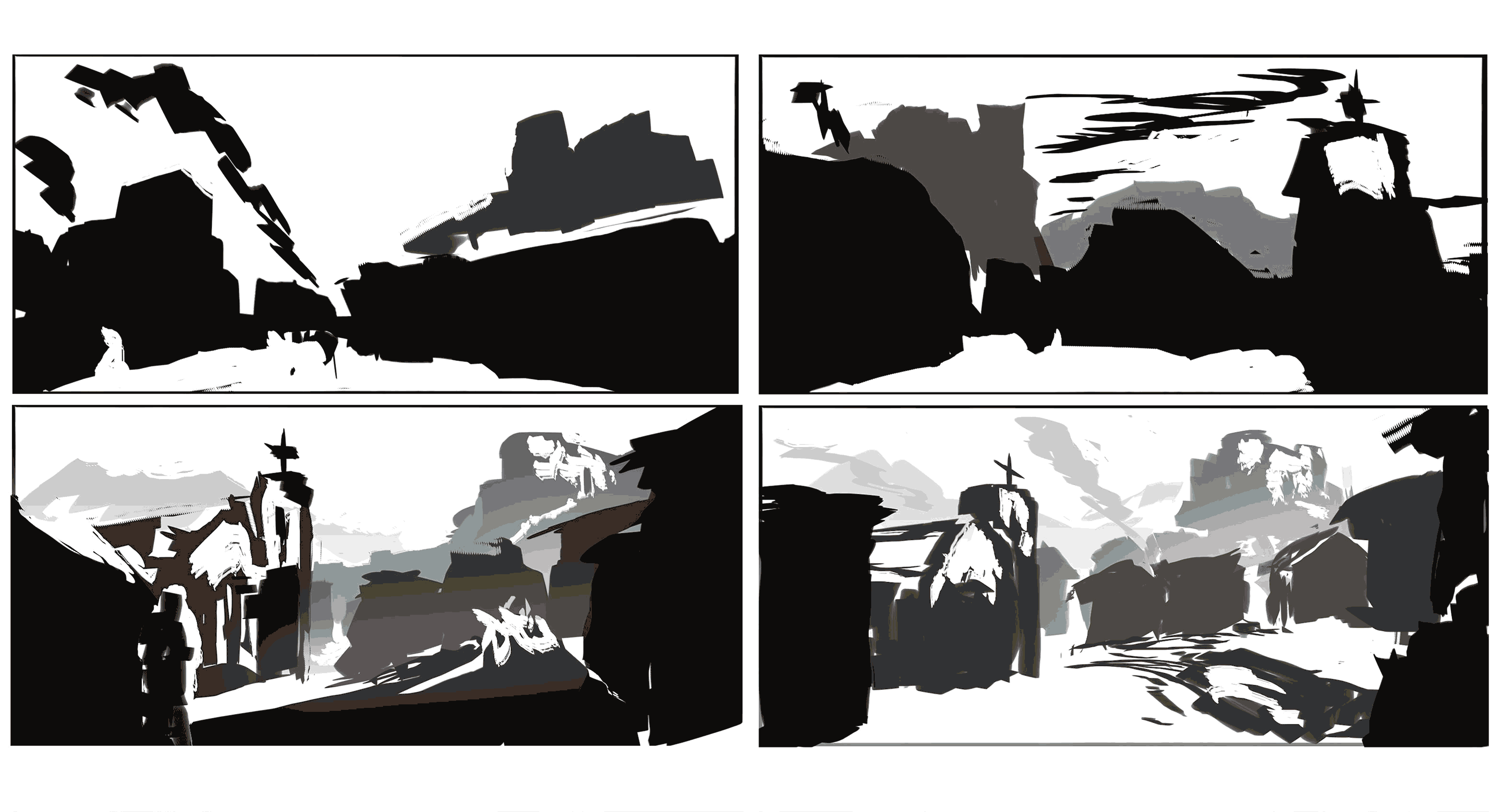 Now that I have facts and a theoretical plan, it’s time for some sketches! I try to nail the composition first and eventual details (like singled out characters, props etc.) later, so I can make sure they fit into the composition first.This of course depends again on the specific task and since mine was the arrival shot of the doctor in the village, I set out to find a composition for that. If I can, I do these sketches in Photoshop just because of the invaluable versatility and time saving potential of traceless erasing, transformation, layering and value manipulation. Don’t get me wrong, I deeply admire every skilled and focussed traditional artist and also like to use my sketchbook when I am waiting or traveling on the train etc.(in fact I did analogue sketches for this painting as well), but the power of digital is just such a time saver…The sketches in question are just flat greyscale shapes with very graphical light and shadow indication and rudimentary shading, but they fulfill their purpose. If you can communicate the important parts of the painting (Points of interest, depth relationships and size proportions), the same composition should also work in the finished painting.At this point one already starts to profit greatly from the previous research for now you can keep an eye on shapes and proportions of the architecture of the target period and region to stay in the acceptable boundaries.I adhered to the common principles of the ‘Rule of Thirds’, ‘Foreground, Middle ground, Background’, and ‘Large, Medium, Small’, etc. with this piece and arrived at the bottom right at a promising setup for the next step.