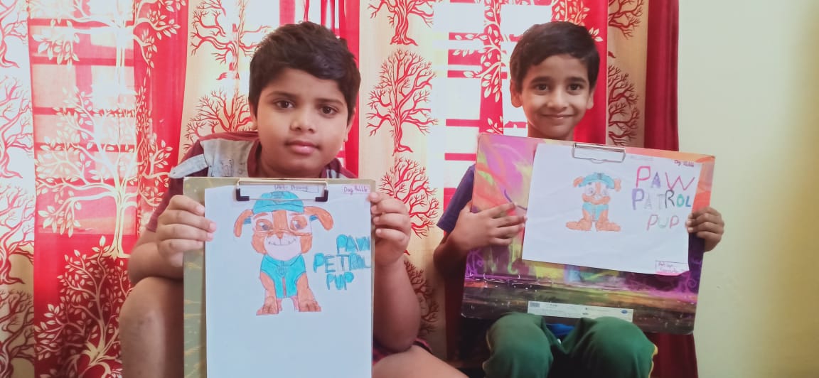 I would like to provide the details of the art work carried out by my elder son(7 years old) and my nephew(9 years old) and the work includes drawing of Rubble, one of the pups in Paw Patrol comic show on Nickelodeon.