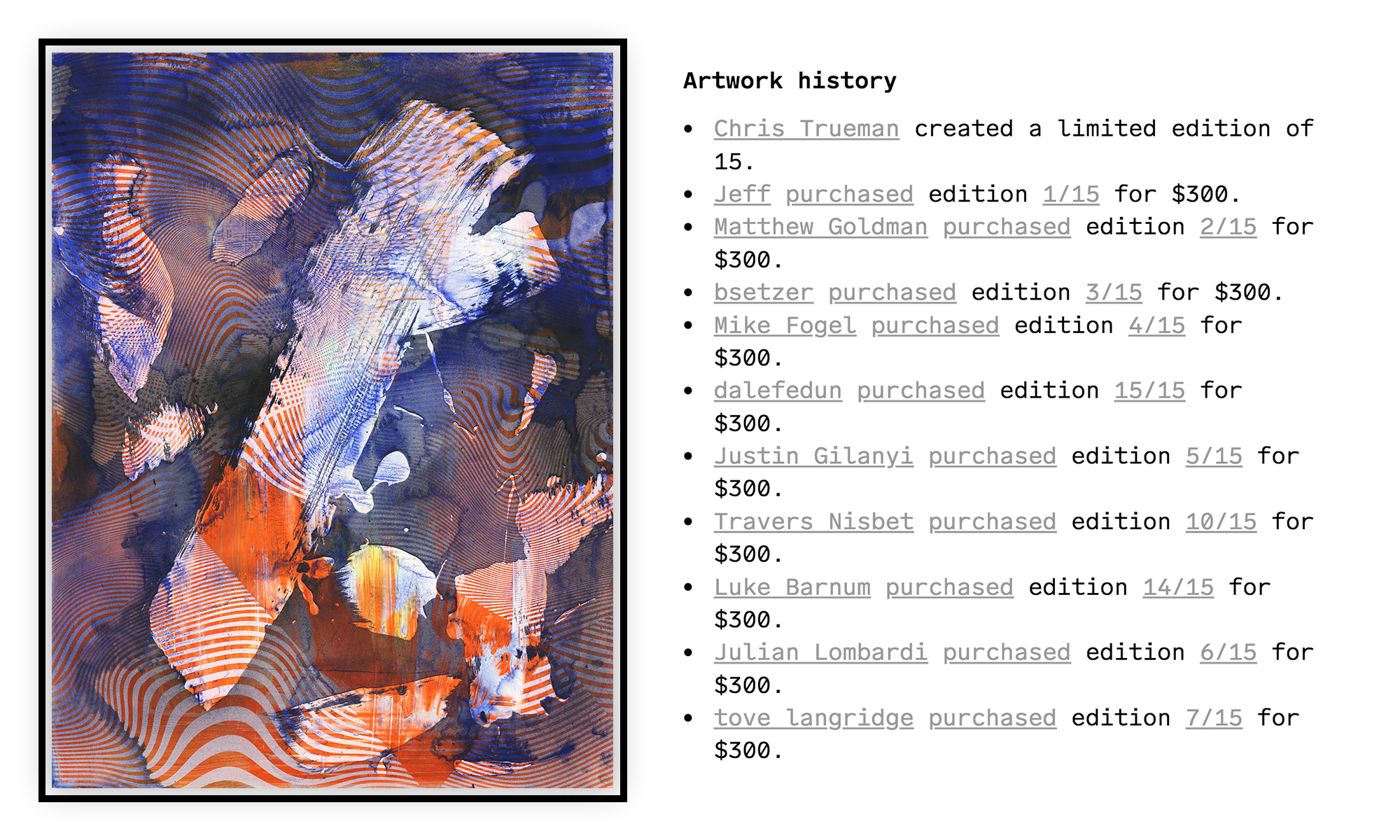 For artists, it’s hard for most to maintain a sustainable practice. Artists need and deserve more ways to generate revenue from their work. Our platform makes it simple for them to issue and sell their work to an enthusiastic, Internet-native community of collectors around the world.Artists also rarely benefit from their own secondary markets. We strongly believe they should receive guaranteed royalties when their works are sold between collectors. Each time an artist’s work is resold, an Ethereum smart contract-enforced royalty will be automatically disbursed back to them.