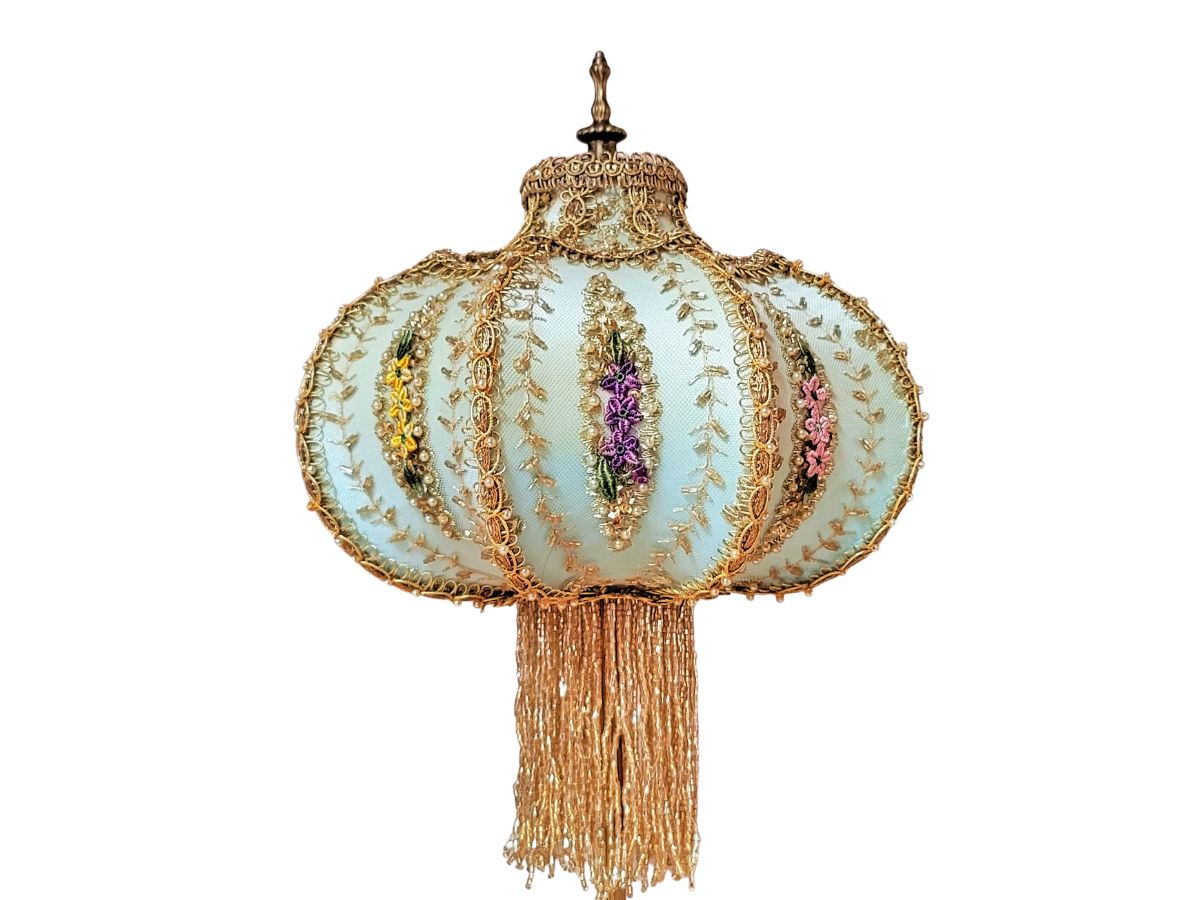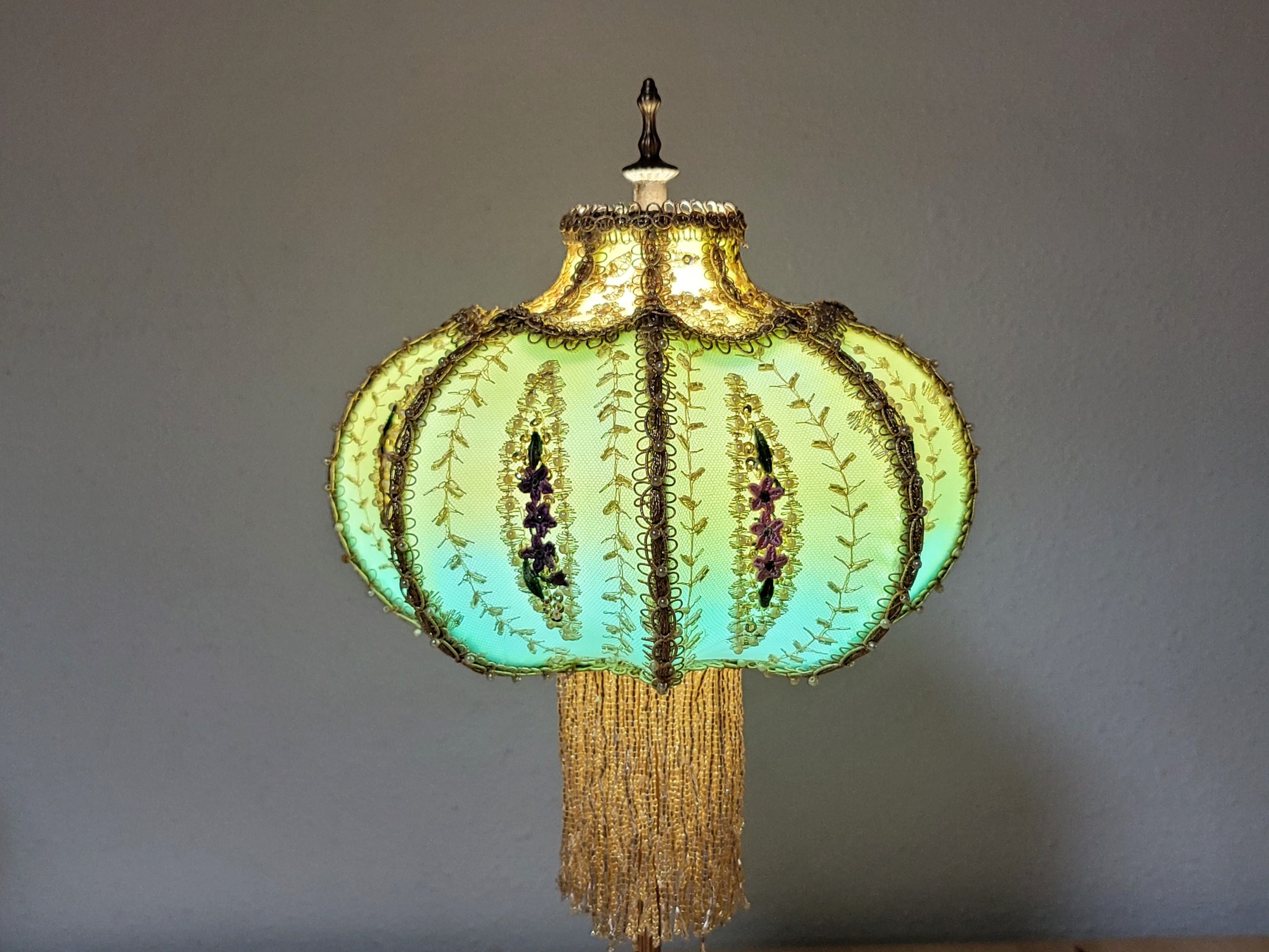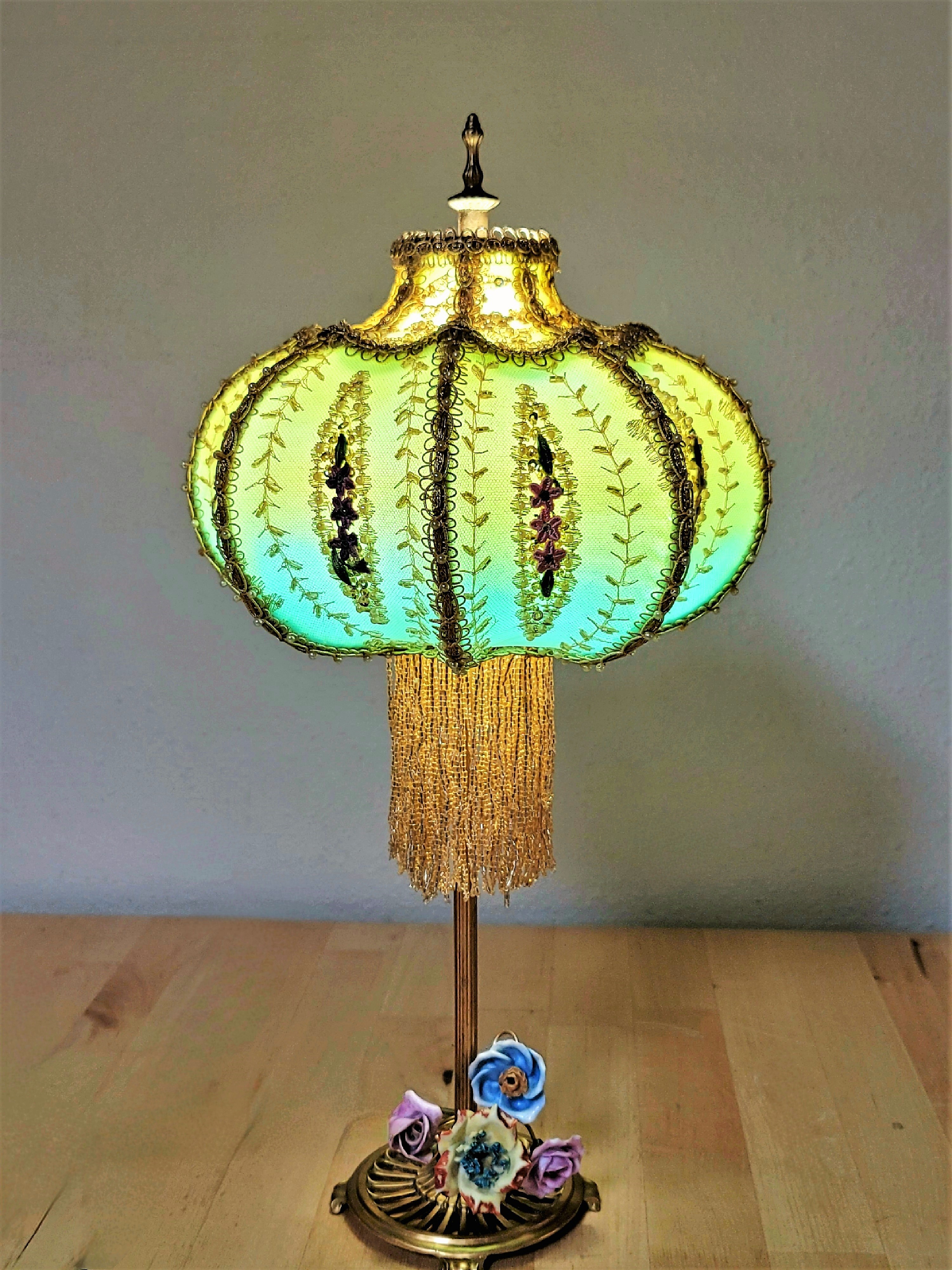 “Jellyfish” by Elegance Lamps is an opulent boudoir-sized antique lamp and handmade lampshade pairing in elegant, subtle celadon tones by day, yet gloriously vibrant color by night. Glittering gold shares space with pearls, sequins, and sparkling bugle beads!