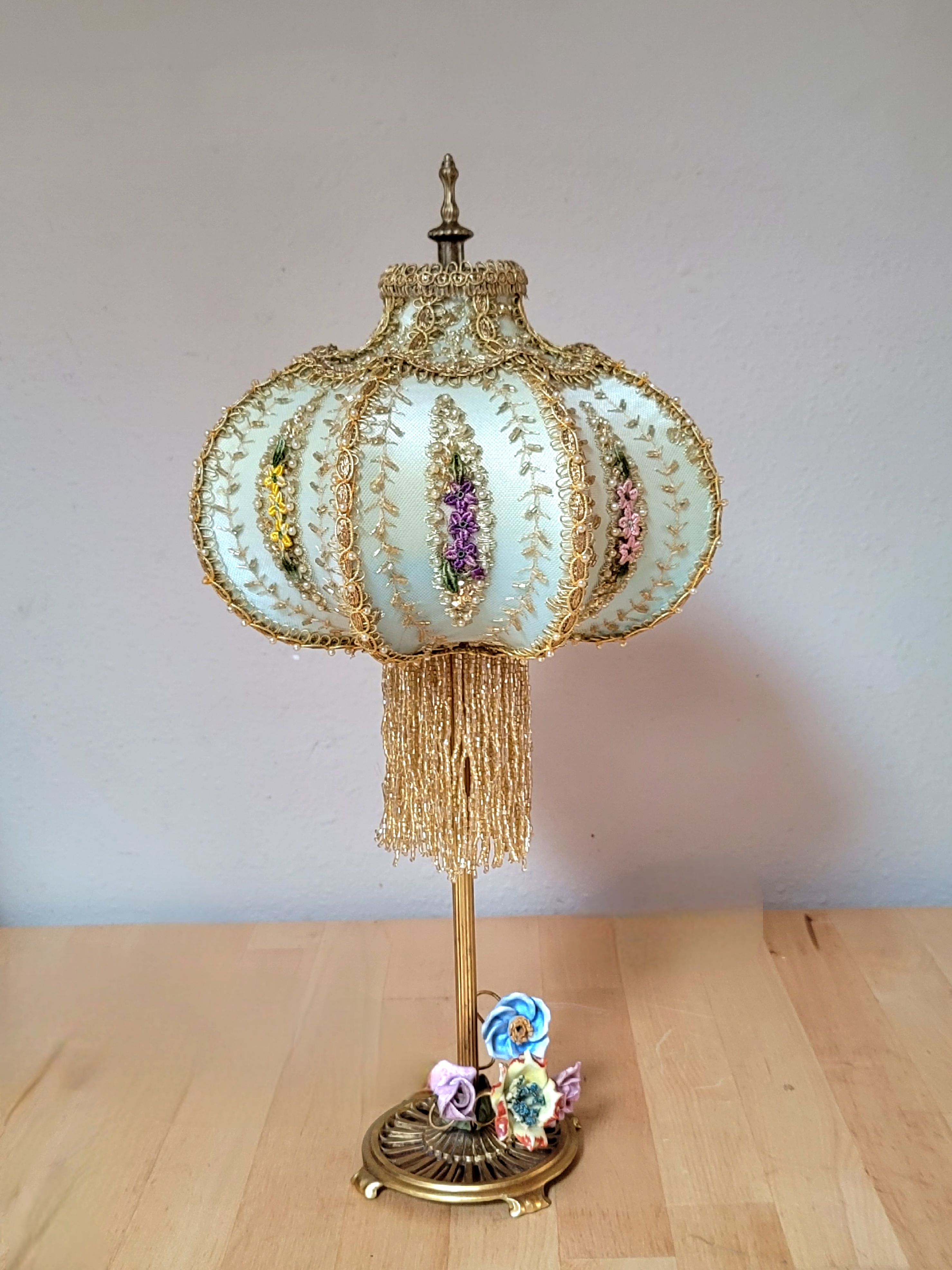 Delightfully shaped, the lampshade is professionally constructed with hand-dyed silk and heavily embroidered, beaded, and sequined outer lace. Accented with amazing tiny antique floral embroideries that I brought back from Paris in my suitcase!