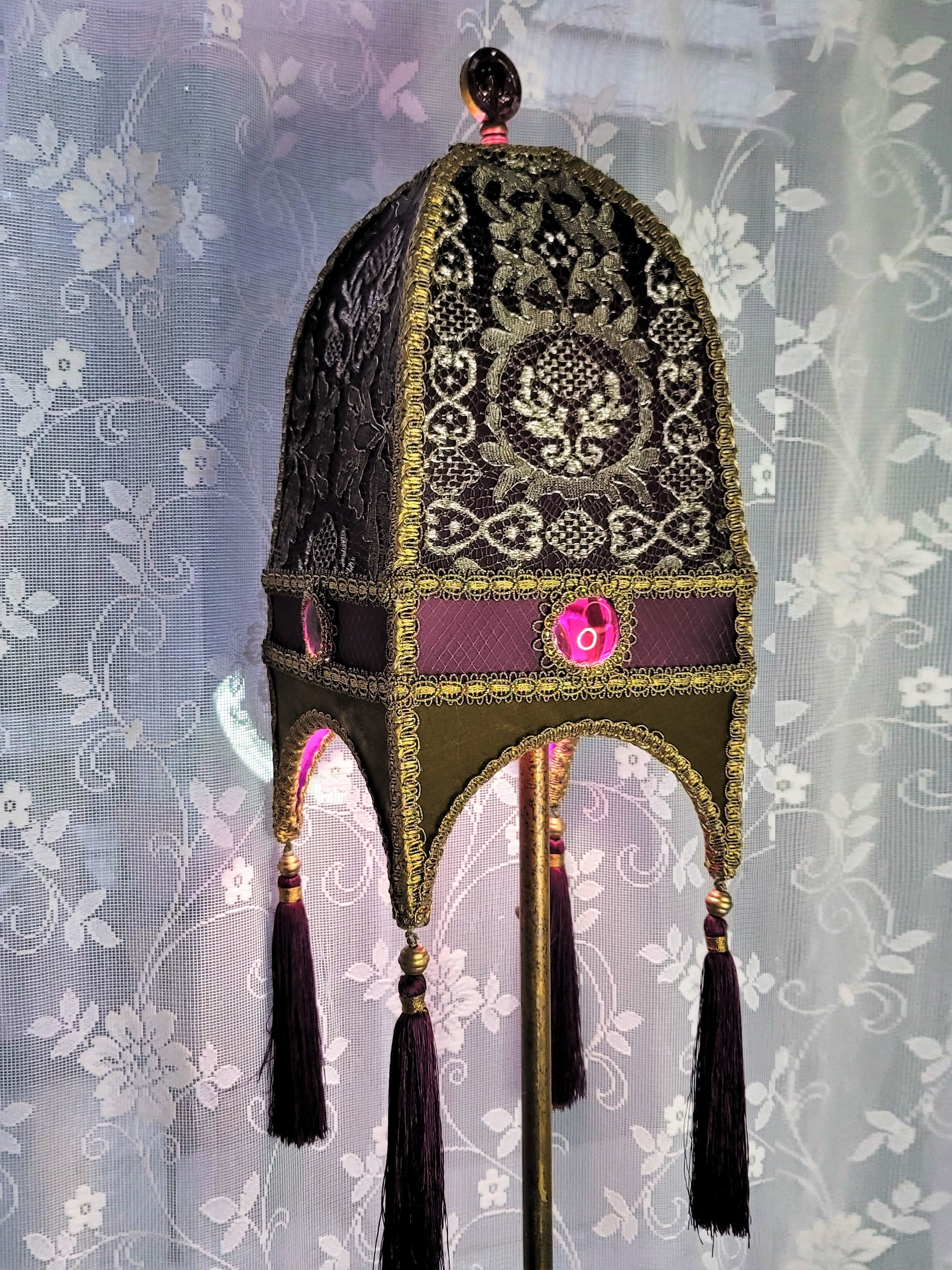 A dark renaissance piece, “Byzantine” by Elegance Lamps is a stunning unique lampshade with deep aubergine silk, regal antique laces, and Art Deco lines. A perfect compliment to dark décor styling.