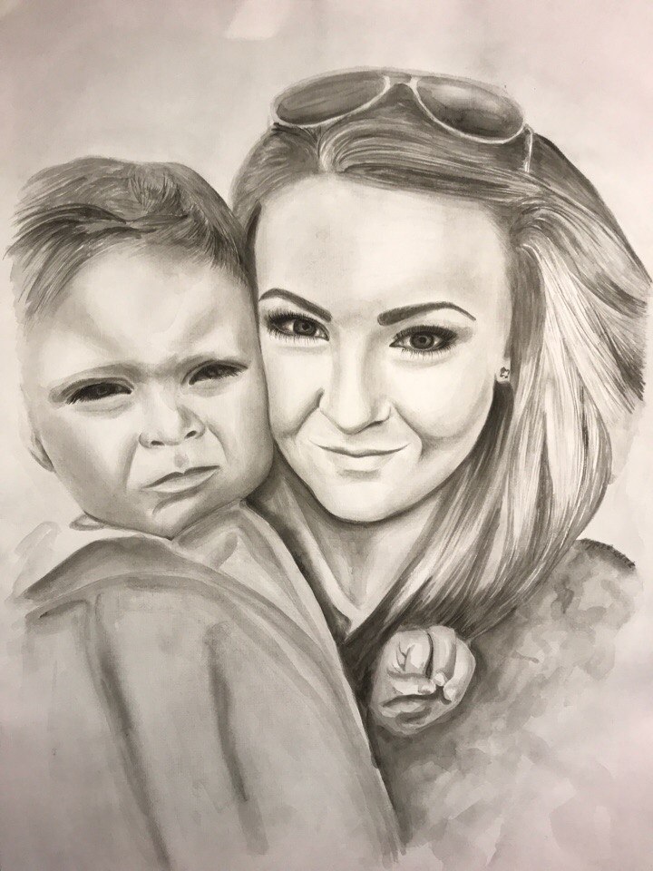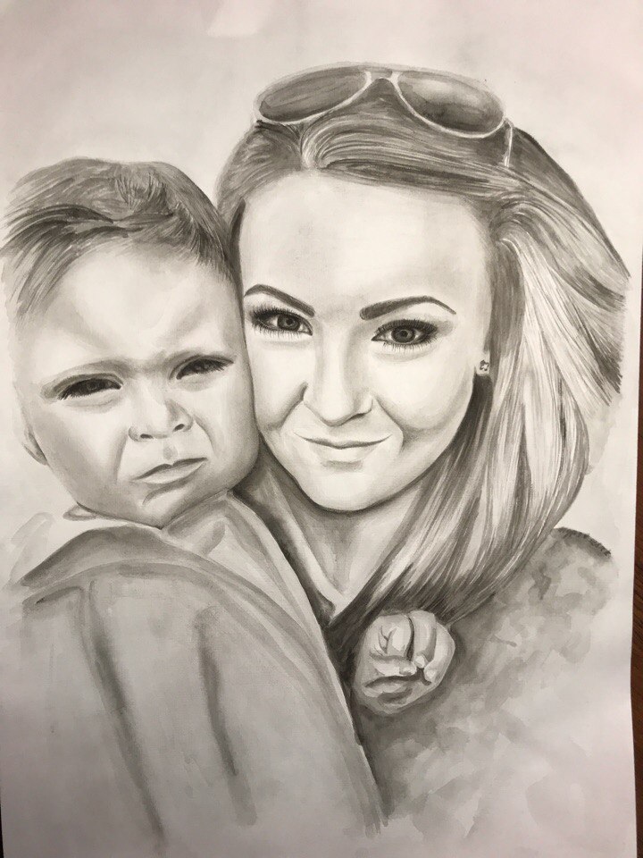 This is a sweet couple - the mother and her son. I know what kind of love they have, because I also have a little son. I love him very much. I hope that I will have a good portrait, because I can convey the exact feelings. Because I know these feelings. This portrait will be full of love and warmth. Motherly love is so strong and warm. I drew a grisail technique. In fine art, the term grisaille most often refers to the technique of monochrome painting, by means of which the painting or drawing is performed exclusively in shades of gray. Grisaille helps novice artists understand and feel the relationship of tone and volume, without being distracted by the search for suitable colors. The technique of grisaille - most often performed in black and white or brownish white. This is a good way to deal with the tone in painting, when we work with a brush and paint, but without color, we translate the form into a spot, which, in fact, is a pictorial language. The practice of grisaille makes it possible to take a more meaningful approach to painting work, using in it everything that we know about working with tone and adding color to it.