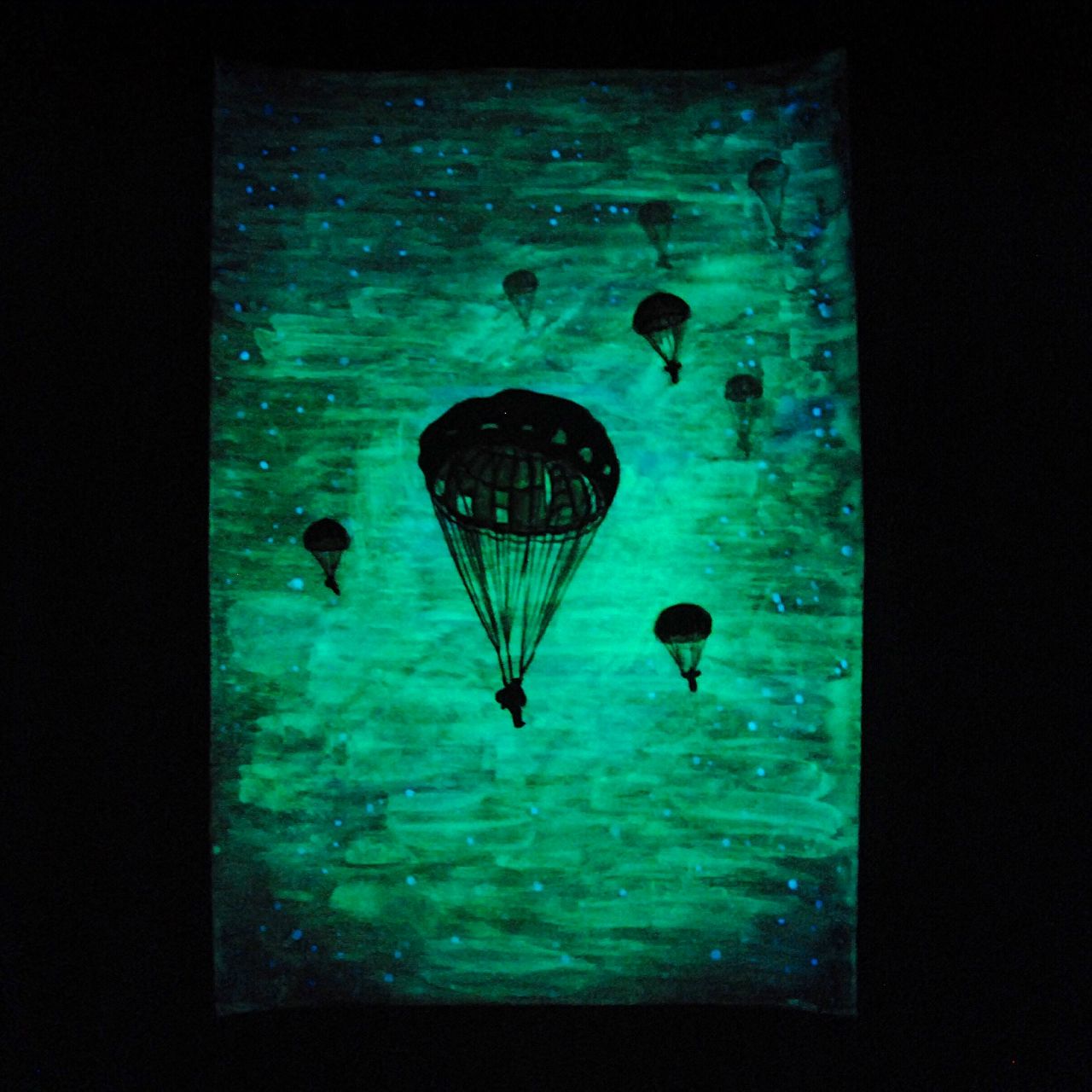 An image that shines at night. To create this photo, I needed canvases, acrylic and fluorescent colors. With a good "charge", the luminescence duration can reach 18 hours with a gradual decay after the charging by the light continues to glow, and such cycles are endless! Resource luminescence of paint / paint / pigment is at least 50 years. One layer will dry for at least 30 minutes. At the final stage, I will finish everything in the dark, correct the glow so that everything is smooth, uniform, clear.