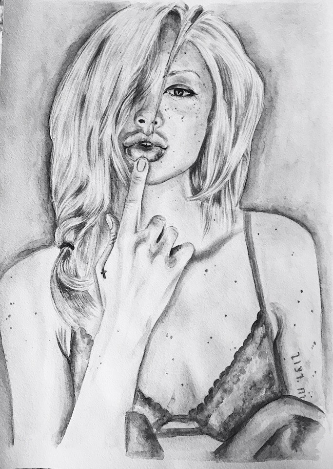 I painted a sexy young lady full of passion. This is the manifestation of femininity.Sometimes, in order to get beauty, enough paint and desire.The most important thing to pass to the canvas is the general mood of playfulness, flirting, as if a little innocent and accidental.I used watercolor to create a portrait.