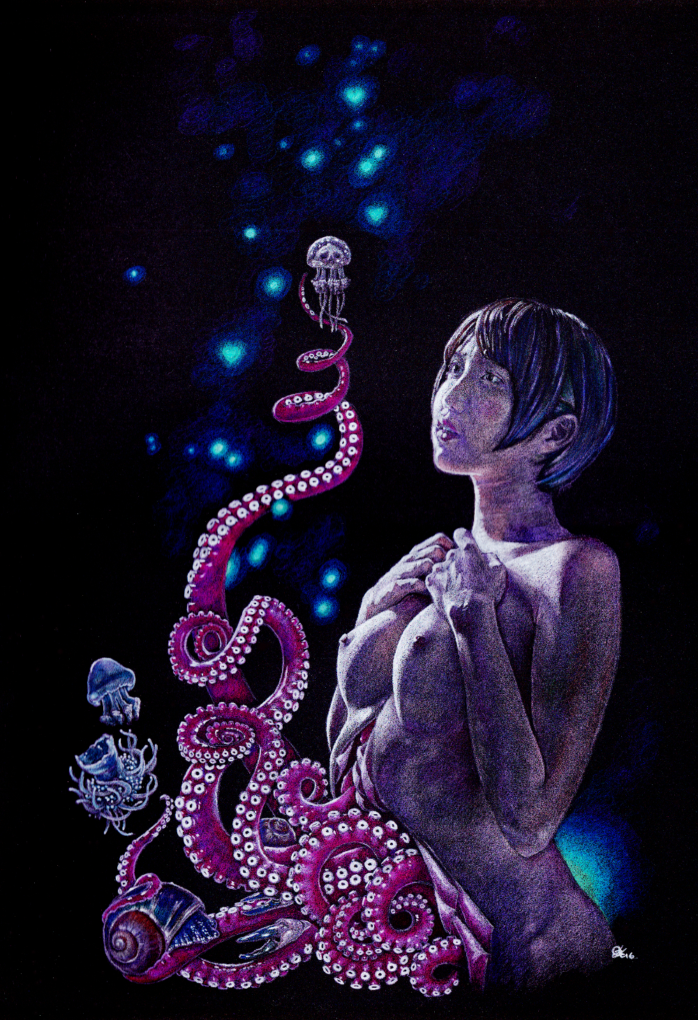 Amazing artwork, I love surrealism and your piece is very original and very well worked, I congratulate you! Even the girl looks sexy hahaha also seems that the tentacles dance with stars and jellyfish. I invite you to see my blog so you know my artworks, colleague. regards