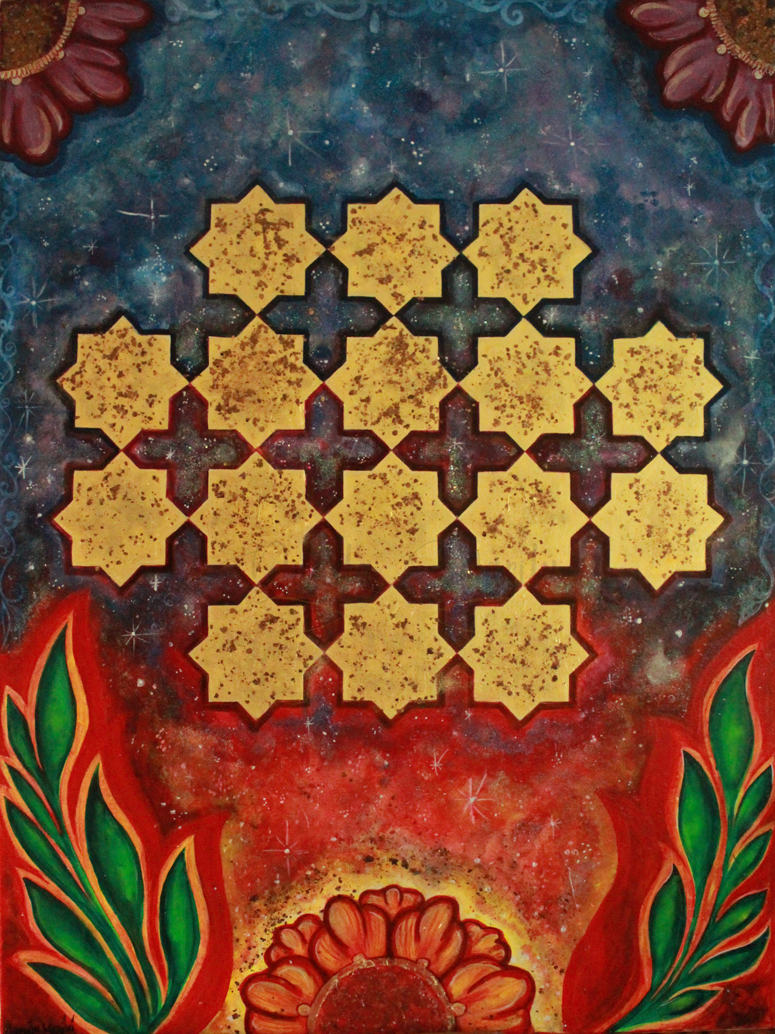 Hola amiguitxs! Hoy les comparto esta pintura hecha en mixed media que hice inspirada en la clase de geometría islámica que tomé este año, que les parece?