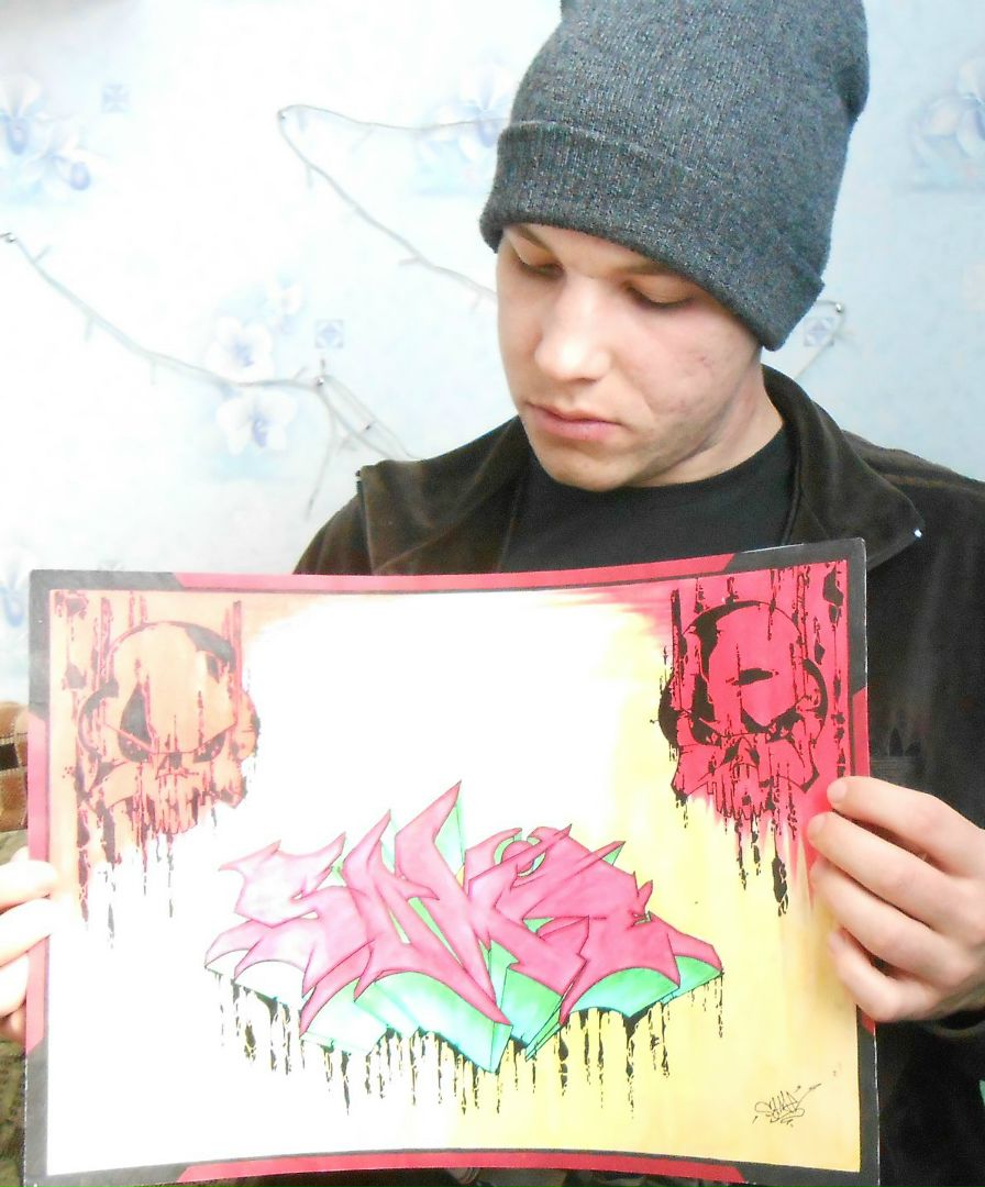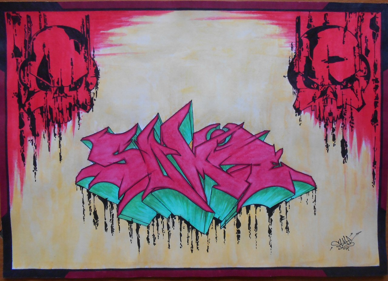 This is an old drawing from the time when I persevered in graffiti, I was obsessed with it. And after this post there will be more posts with my graffiti, as well as you will see graffiti painted by me on the walls. Here is such a vivid drawing of broken letters in watercolor, and on the sides are skull-like masks depicted in an interesting stylized version.