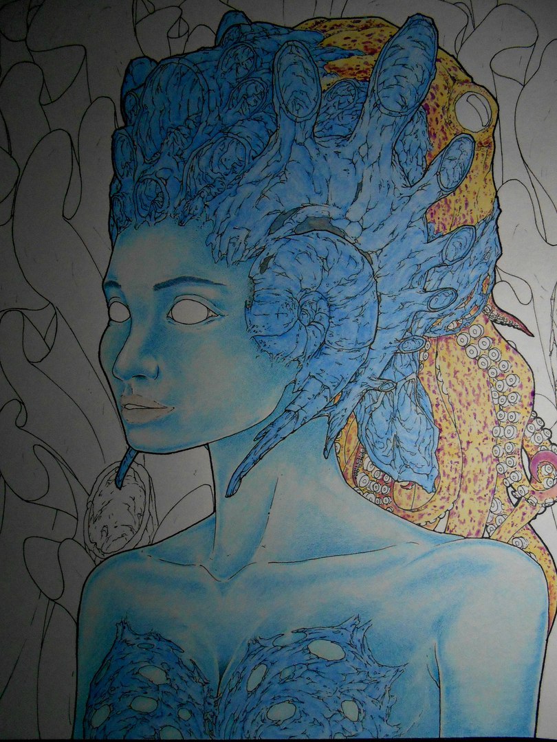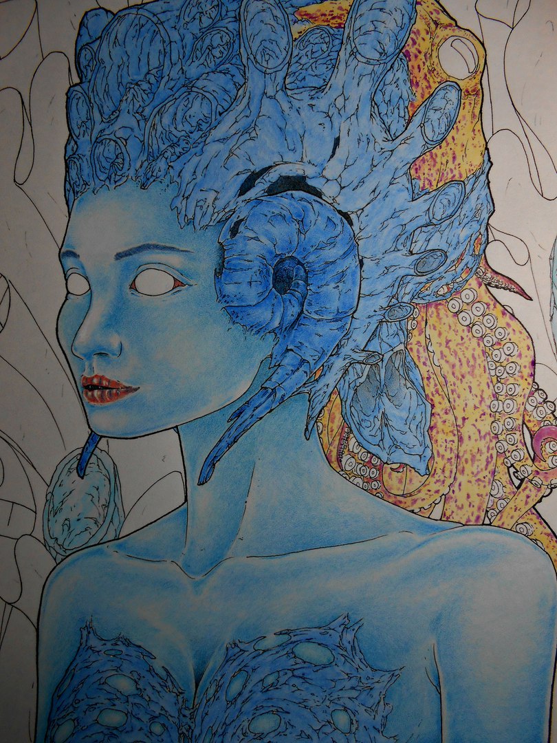 Hello! I present you one more remarkable work, of which I am proud, this is also a theme with portraits and my style. I had this idea for almost half a year, at first I copied the necessary foreshortening of the portrait to myself and abandoned it for a while, and after that time I got the inspiration for the continuation of this project.And I did a marine theme and partly attributed it to organic, for which a solid chitinous "helmet", behind which an octopus is fixed, it is like an ornament instead of hair. White and transparent eyes emphasize this amazing sea girl. A background consisting of huge seaweed.