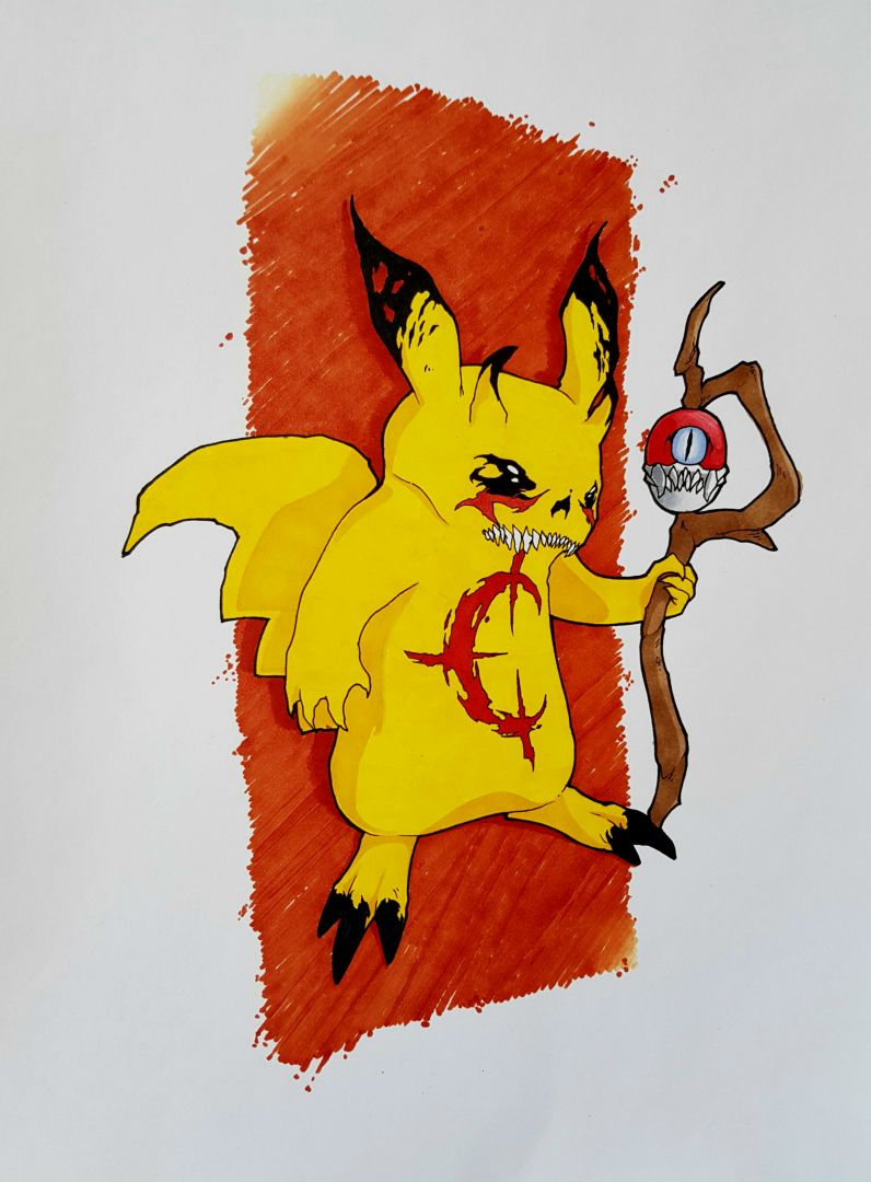 Hello everyone ..... today and before the Pokémon came my dark creative energy, turning them into a kind of demons, strong creatures. Today fell under the blow pikachu. Honestly, I have long had such an idea, namely, the Pokemon altered to its "handwriting," to breathe into the illustration with the Pokémon not a lot of dark and look at it ... It turned out to be a very pleasant result, if you are interested in a theme with Pokémon, comments do you want to see something like that? Sam pikachu in the form of a demon, with a stick inserted into it by a magical pokeball, which devours the original Pokémon