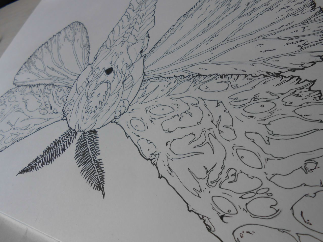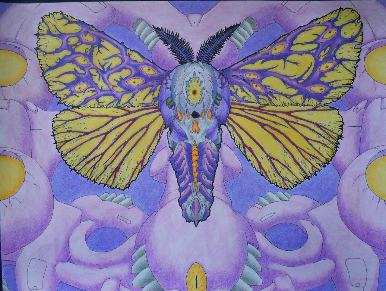 Here is one of the small formats of my project for technology in graphics (A2 format - 420x594). I worked on this project for a month. Here we see a moth that is not usual for the viewer. On the body of the body is the eye, and if you look at the upper parts of the wings, and there you can see yellow eyes. The moth itself is as if armored, boimechanical with echoes of organic matter. I'm generally a big fan of portraying insects in my vision with a view from above, due to what you can not just copy the insect as it is, but add your own elements and show some images yet, plus immediately make an interesting, intricate and decorative background.