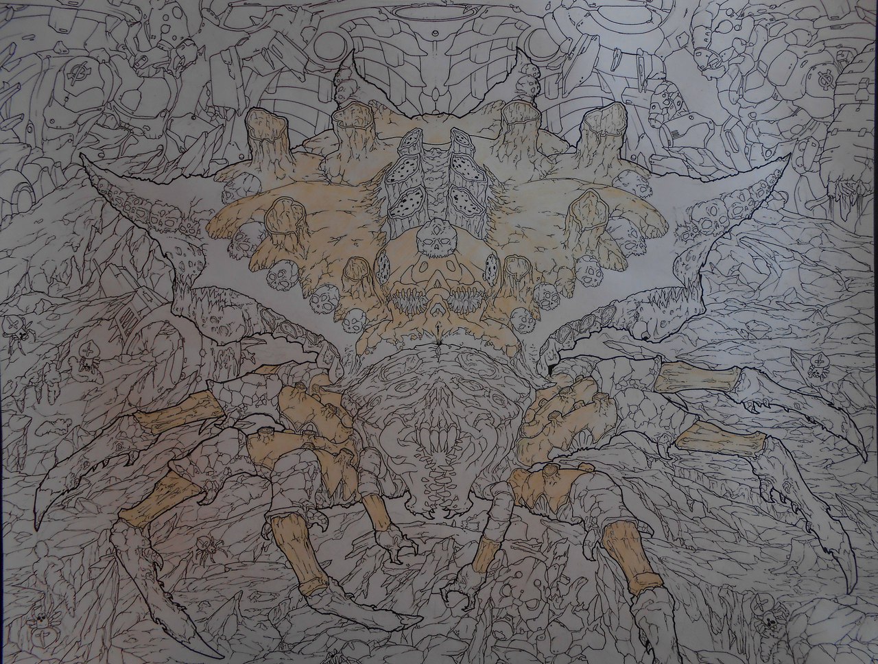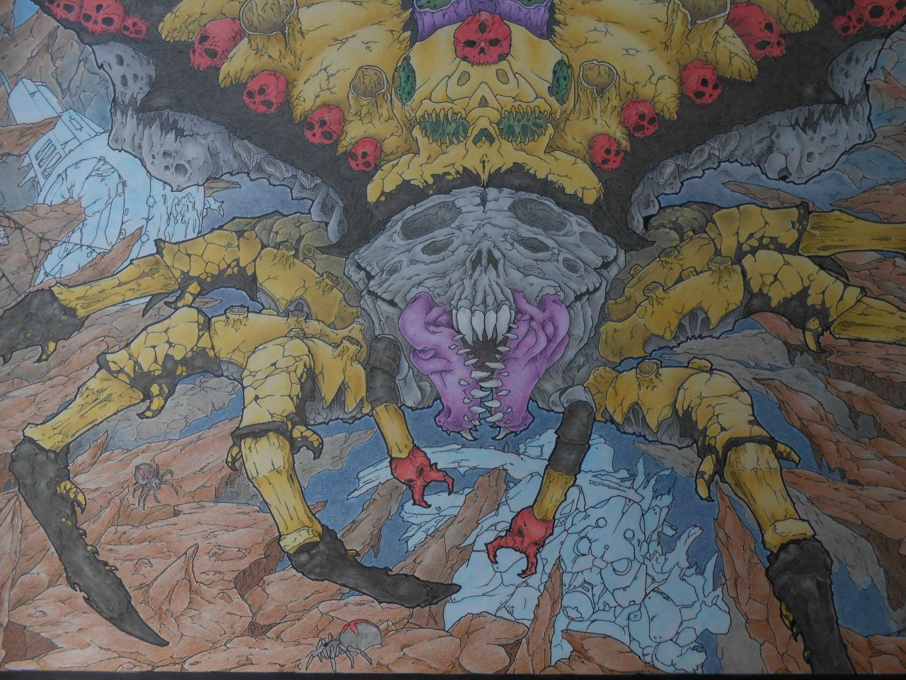 This project belongs to my series of fantastic insects, and this picture is currently one of the biggest and hardest of my projects.I was inspired by the pictures of this bizarre spider from the Internet (pictures are attached below). After I had already started my fantasy and sketches on paper.I showed a very peculiar in its picture, where we see how a huge future temple built by people was attacked by a spider like that.It's not the usual back part of the spider, on which you can view the outgoing tubes, from where it produces an army of small spiders, that is, its rear belly serves something like an incubator ... which displays these spiders of soldiers.And in addition to this, it is decorated with red skulls. Under his feet he made a ravine in the ground, with his powerful thrust and at the expense of the body weight. And against the background are visible spiders, which "pack" people in the web.