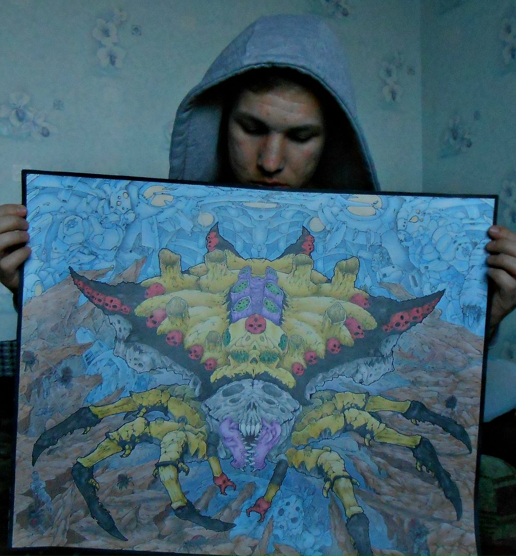 The process of work. 2-3 weeks it took me to create an entire sketch of the spider on a huge format. Then I crochet with black handles and fill the first layers of local colors with watercolor pencils, after which I finish completely the color in the color to finish the project.