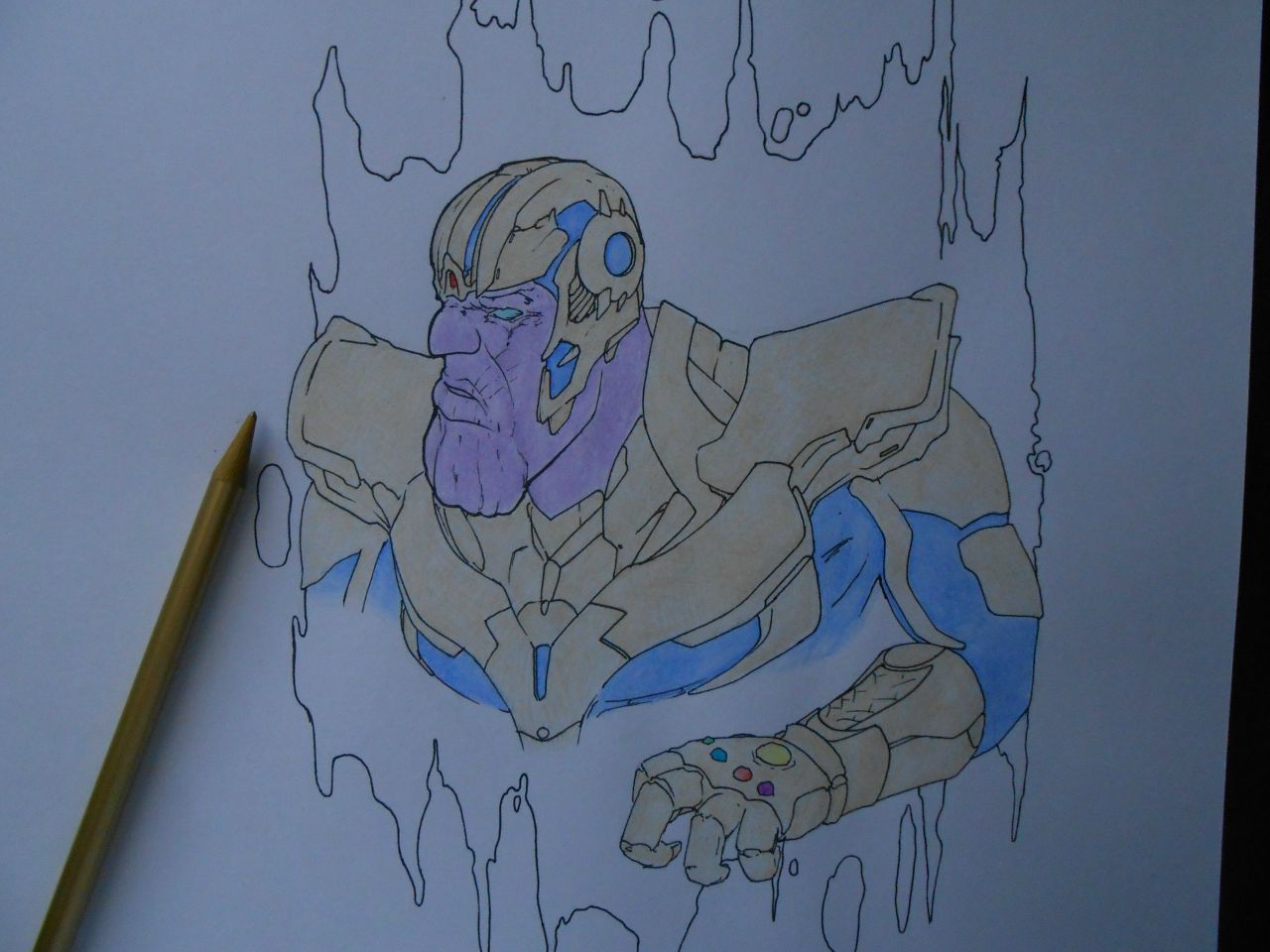 3. I apply the following colors with colored pencils, and I make the stars in space with a white pen. And Thanos is ready