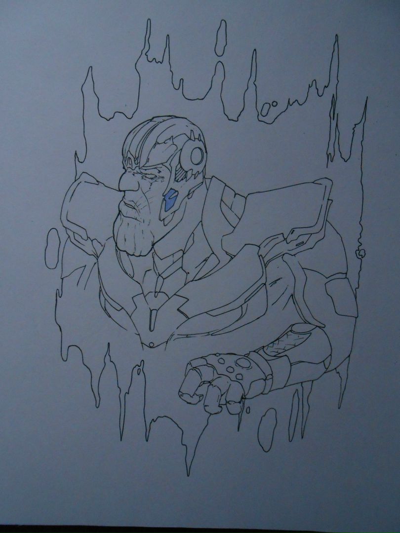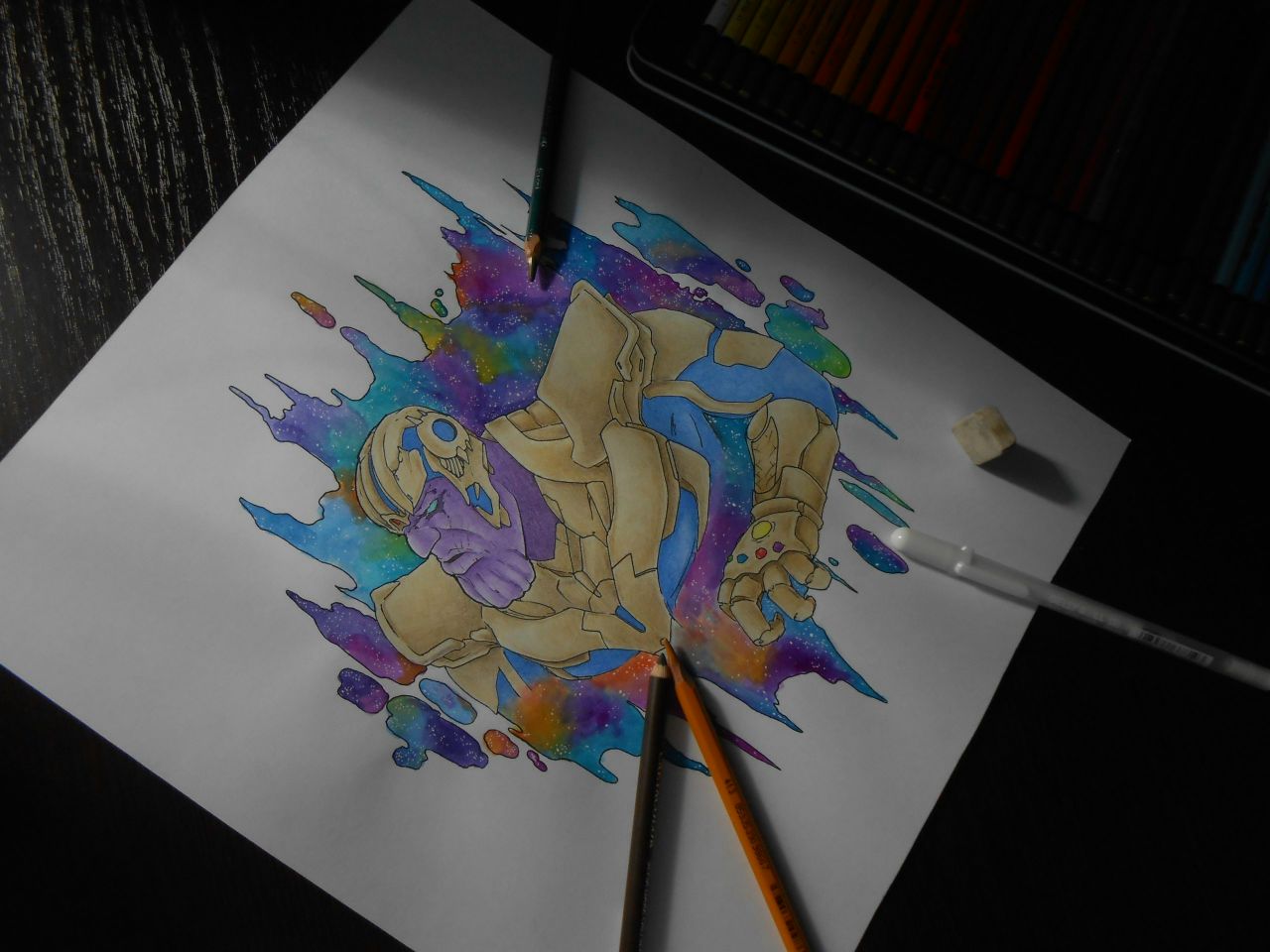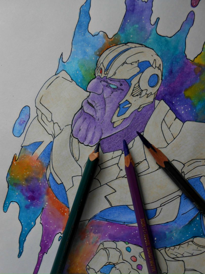 2. I put the color, watercolor on the space background, and watercolor pencils on Thanos