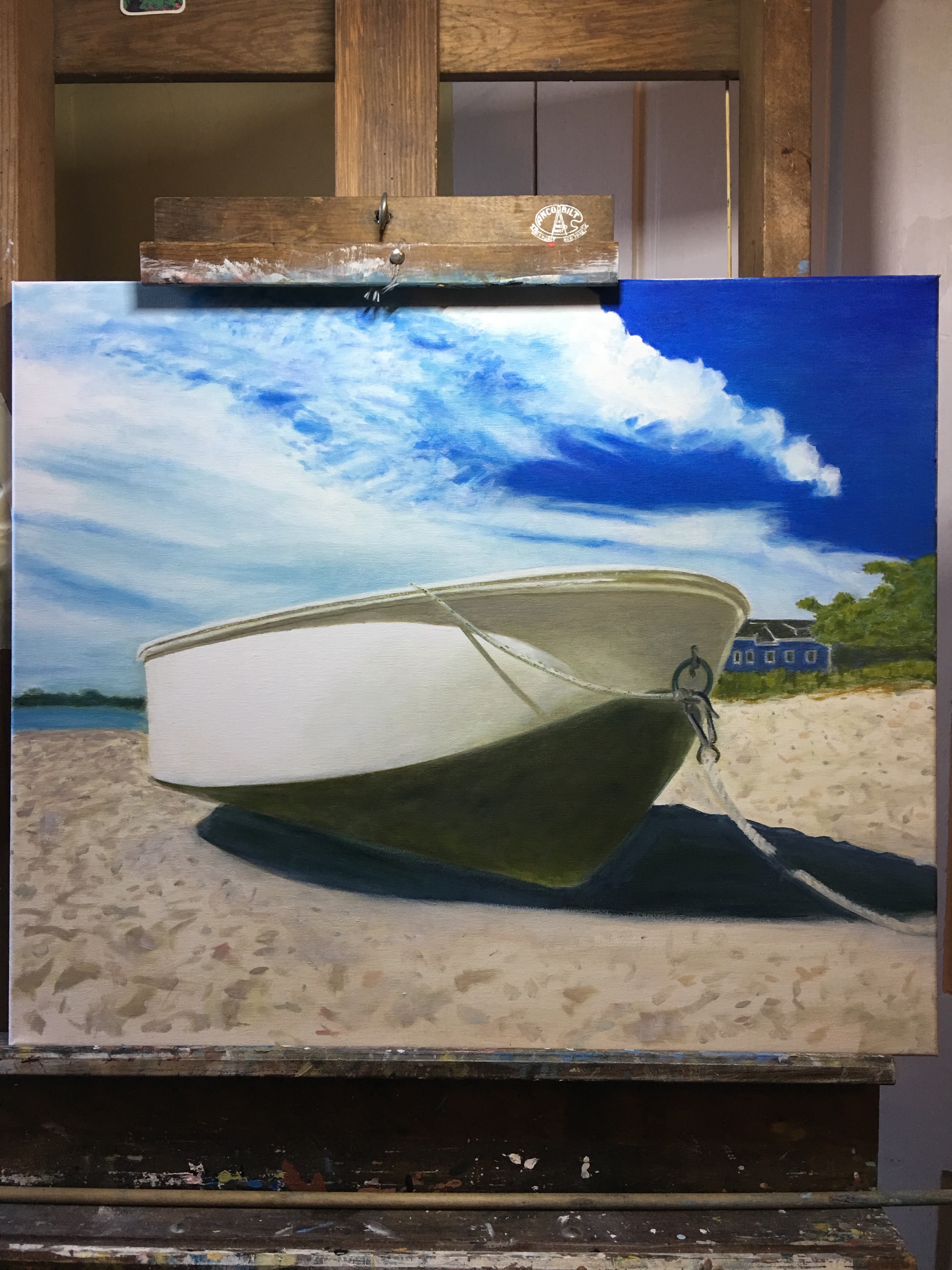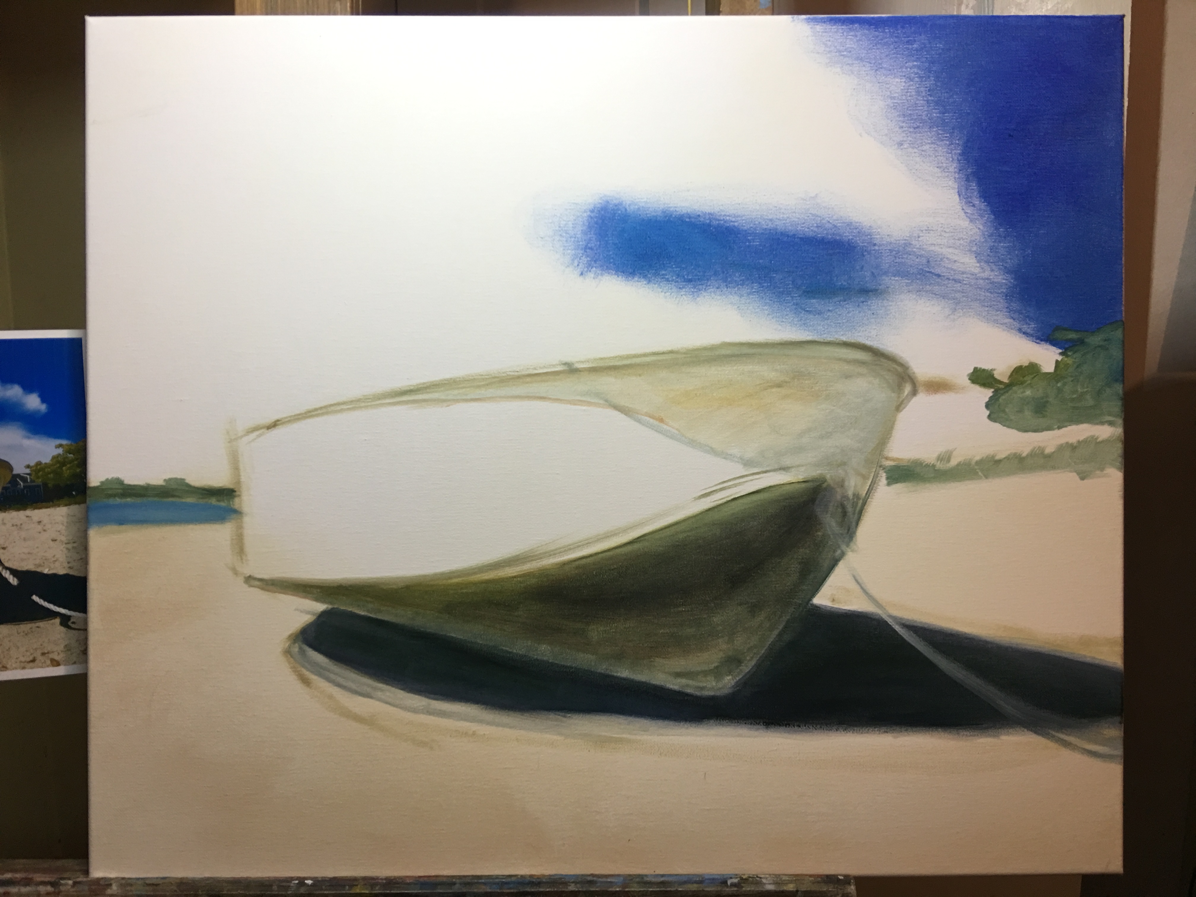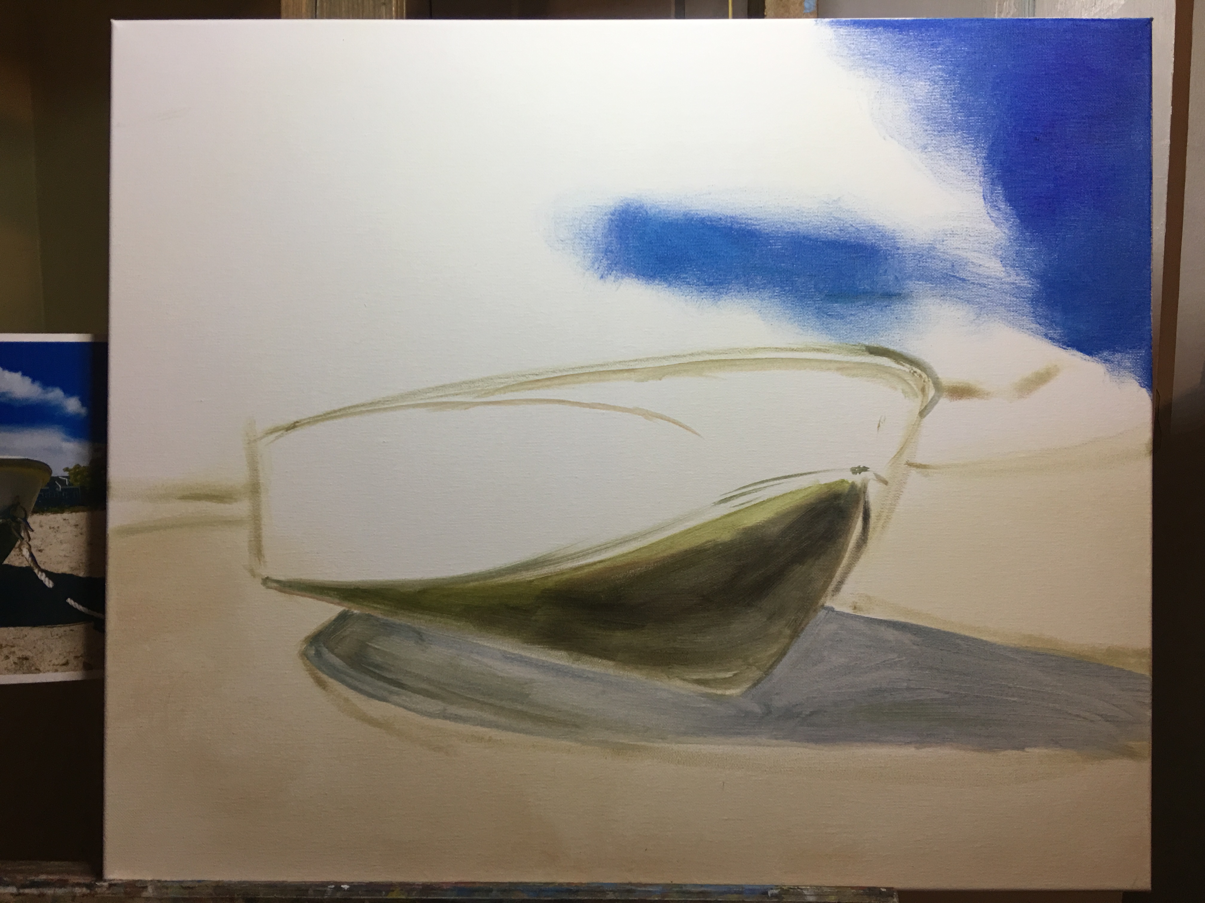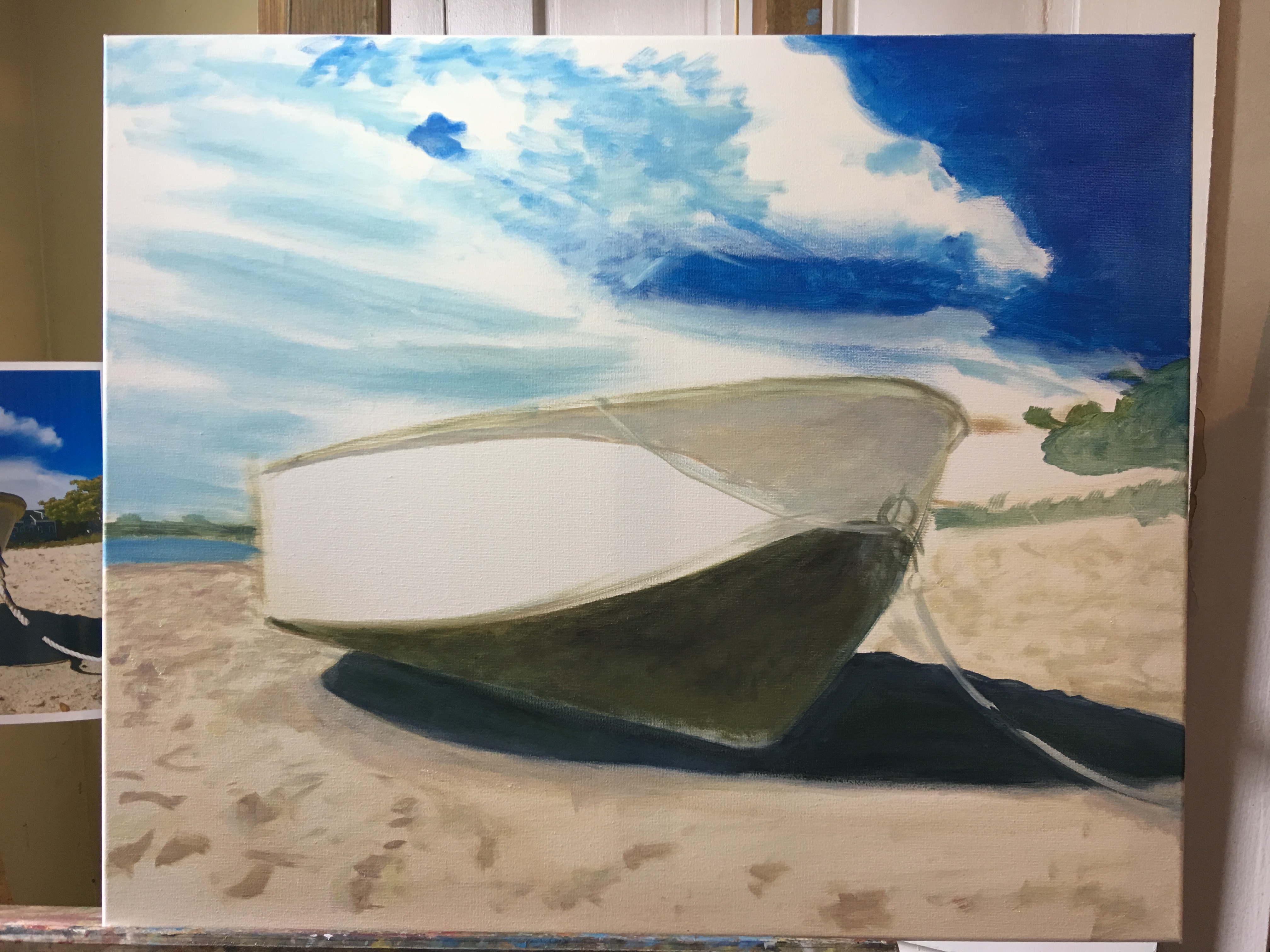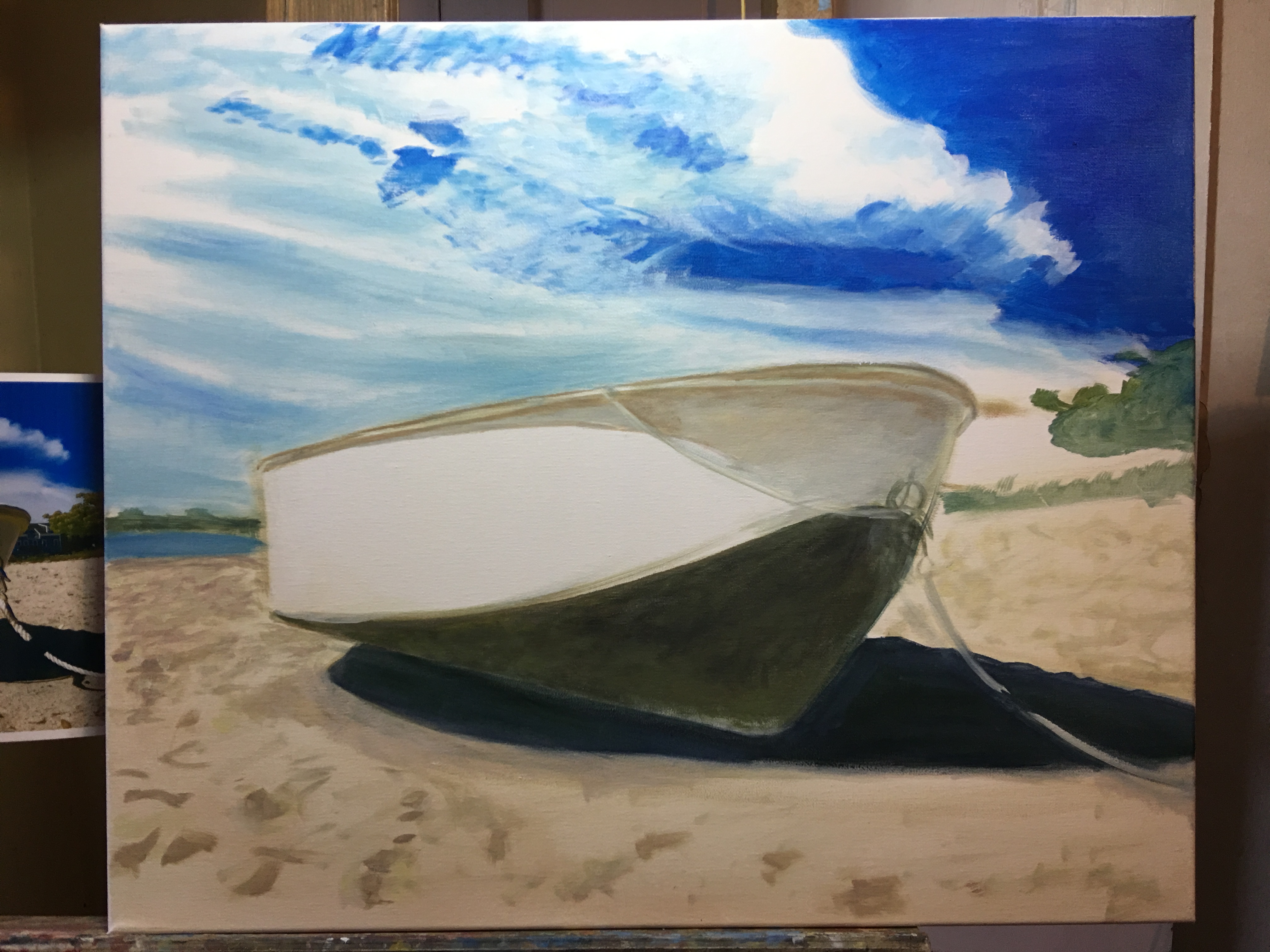 I'm really happy with how this painting turned out. I had a rough start, beginning on a used canvas (You can see the false start, here, then I decided to use a fresh canvas, untoned, and larger. I thought this would enable me to let the whites show through in both the clouds and in the boat. In fact, there are areas of the boat where I used no paint at all! I wanted the effect you would get if you were there in person, with the bright sun making you squint.