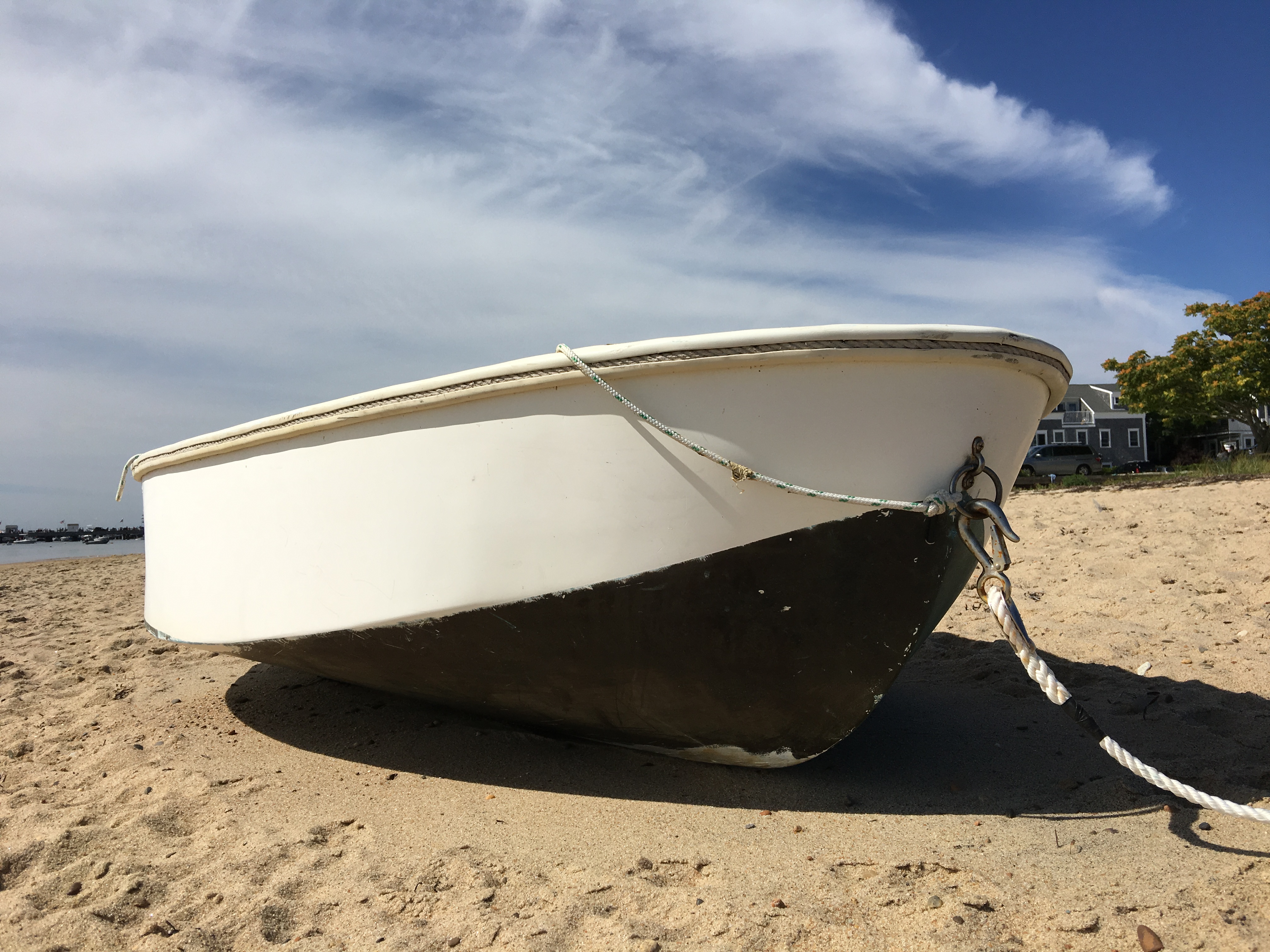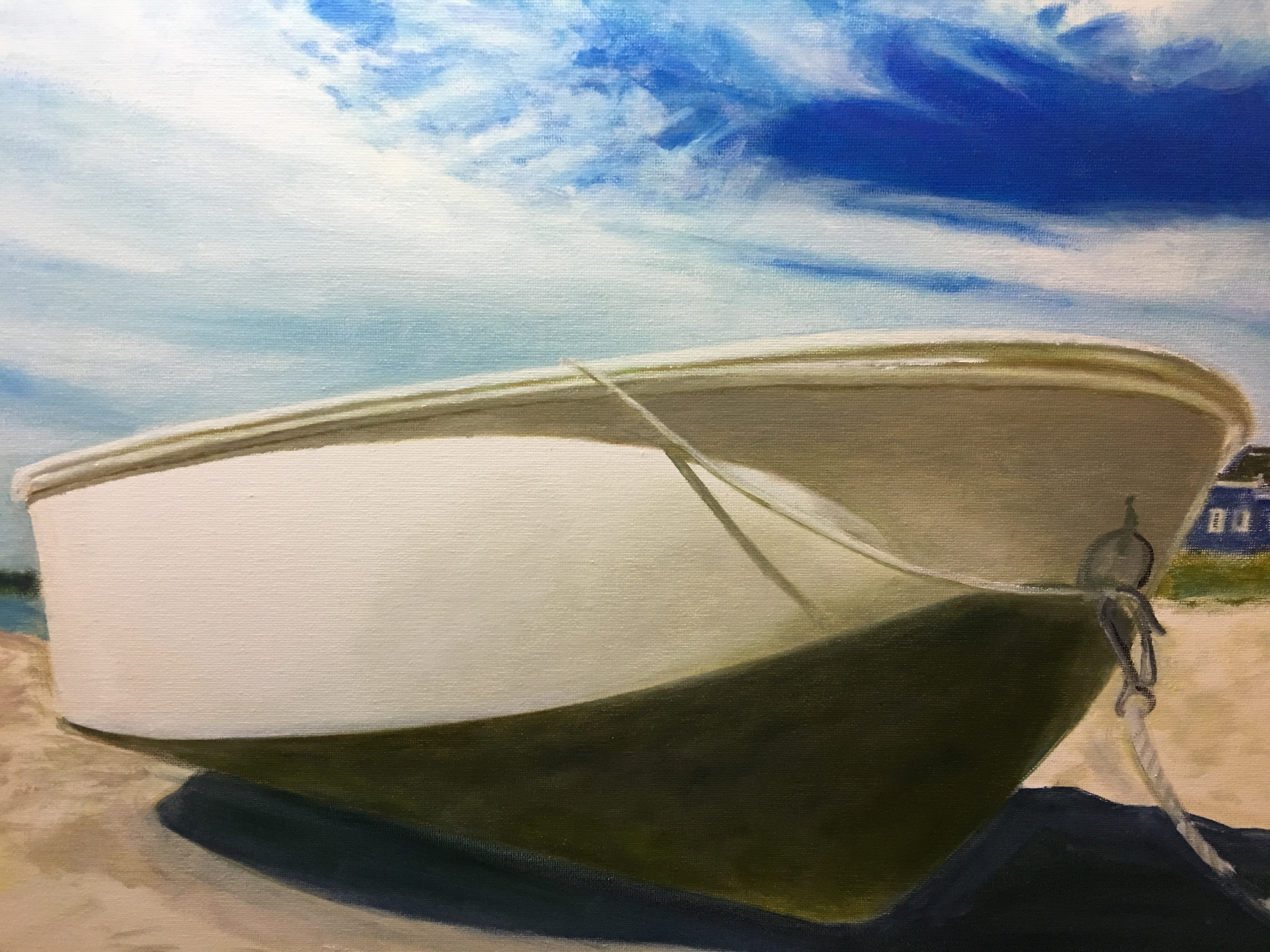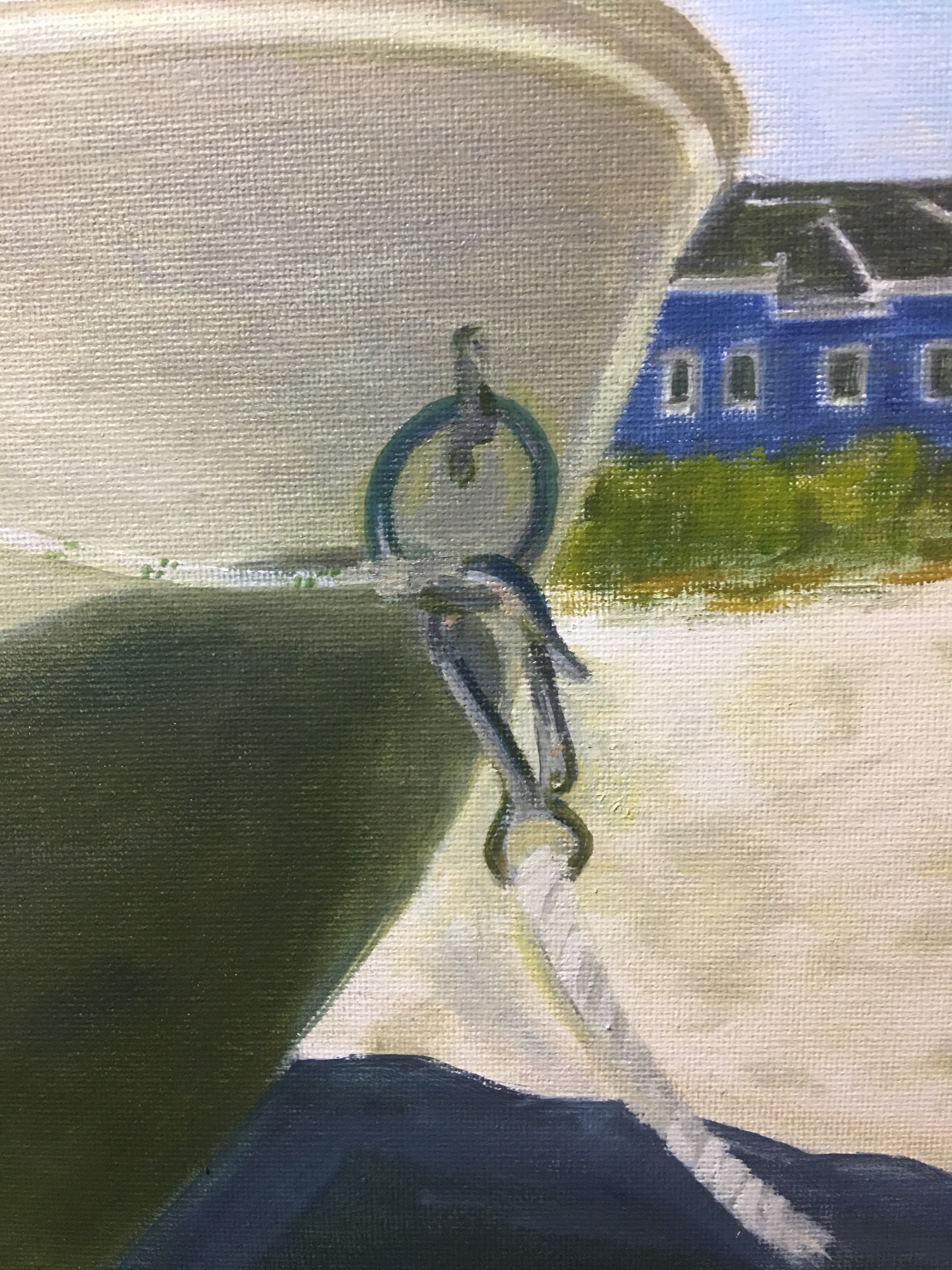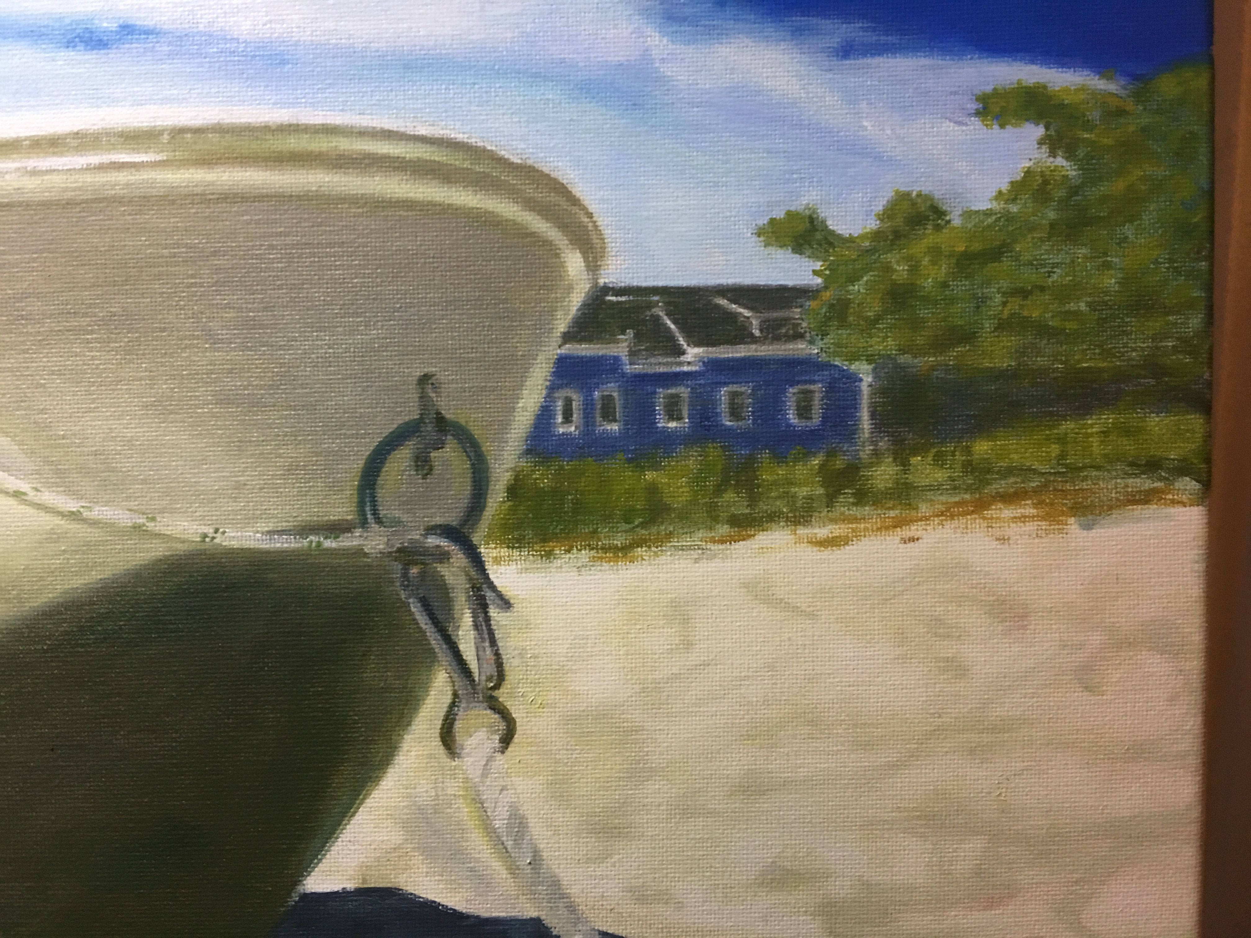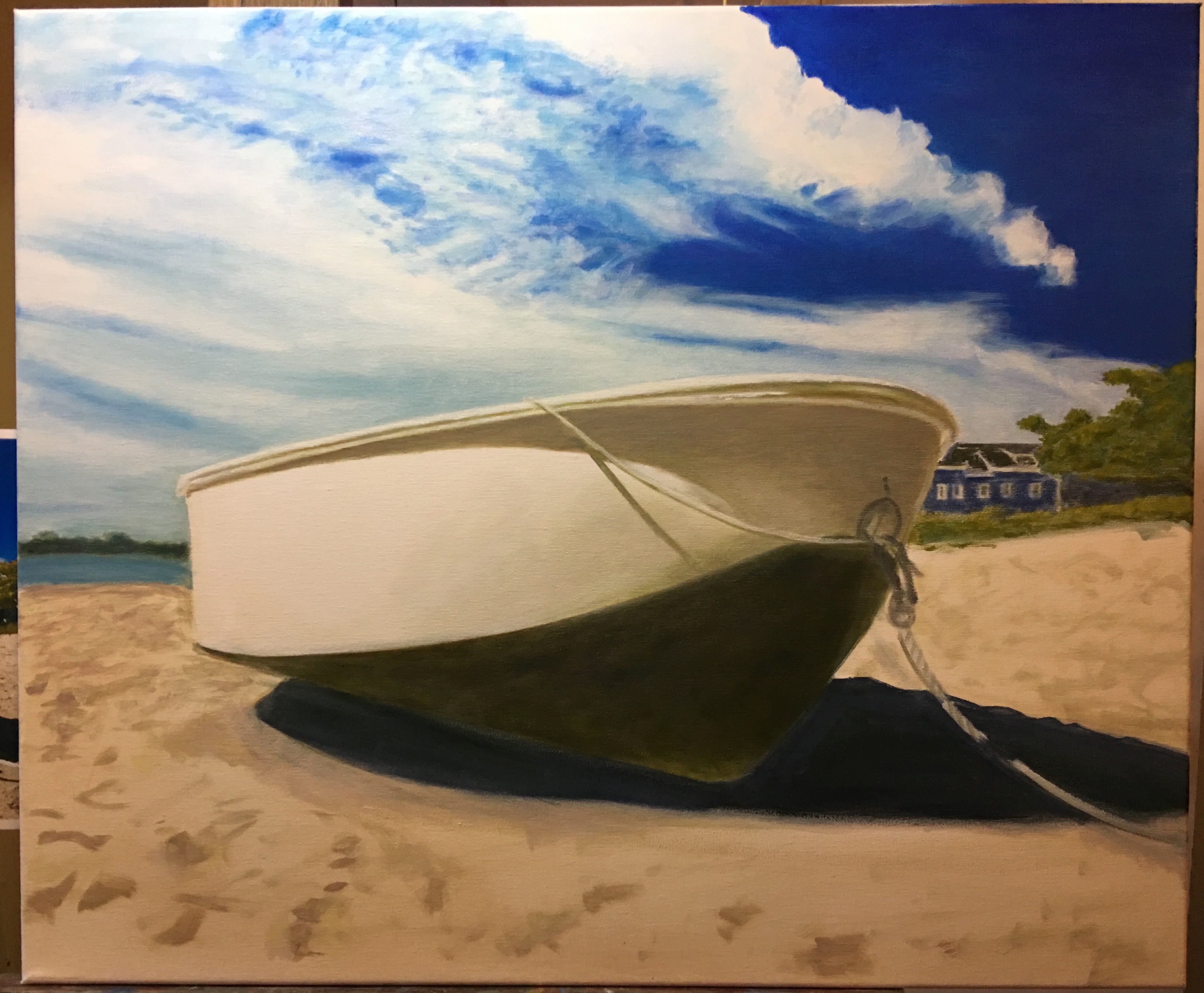 I'm really happy with how this painting turned out. I had a rough start, beginning on a used canvas (You can see the false start, here, then I decided to use a fresh canvas, untoned, and larger. I thought this would enable me to let the whites show through in both the clouds and in the boat. In fact, there are areas of the boat where I used no paint at all! I wanted the effect you would get if you were there in person, with the bright sun making you squint.