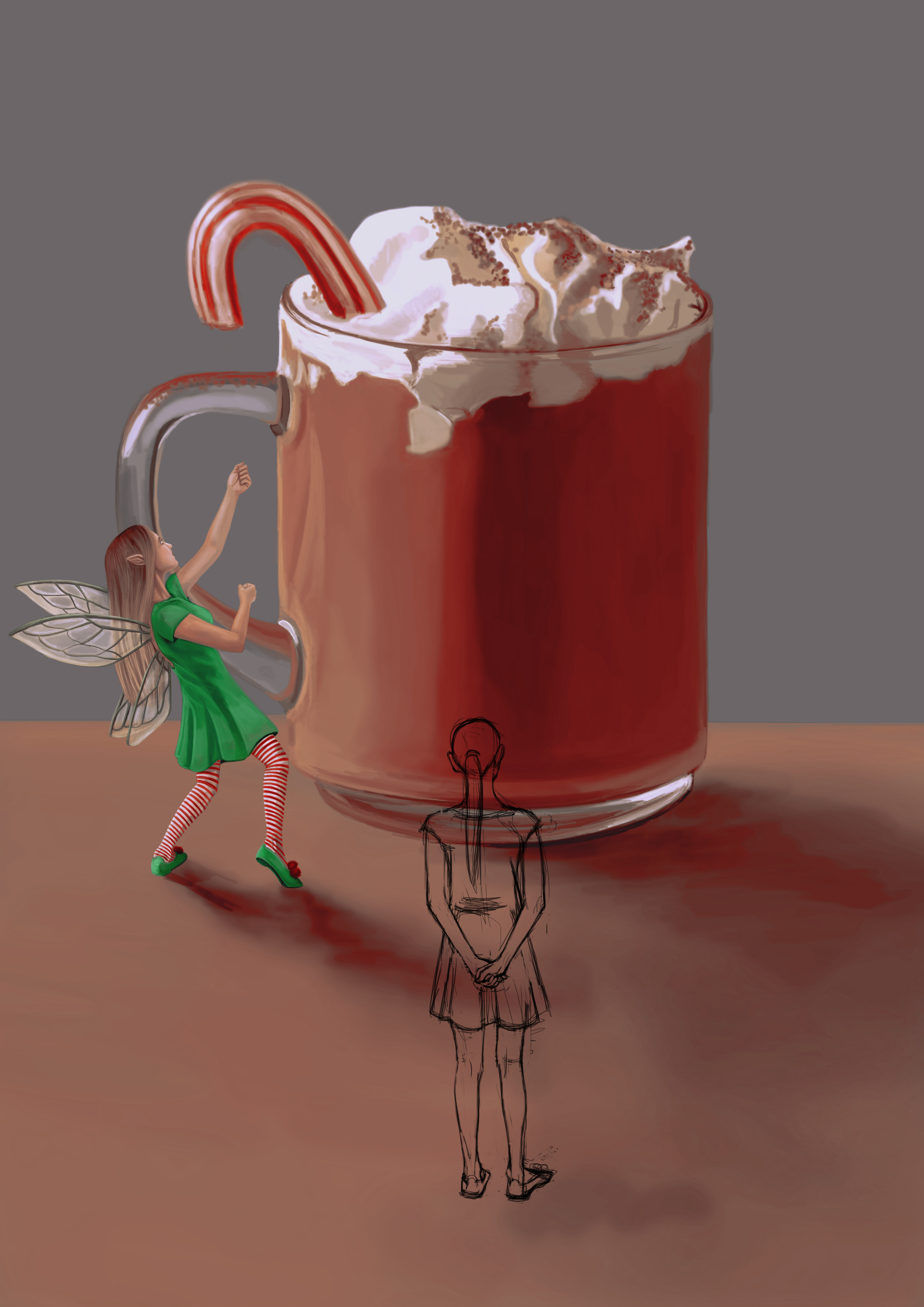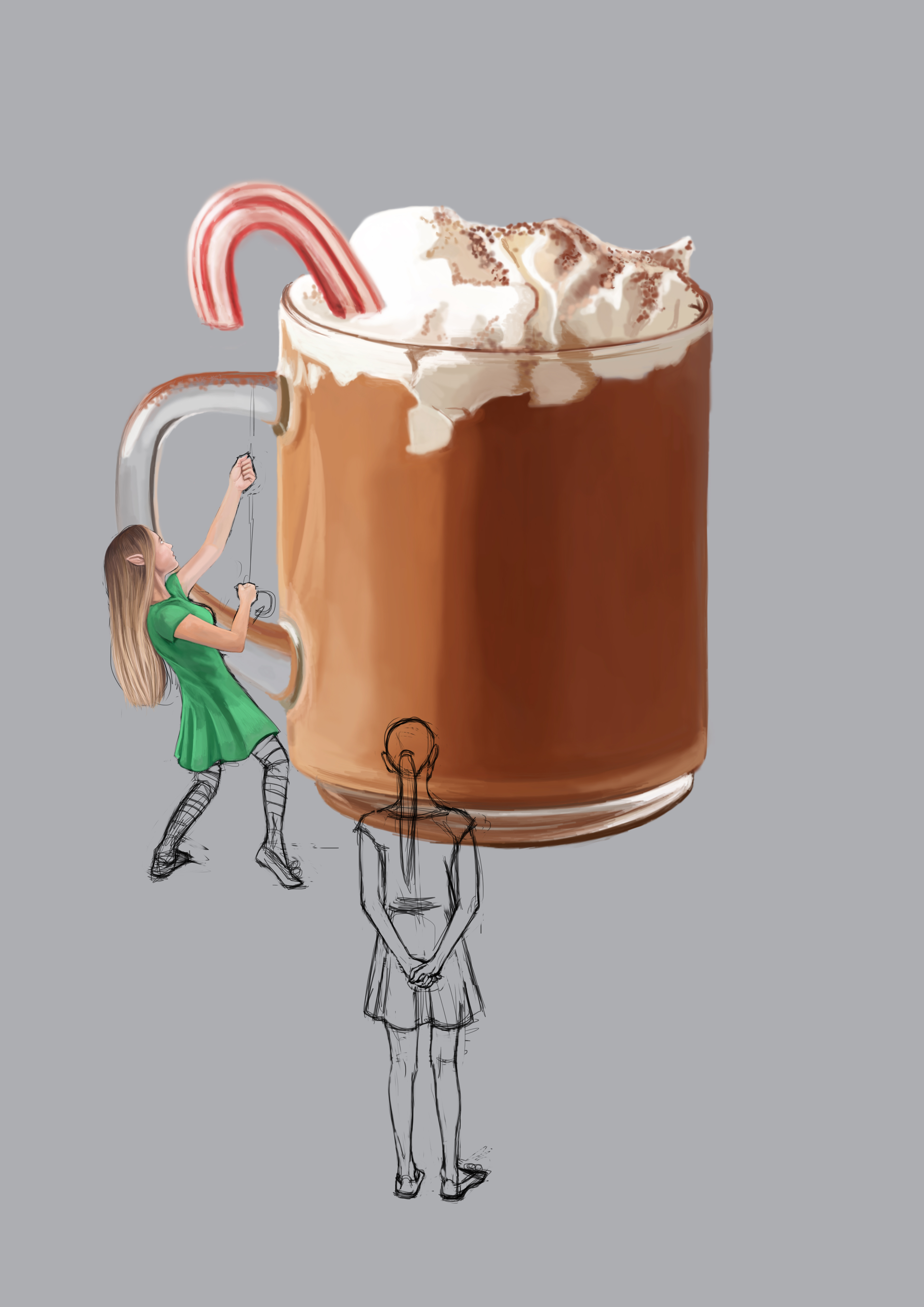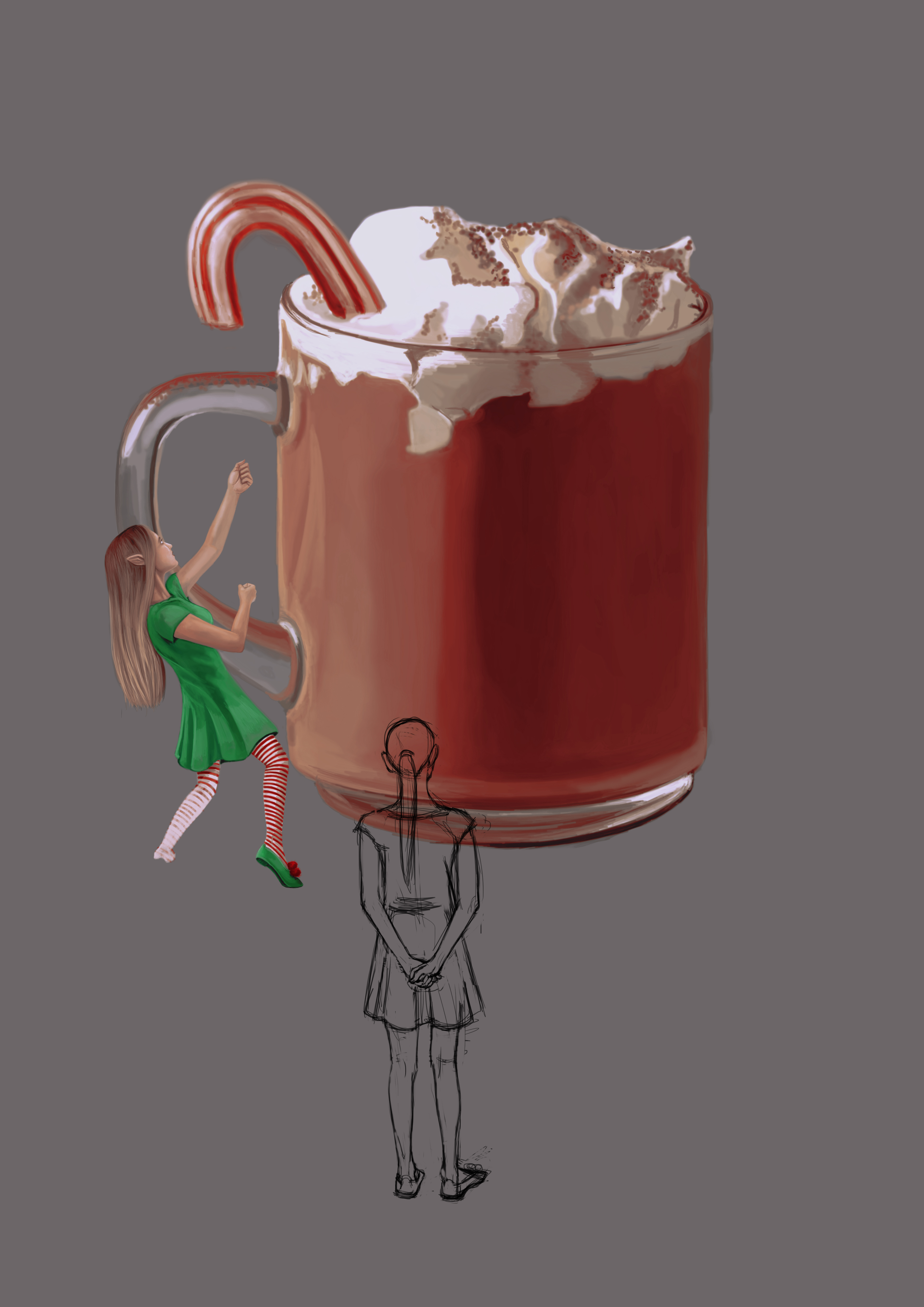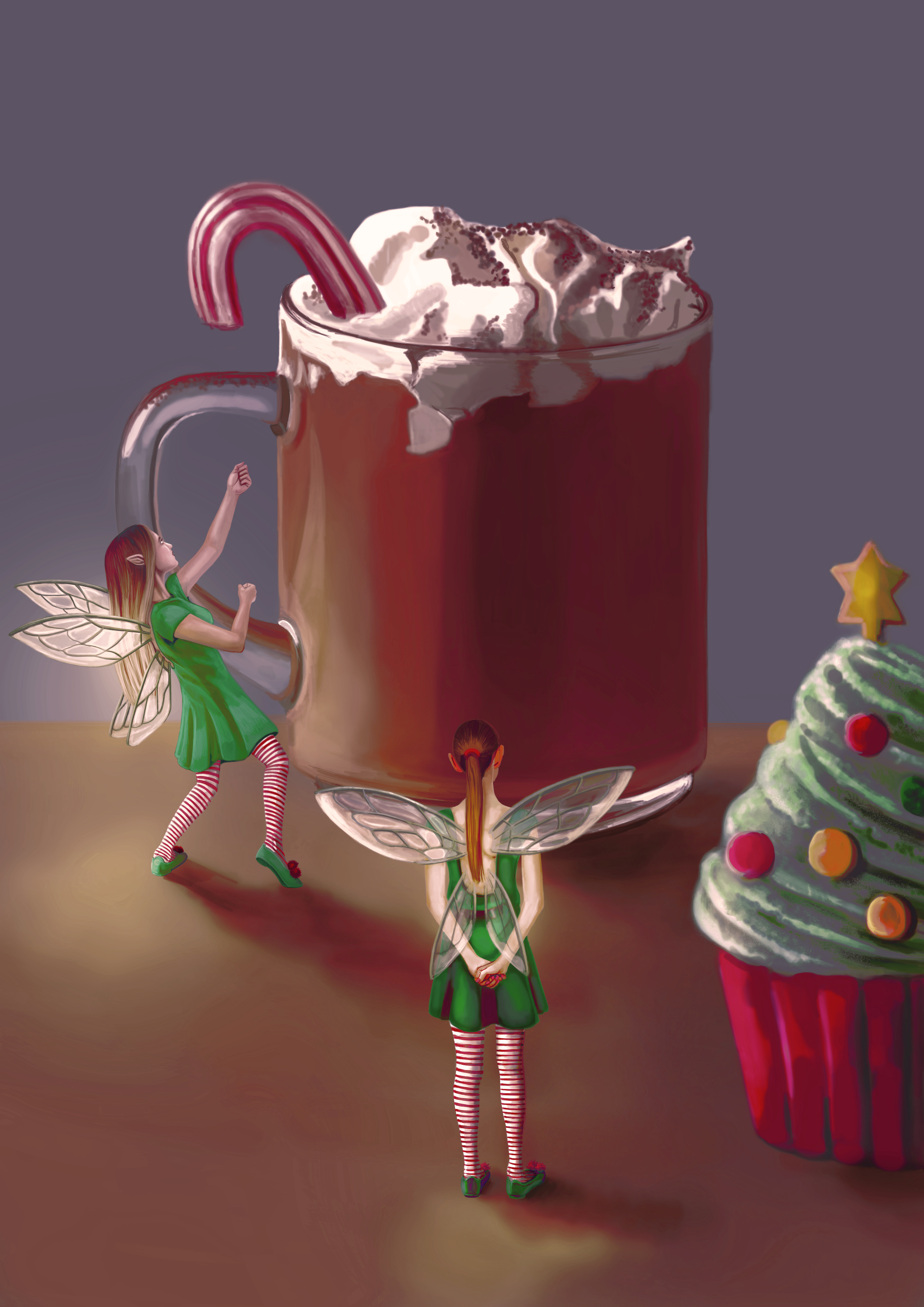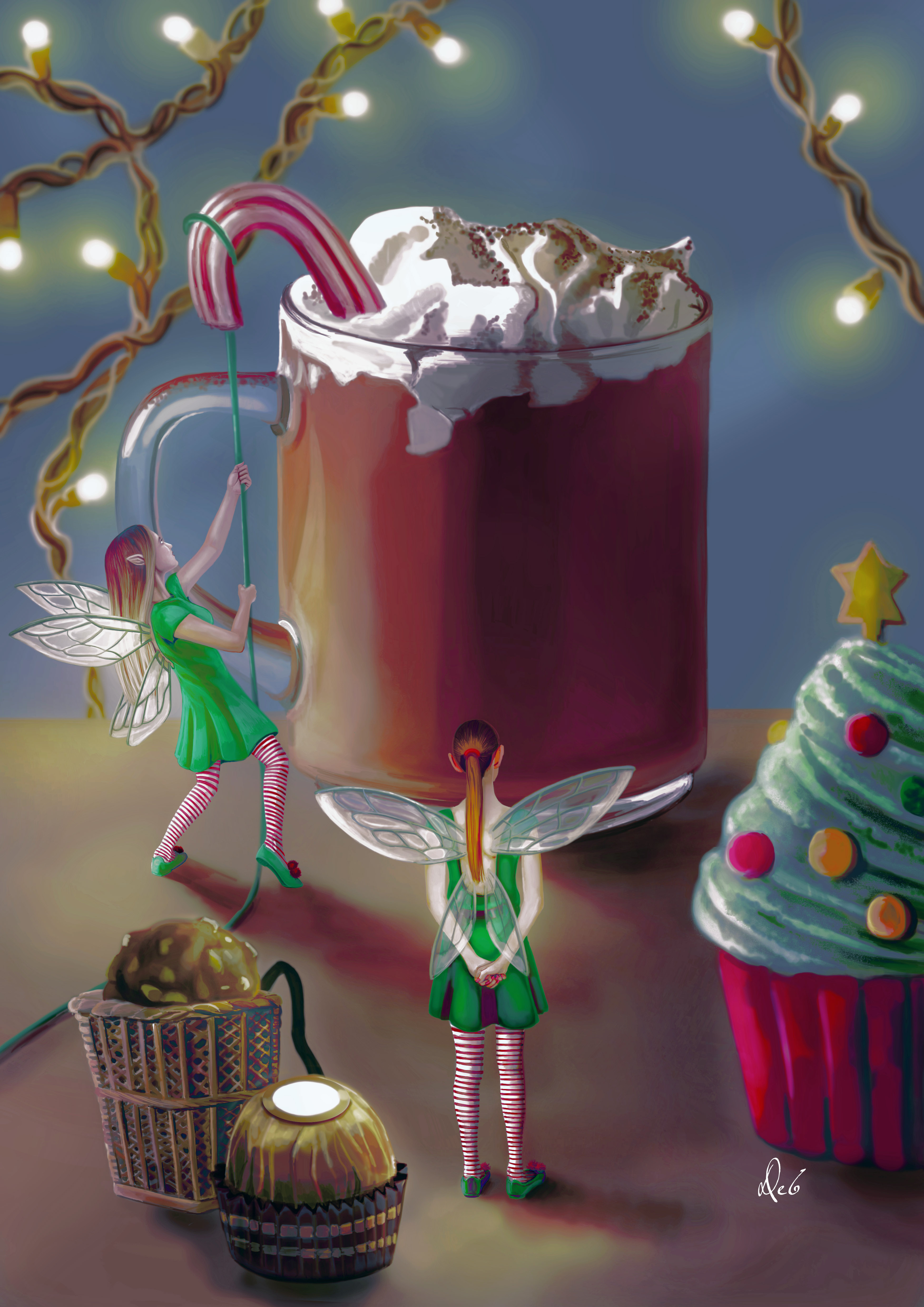 Dessin qui participe pour le Choup'défi, avec Noël en thème. Je me suis fait plaisir avec le sujet, en mettant beaucoup de sucreries qui me donne bien envie! (miam 🍪). Oui! la nourriture a été ma principale source d'inspiration, c'est ce qui fait pétiller mes yeux, et me redonne une âme d'enfant.