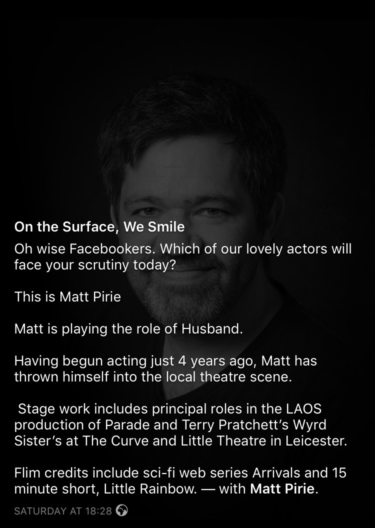 Introducing Actor Matt Pirie - On the Surface we Smilediddywheldon (51)in #art • 8 years ago Tickets are available now at meltontheatre.co.uk or williamscreatives.co.uk. Like us on Facebook @OTSWS Like us on Twitter @OTSWSPLAY Thank you for your time ! Peace, Love, Life, Light and Laughter Diddy x #creative #acting #play #crypto