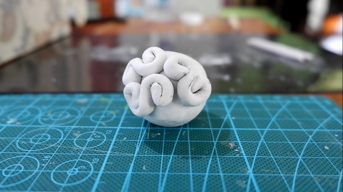 Now mold or roll the strips to create a twirly "S" figure which we can be seen as the characteristics of the Gomu Gomu No mi. After doing that stick it into the ball we created earlier, oh if you're wondering how does it stick you can mix the paper clay in some few drops of water and this can be used like an adhesive without ruining the figure.
