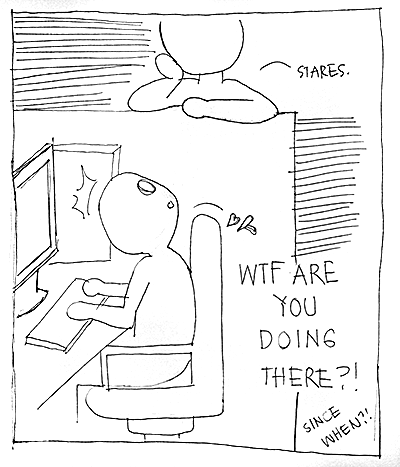 I felt the sudden impulse to look beside me. And to my surprise, A was there. A hand under his chin, he was looking down at me and the craziness I was doing.
