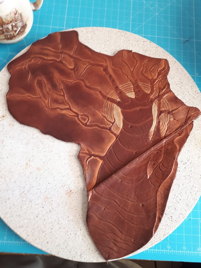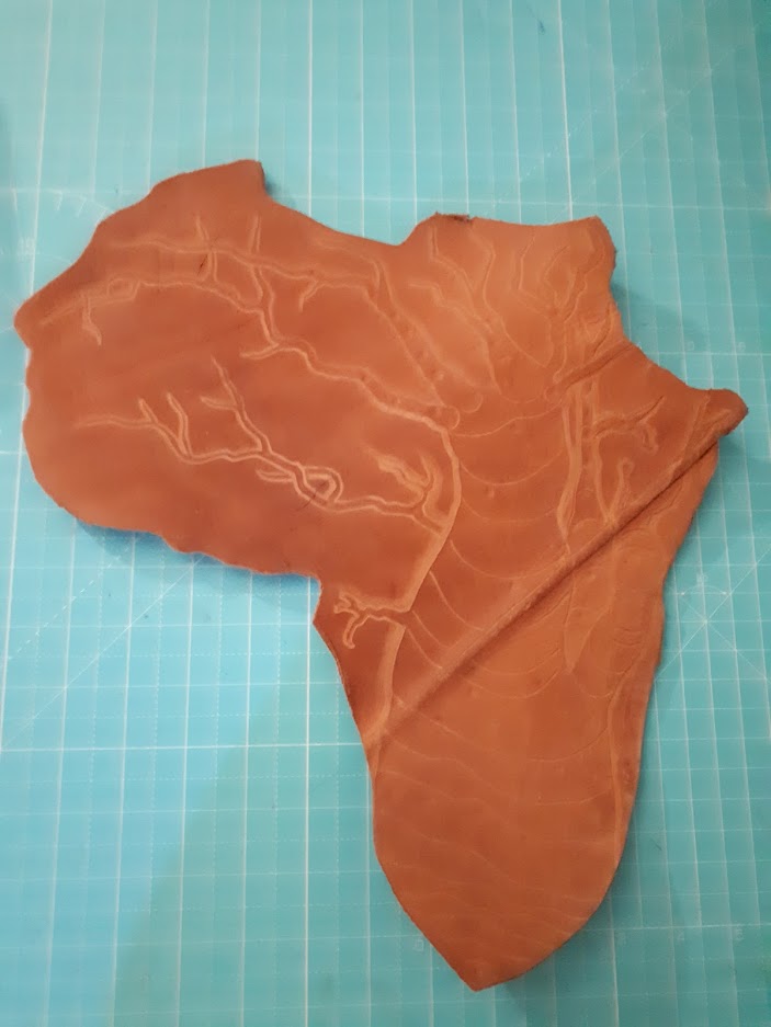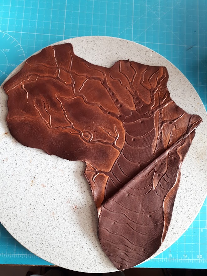 I found a scrap of leather, in a factories cast off's, that were given me as a kind gesture as I had been struggling financially for some time. This was an imperfect piece that was for the chuck-it bucket, due to the fold and the scratches. Therein I found, was a clear outline of the African Continent. I am not sure why, but I chose the engrave a baobab tree thereon. I do love the majesty of these great trees and it somehow just fit the narrative.