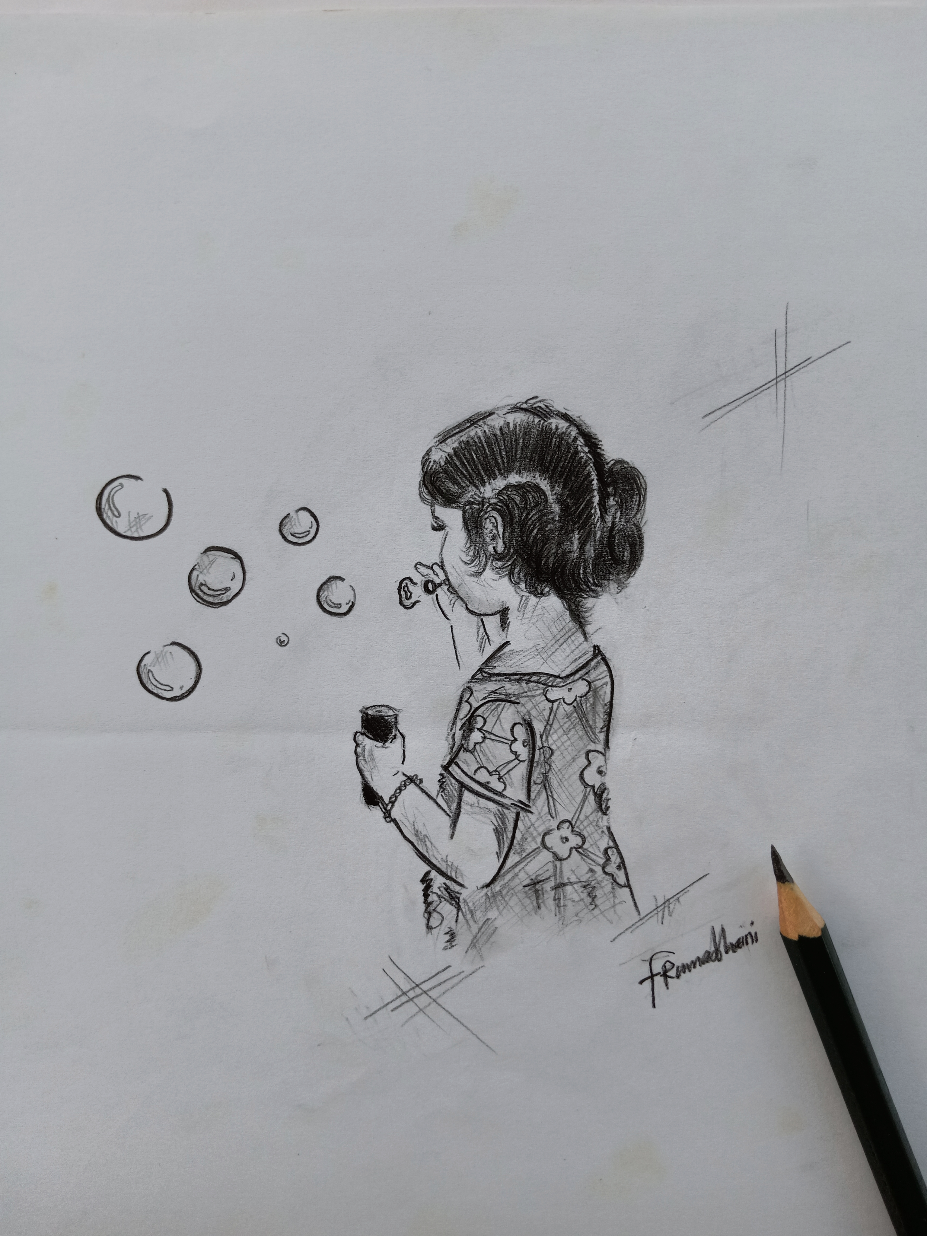 I really like seeing little girls, every day I see them playing in front of my house and they are very happy. And, in this post I will make a simple sketch of a little girl blowing up a soap balloon. I hope you like my sketch.