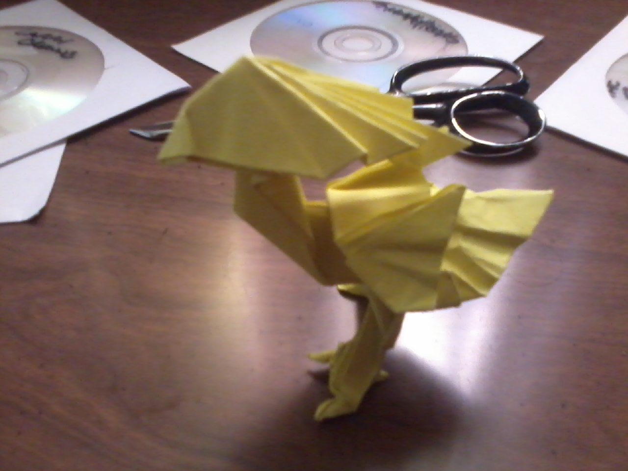 This is the "Chocobo" by Satoshi Kamiya. What really got me into origami was the fact that it was 3d art. You could hold and feel its weight. Every attempt at a model is different. This was the first "moderate" difficult model I made. It is 60 steps and I've come to the point of making it through memory. This first picture is the same model under a black light.