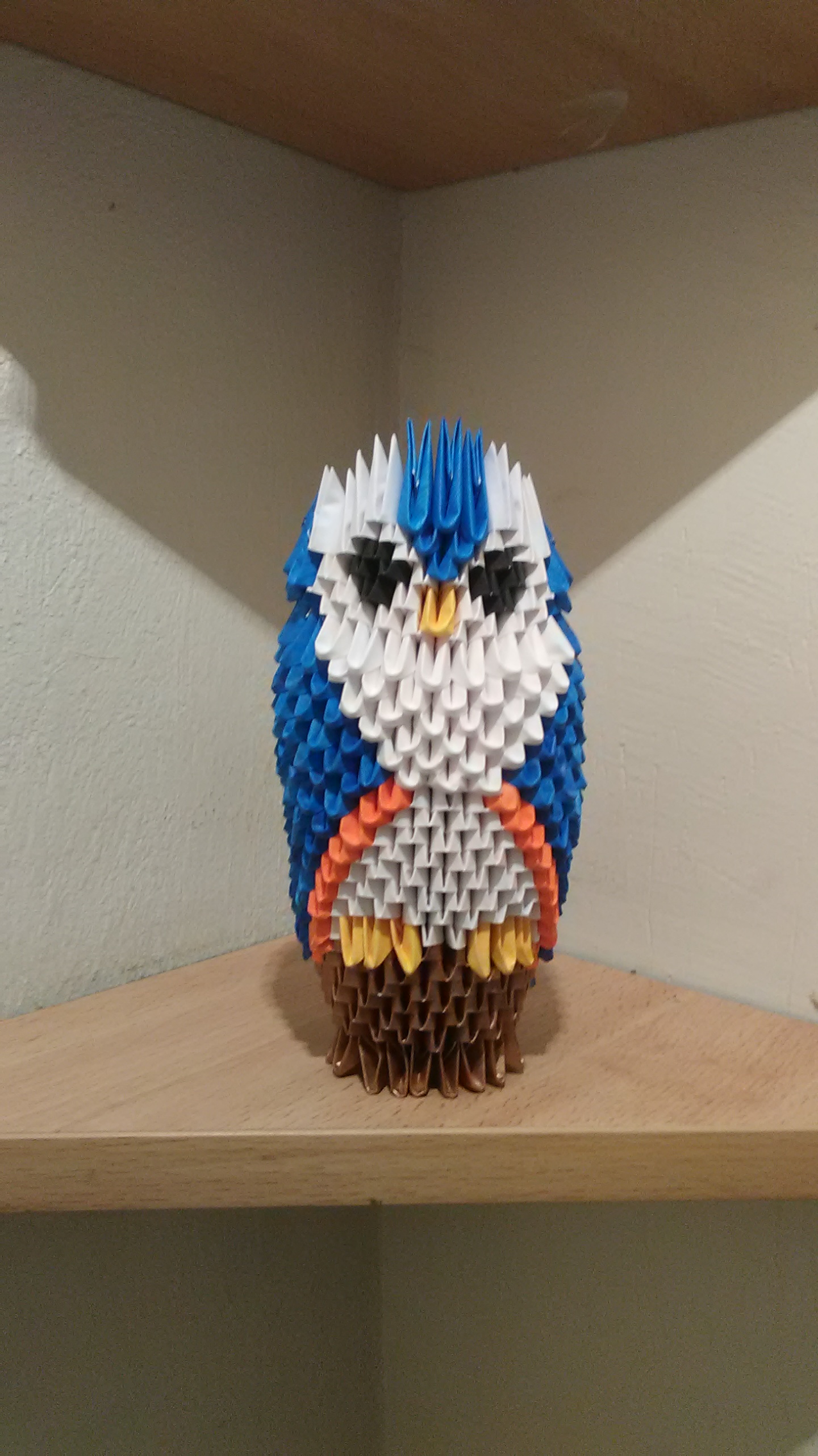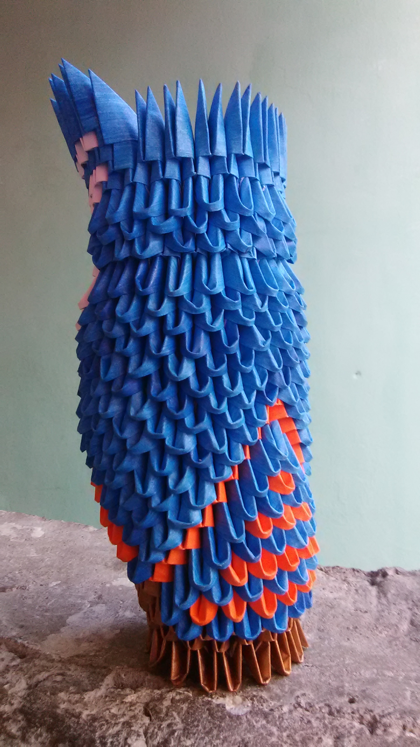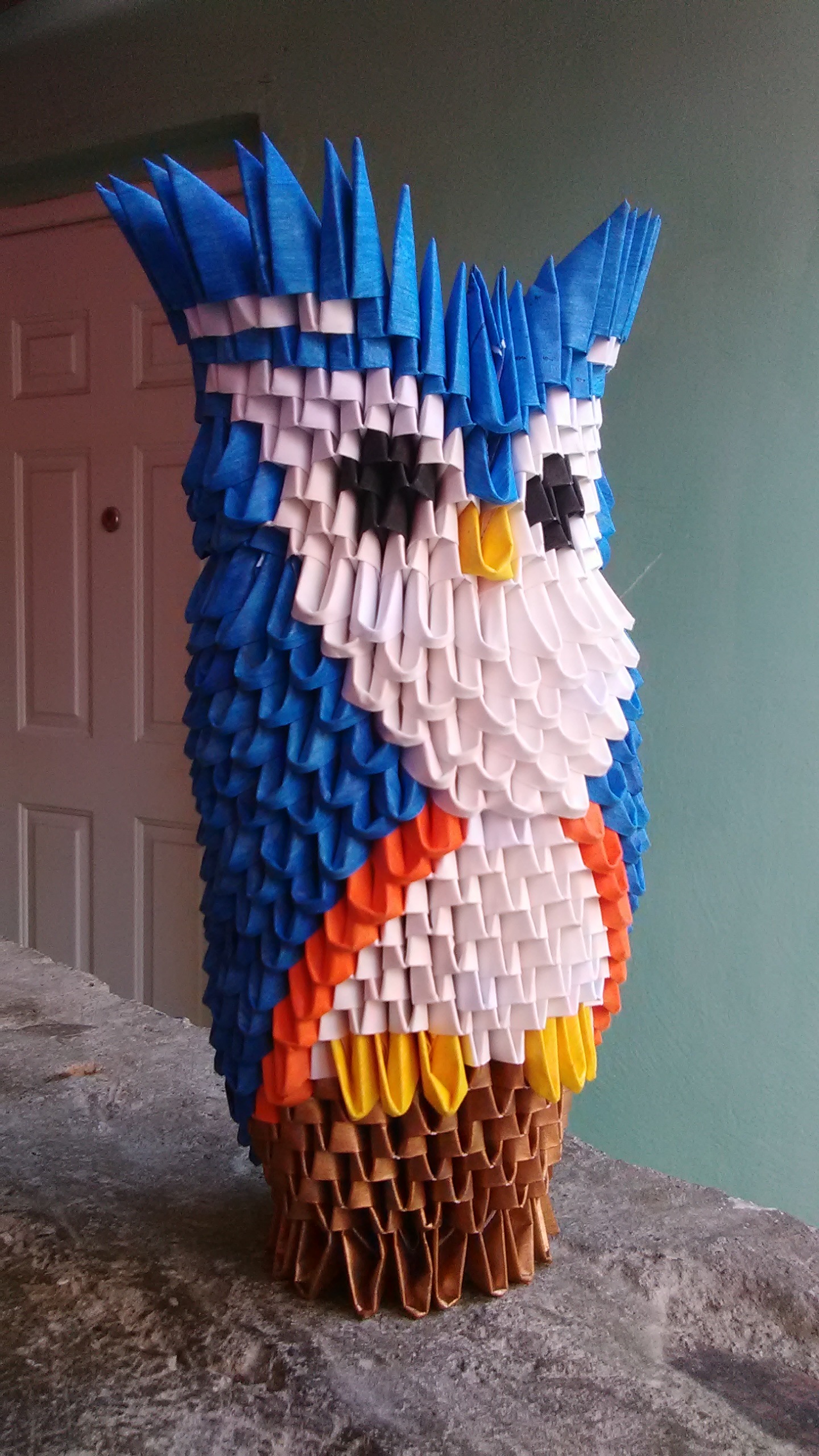 Este modelo de búho normalmente es en rojo, pero a mi me gusto mas como se veía en azul y así lo hice ñ-ñ. Dure 4 dias haciéndolo ya que consta mas de 650 piezas y se me acababan los materiales a cada rato, para la próxima estaré mas preparado (Espero...)