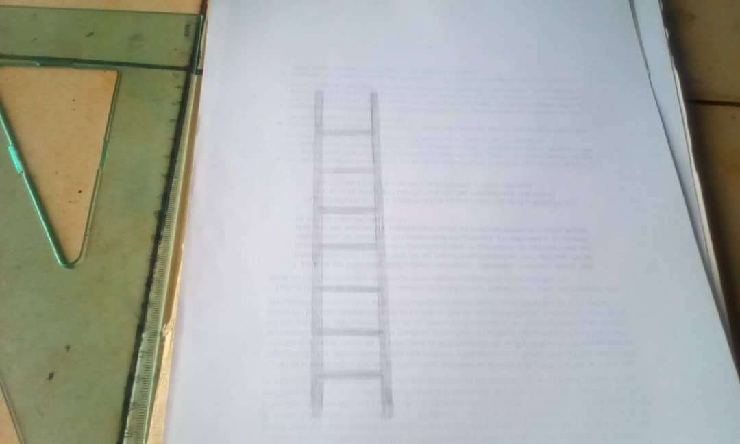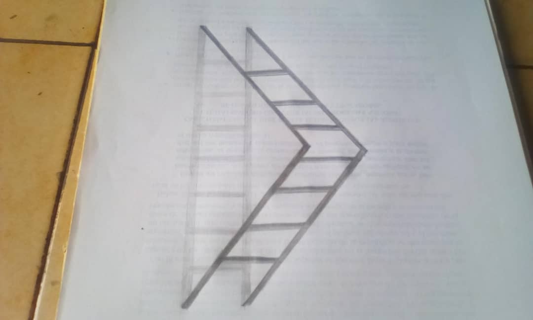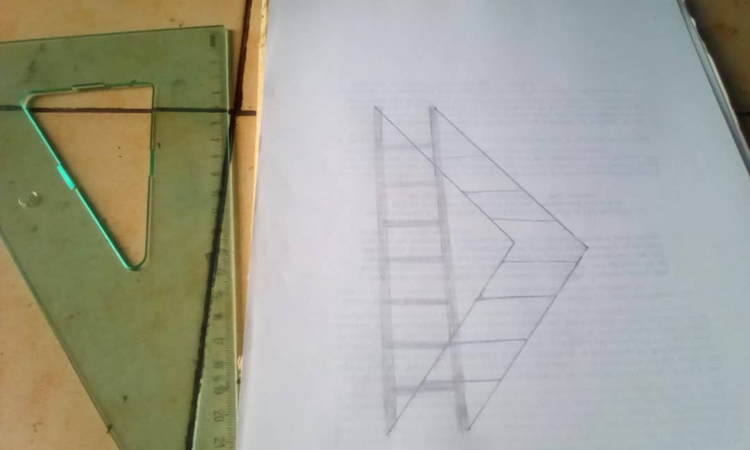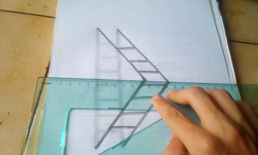 PASO 3: Lo siguiente que harás es dibujar la verdadera escalera con un lápiz oscuro, de forma triangular como lo vez en la imagen. Debes tratar de que las patas superiores e inferiores de la escalera concuerden con la sombra.