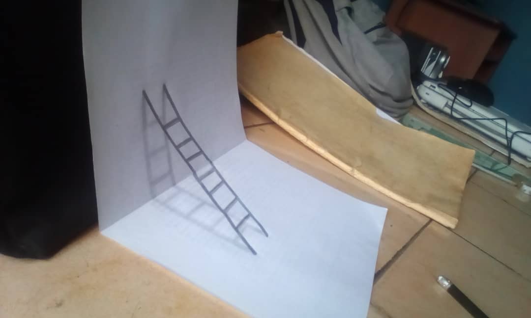 Luego para darle la perspectiva final, debes tomar una foto desde el lado donde se vea la escalera puesta en la hoja con su sombra para darle ese efecto como si estuviera sobre la hoja.