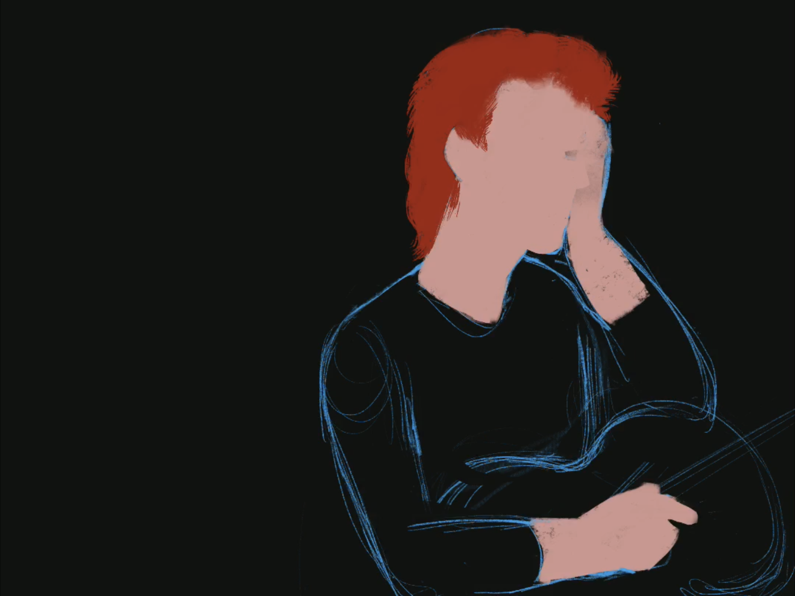 First repeated step 2 and 3 in the shirt and guitar. Kept voluminizing the hair, added more solid lines.
