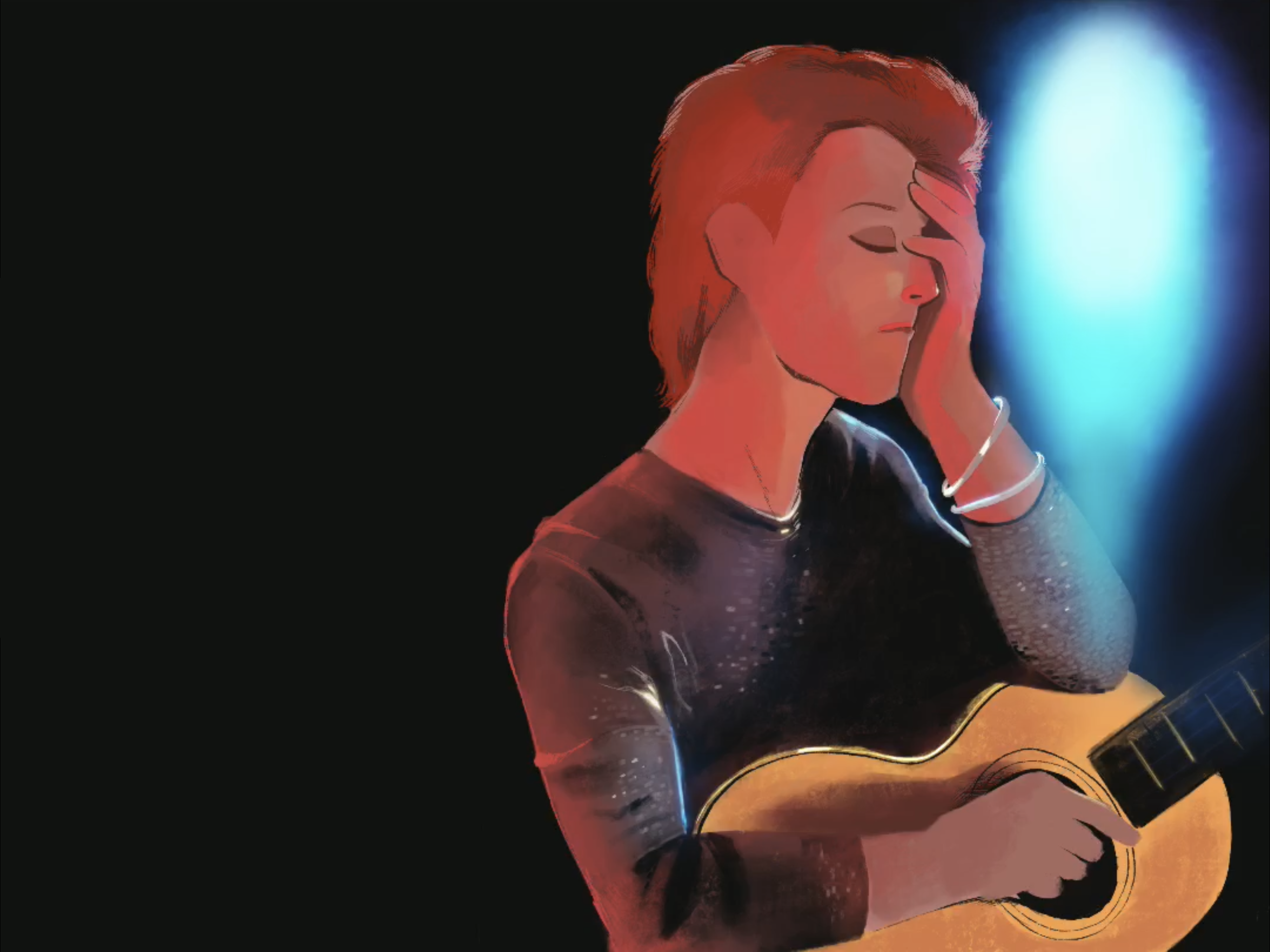 Repeated colorization as stated in step 3 for the shirt and guitar, then added lightning and a Space Oddity Lettering as a final touch.