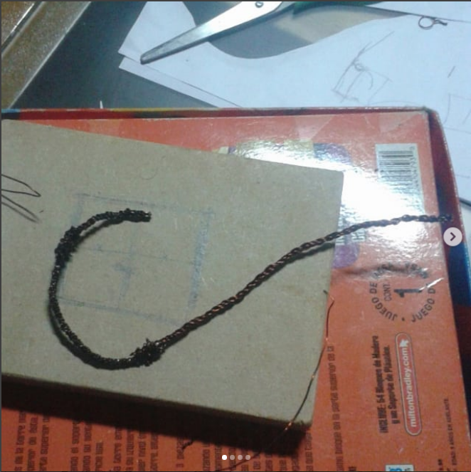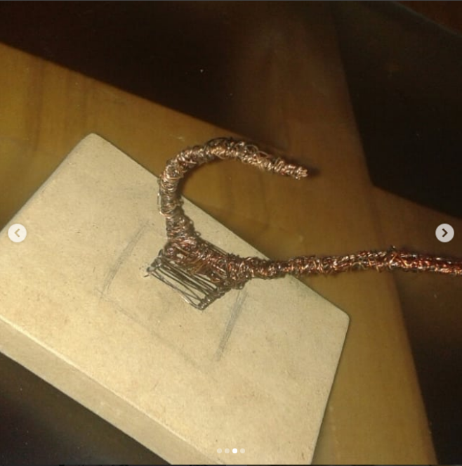 Luego fui dándole cuerpo al mismo esqueleto y agregando detalles con el cobre, una base de madera y fijándola