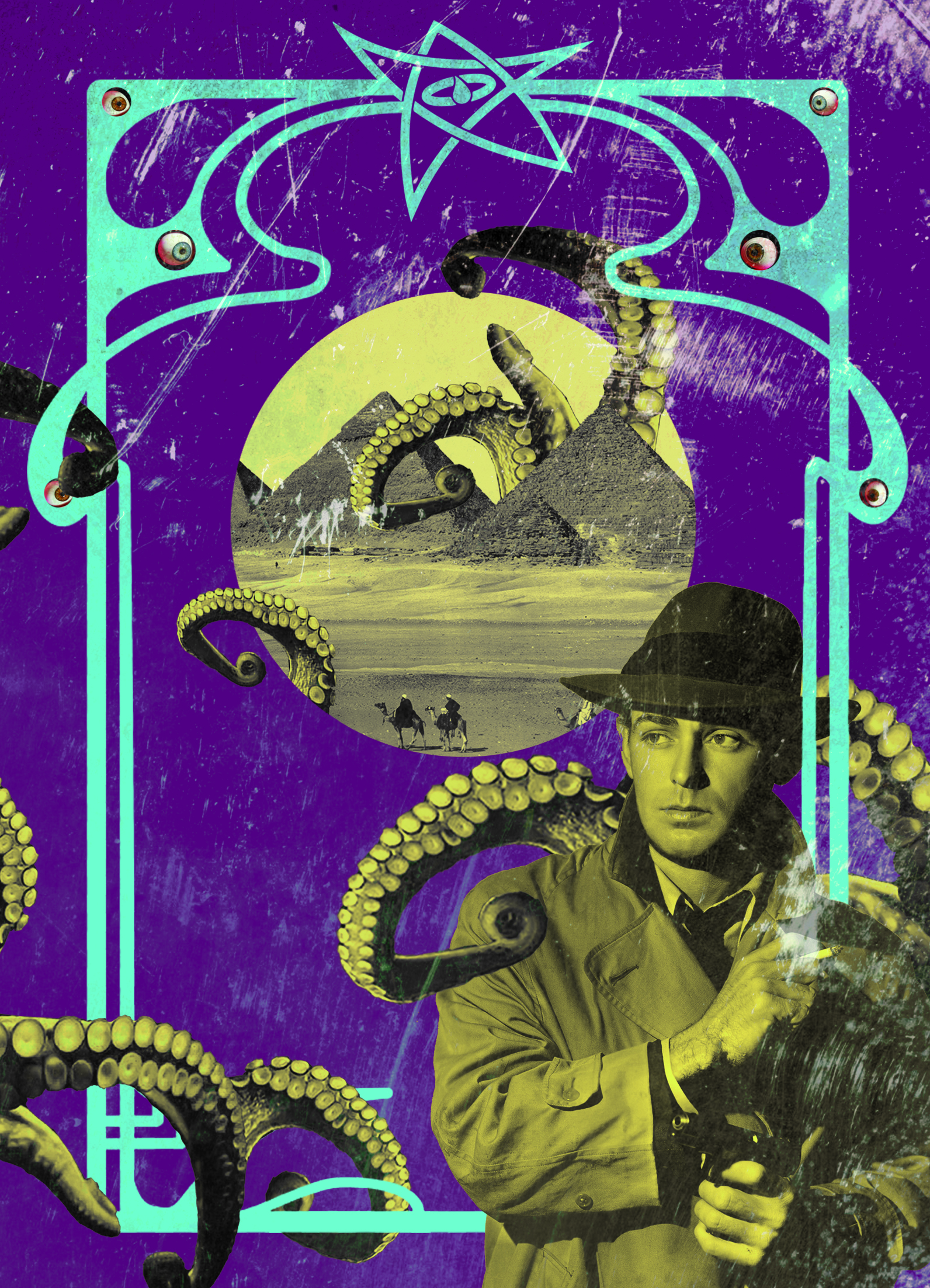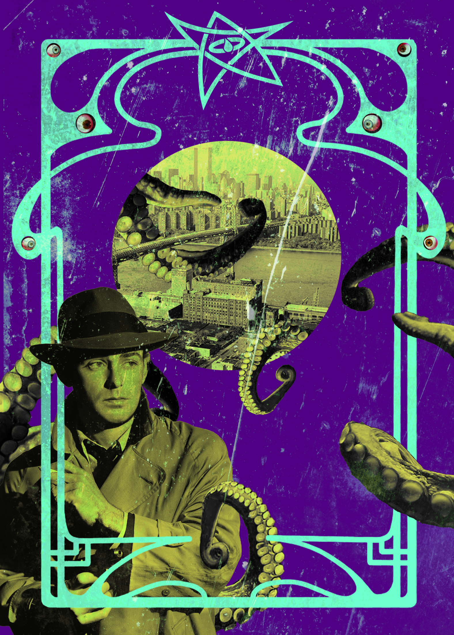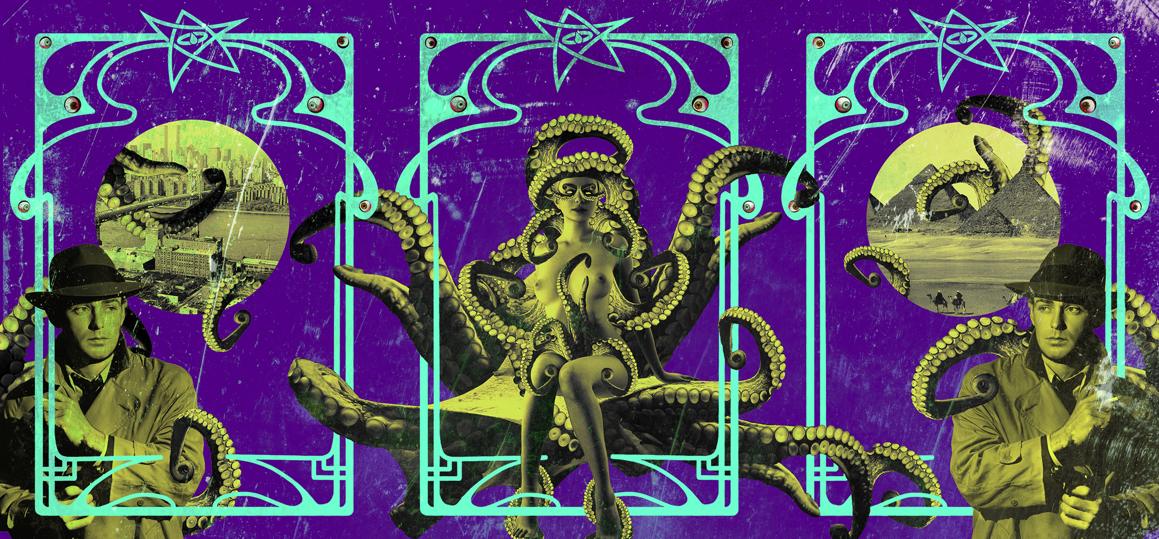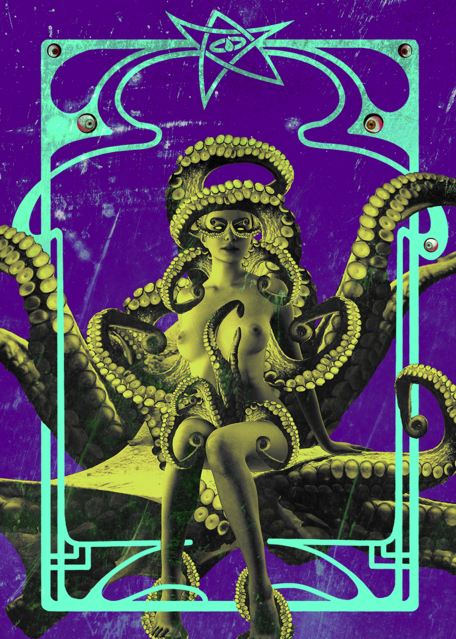 I admit that i am not feeling very creative these days and so i used a part of an old digital artwork as a central theme and try to work around it adding more features and little themes. It would be a 3 fold screen and so i had to divide the artwork in three parts. I found a nice art nouveau frame and combined with the Elder Sign to make it more occult looking at used to create the different pages. The central theme is the tentacle girl, or Cthulhu's bride, and for the sides i found and used a vintage photo from an old detective movie. For the two windows i found a an old photo of New york and one from the Pyramids and of course a lot of tentacles all around. I used a black and white yellowish colour to unify all the different elements and create and nice contrast with the purple background and last but not least a filter with scratches to make the artwork look old and worn out from time and decay.