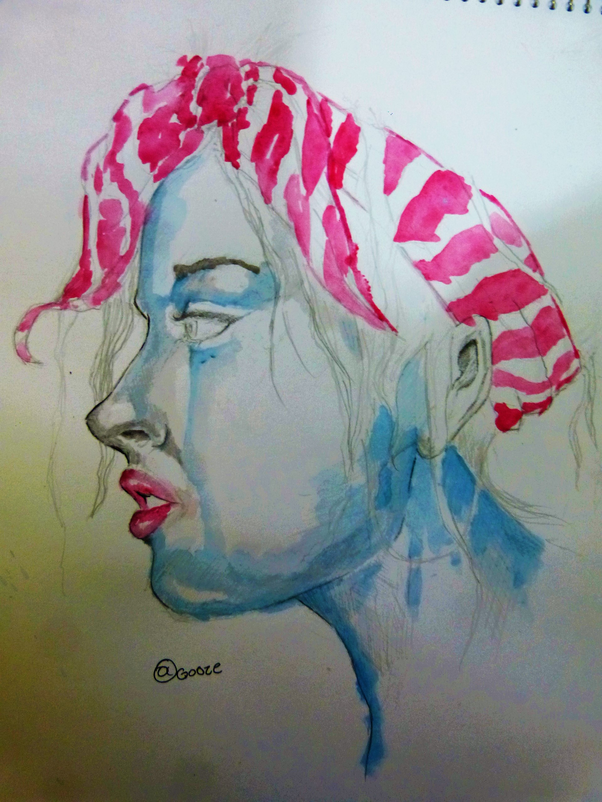Trying out red colour on her lips and lining her face blue