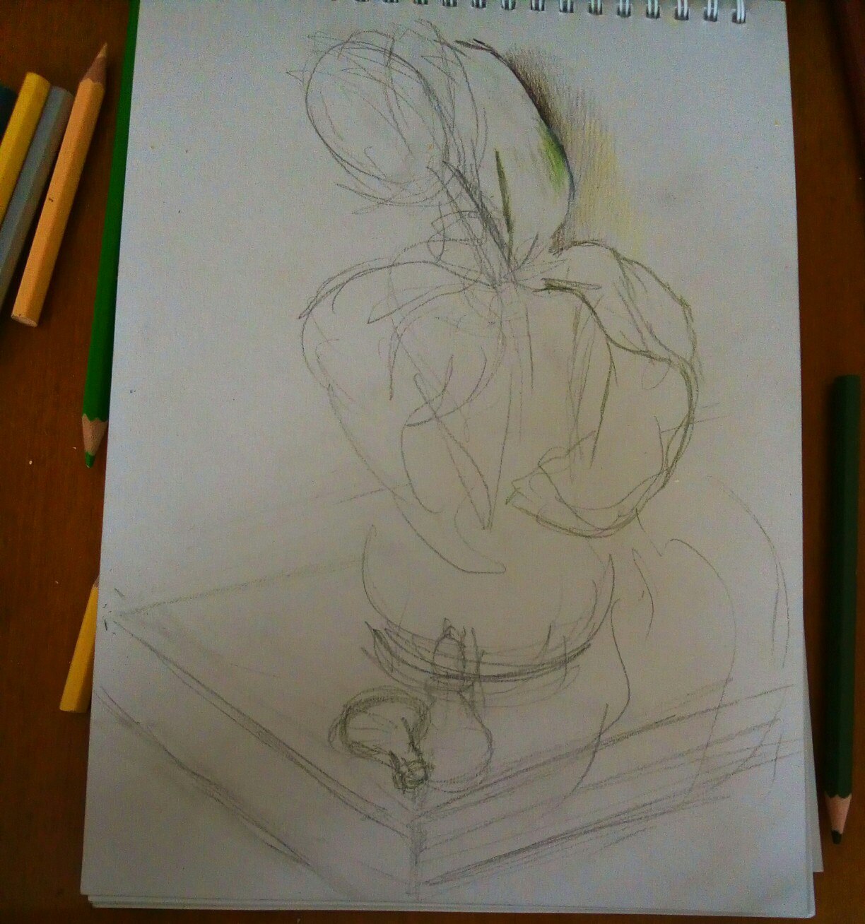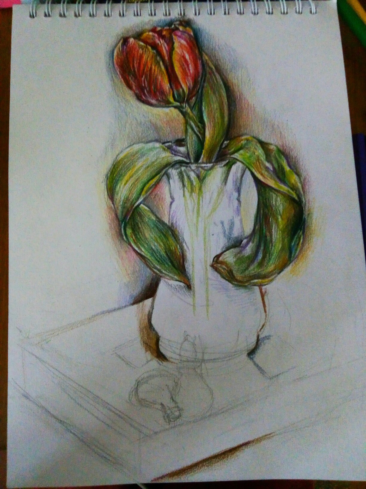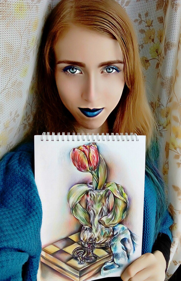 Hello! Today I will show you a drawing with colored tulips pencils standing in a vase on a chessboard. I love playing these chess. Games for logic allow the mind to develop. They played my grandmother and grandfather. They are happy with the old ones and for me they are like props.