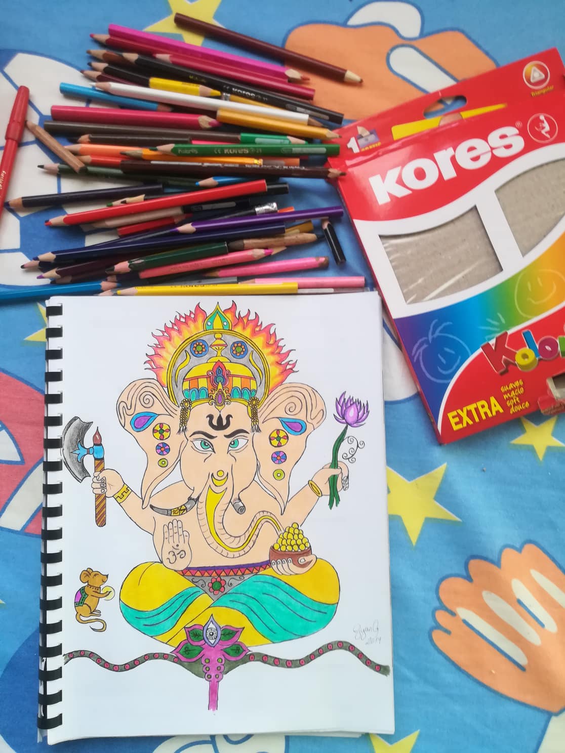 I present to Ganesha, one of the Gods that my father talked to us a lot when I was a child. At home we have many portraits, paintings and figures (sculptures) of some of them. Ganesha is one of the best known, has a human body and elephant head; This Deva of Hinduism is the God of the intellect, the removing wisdom of obstacles, as well as the patron of the arts and sciences. The mouse next to him is actually a bandicut.