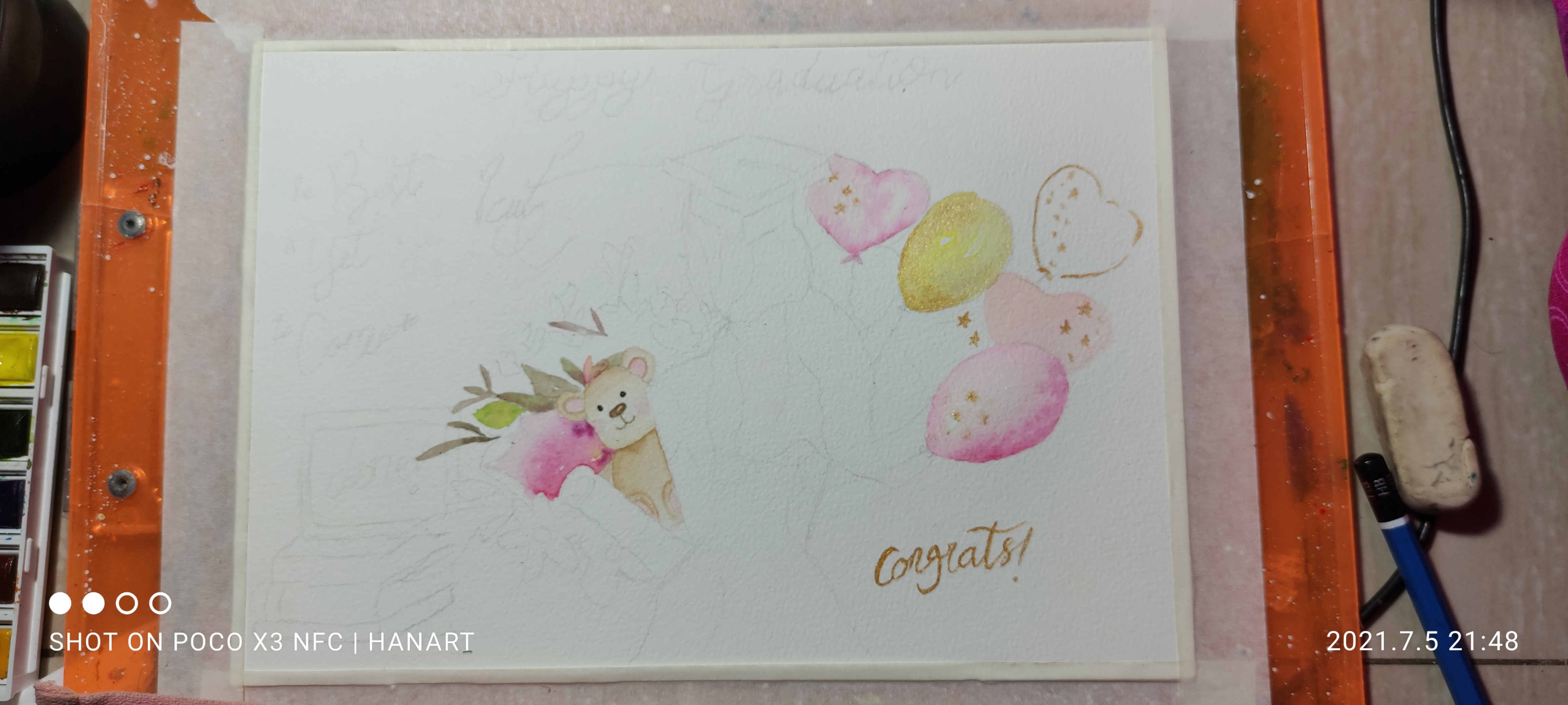 First draw the lines using pencil, and then colored the 1st layer of the painting.