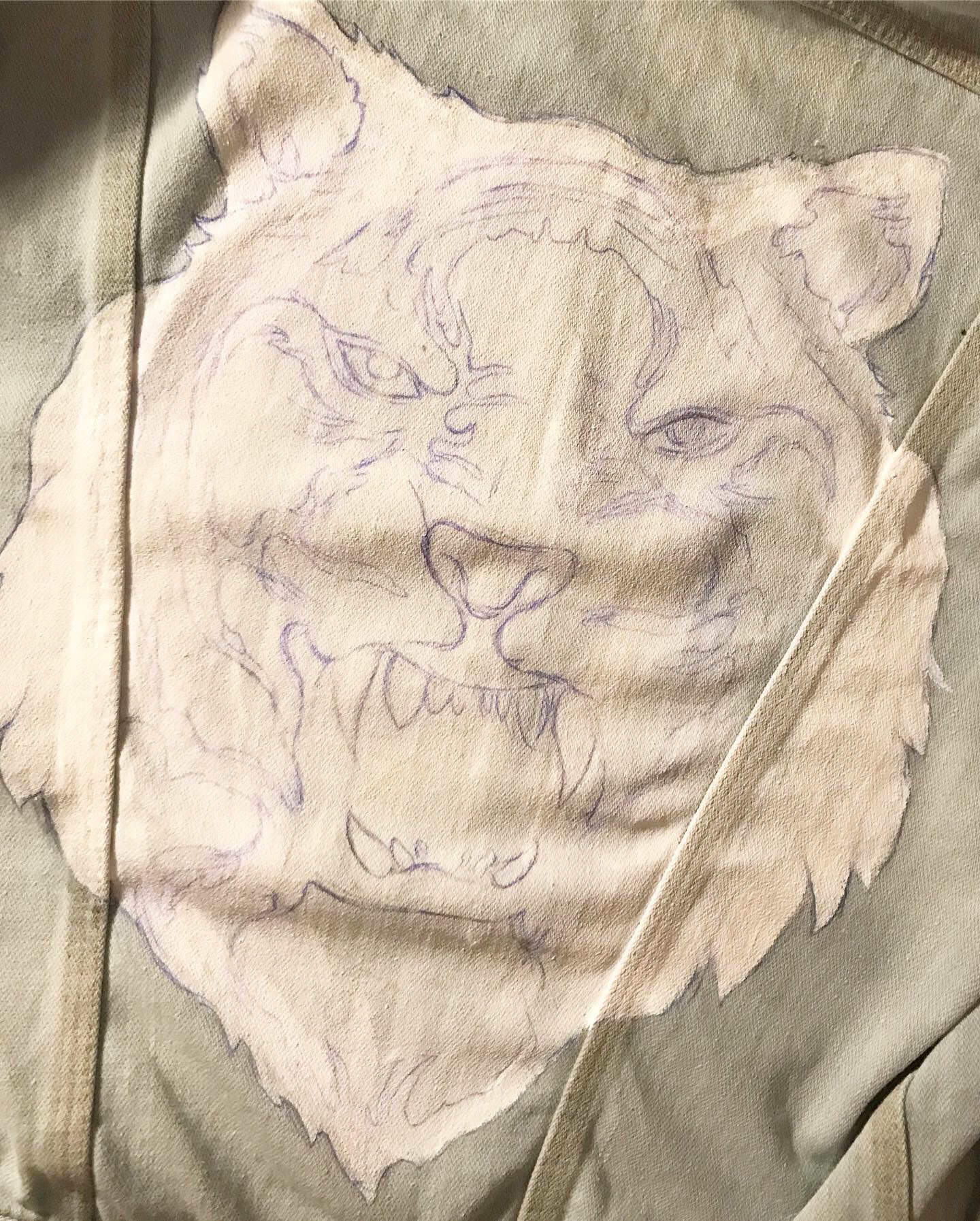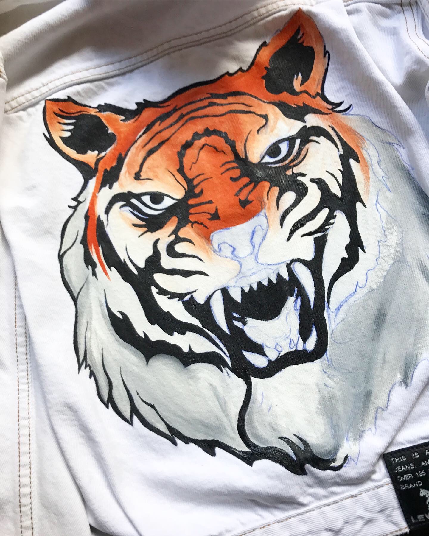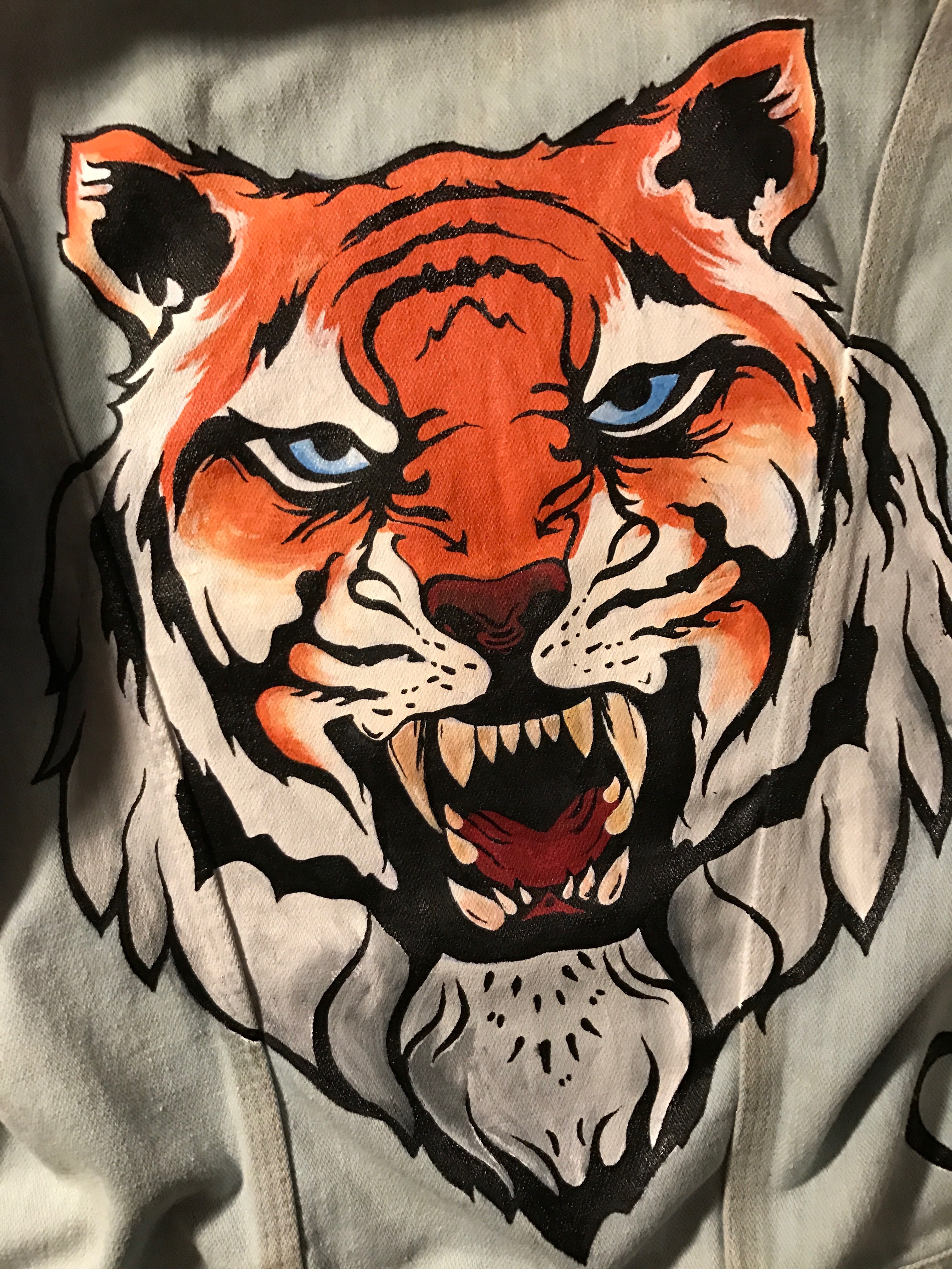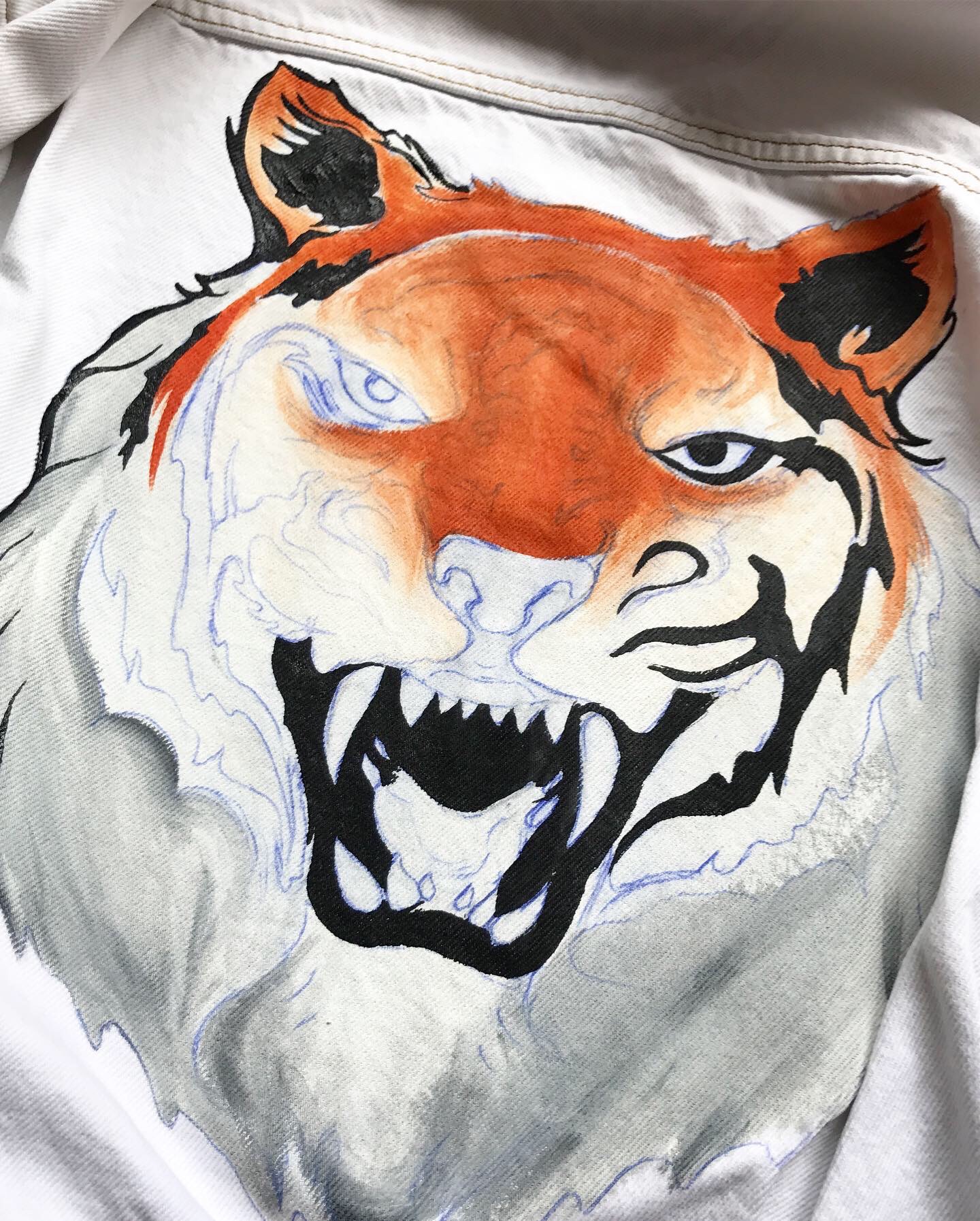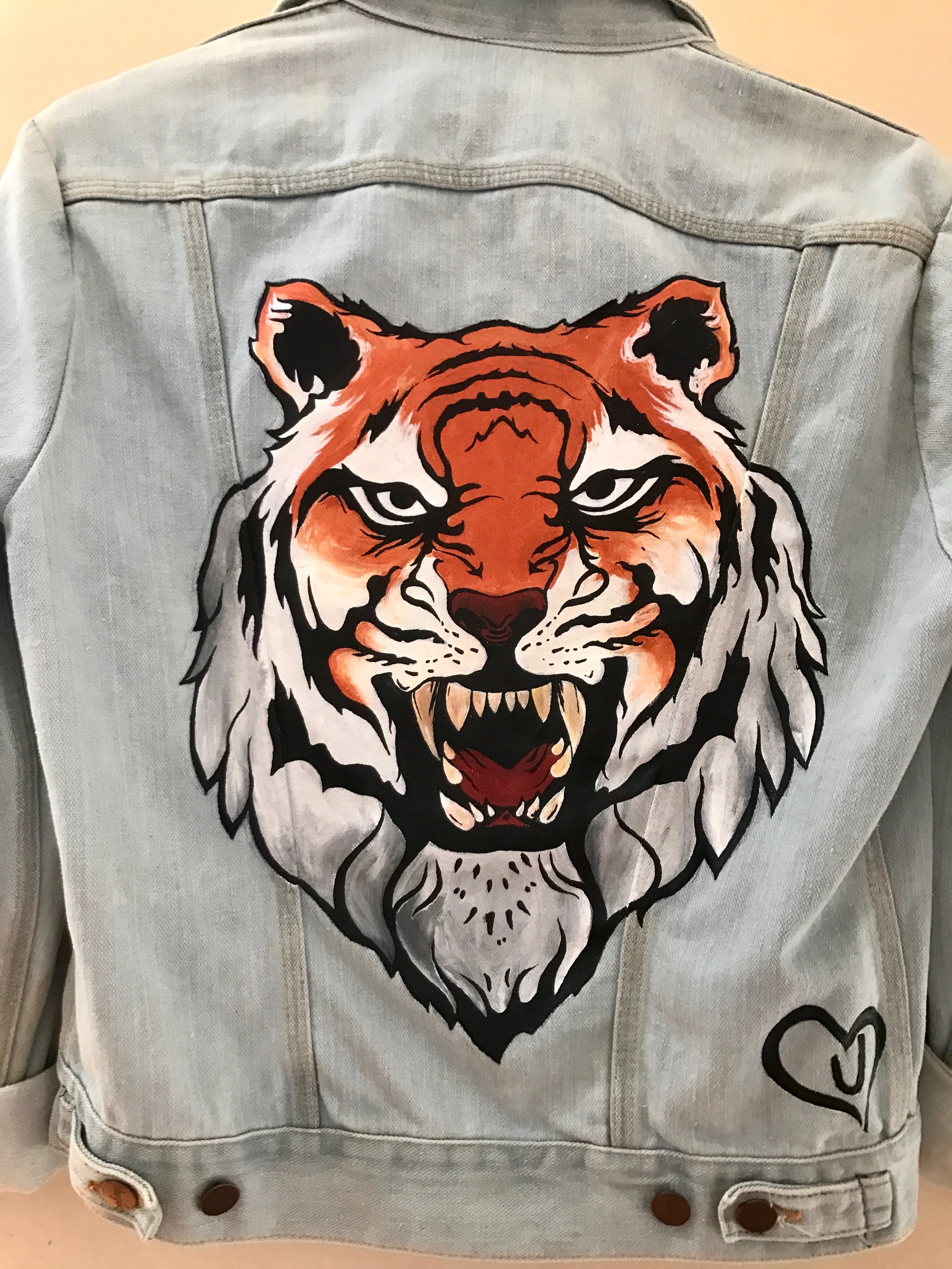 A lady contacted me wanting a jacket for her daughters 10th birthday. Her only requests in her brief was...." A roaring tiger that has blue eyes please!"