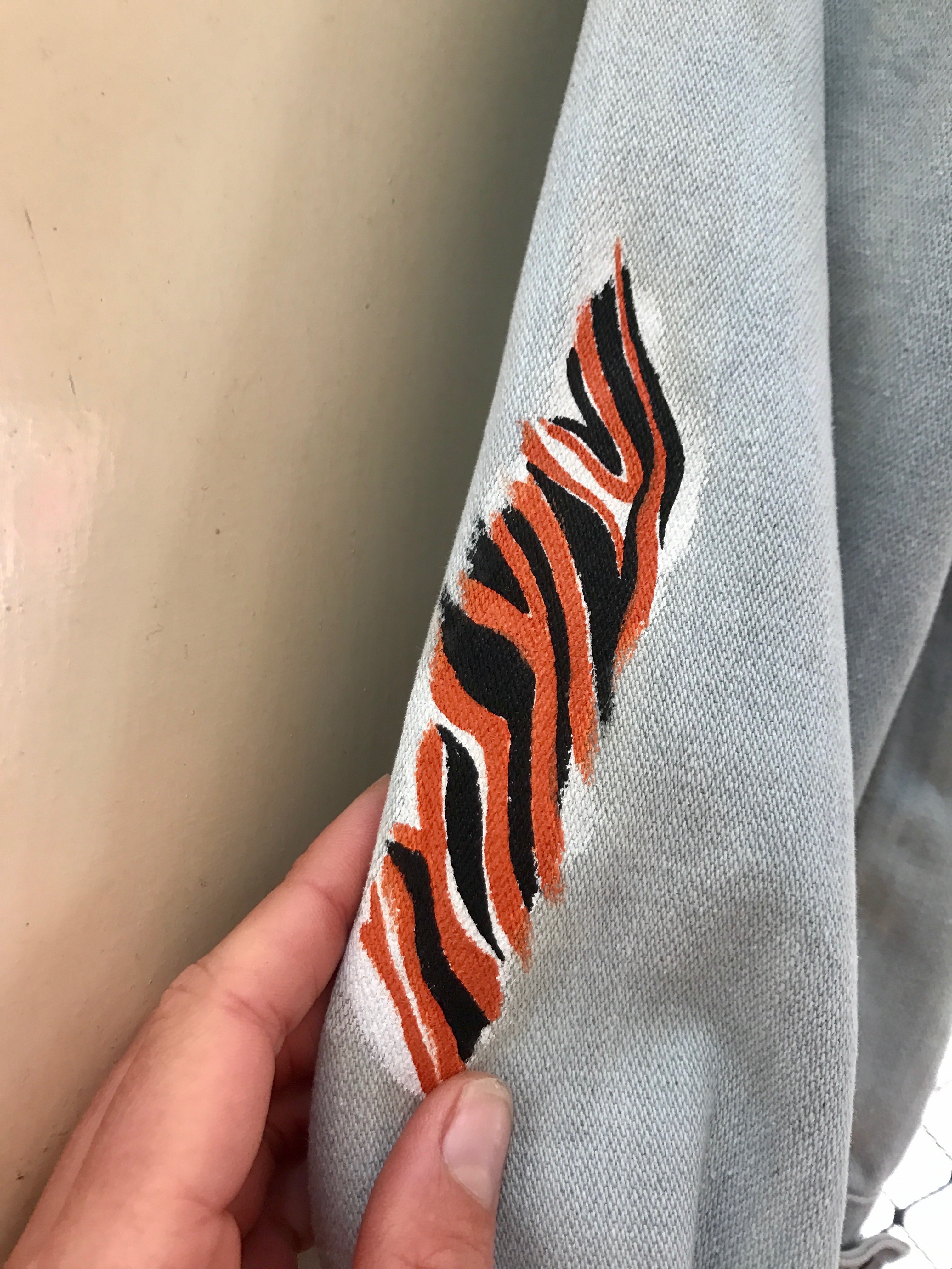 Last little step now!!! There was a slight stain on the arm of the jacket that I painted over with a little patch of the tiger pattern. I only use vintage jackets as I don't want to contribute to more waste in this world, and the quality of the old vintage jackets is so much better anyway!!! But it also means sometimes they take a little extra work to tidy up any little marks or stains... but I dont mind! To me it is soooooo worth using these vintage jackets even if it takes a little extra time!!