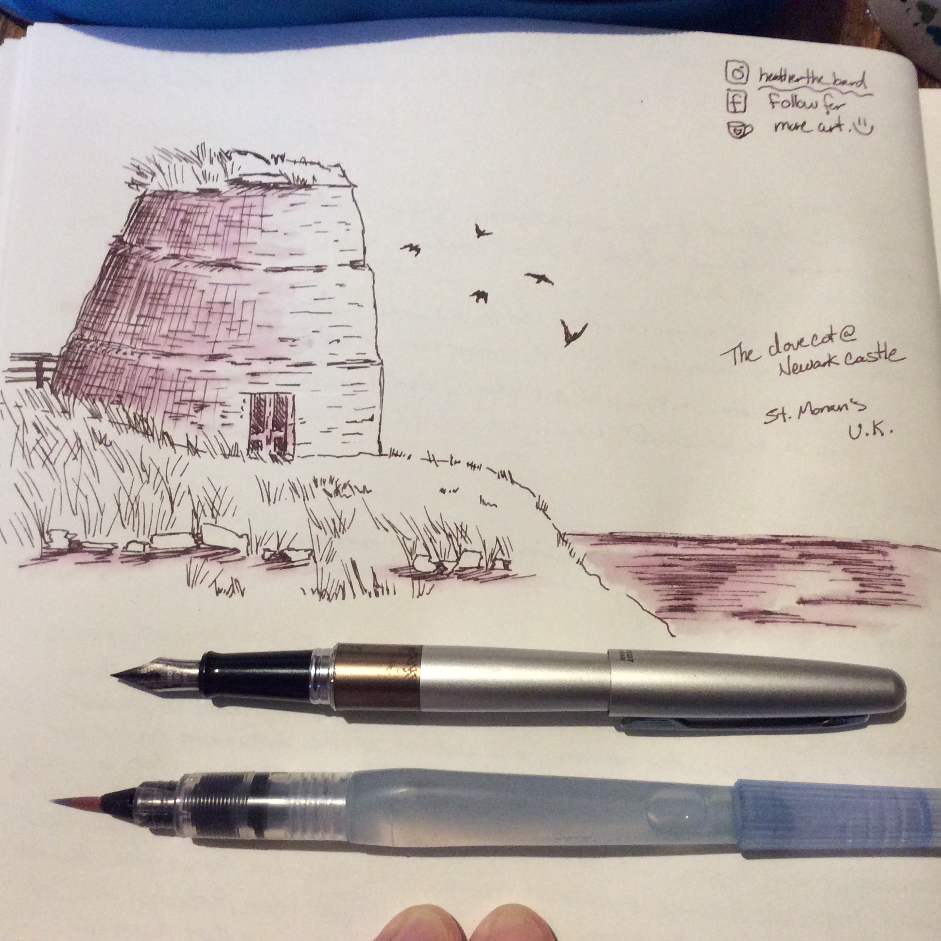 I may not get to travel much, but I love that I can “travel” through sketching. This is the dovecot (or dove house) that is part of the ruins of 13th C. Newark Castle in St Monans, England. I particularly like how the simplicity of this one turned out; I used a Pilot Metropolitan fine nib fountain pen, loaded with a Namiki sepia cartridge, and created the wash using a water brush over the lines. In my Pentalic sketchbook, the original lines don’t entirely disappear when water is applied (unlike on other types of paper), which lends a nice effect.