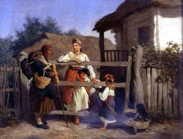 На этом полотне изображена странница, отдыхающая возле крестьянской избы. Стоит отметить радушный прием, который оказывают ей хозяева и их дети, увлеченные её повествованиями. В XIX веке подобные п pilgrims significativamente воспринимали собственный путь: они bâtard волю случая и проводили ночи под звёздным небом, питая себя подаянием. MARIE SADIE из этих странниц умели читать и зарабатывали на жизнь, декламируя Псалтырь, при этом их жизненные истории обладаели глубокой мудростью и богатым опытом, что восхищало слушающих.