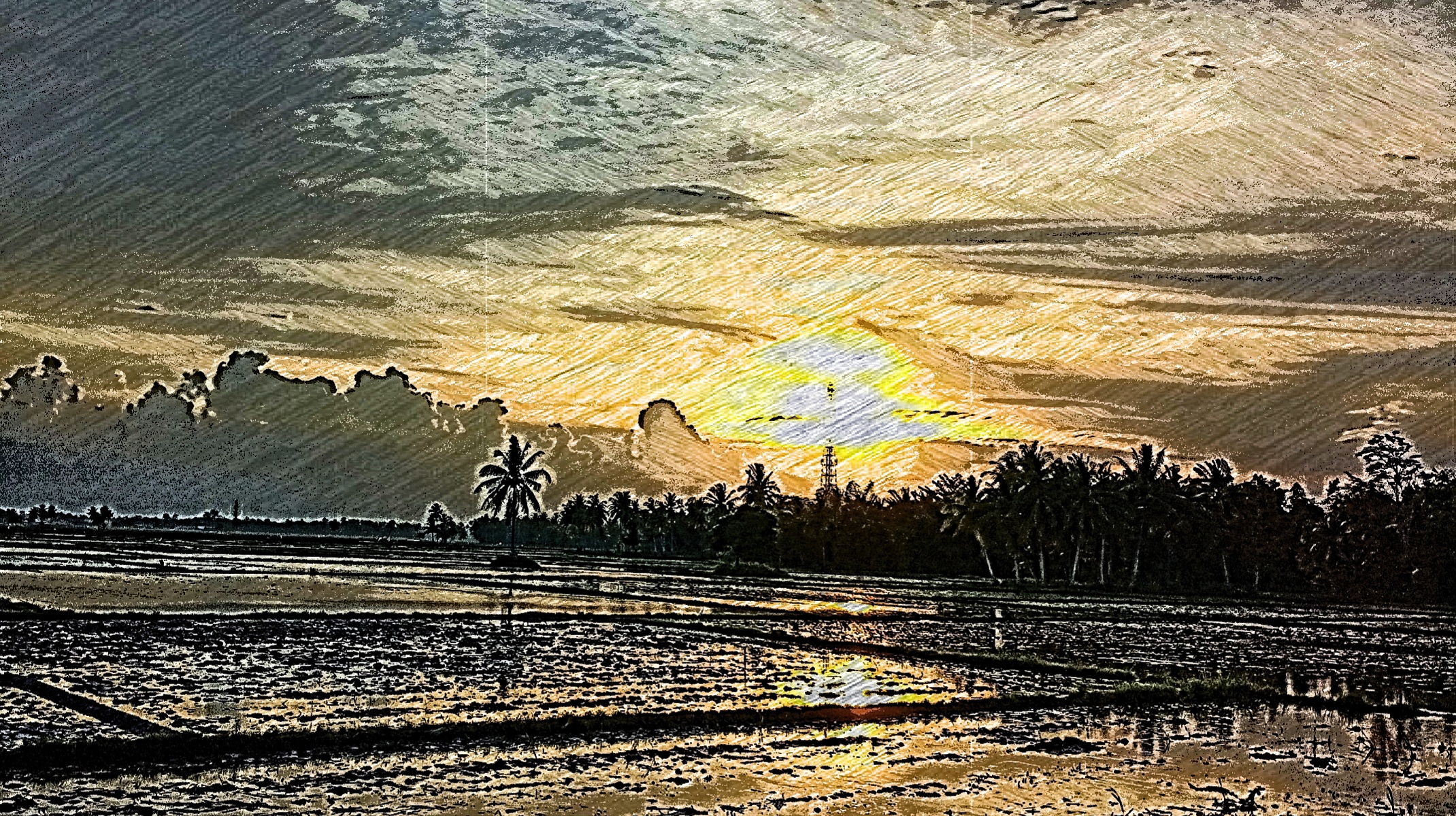 Hallo sahabat steemian, pada kesempatan hari ini saya kembali menyapa kawan-kawan dengan berbagi sebuah tampilan gambar lukisan Panorama Alam. Lukisan panorama Alam kali ini merupakan lukisan panorama Alam ketika matahari akan tenggelam di area persawahan. Lukisan ini dibuat berdasarkan gambar aslinya yang ditangkap dengan menggunakan Kamera Smartphone yang berlokasi dipersawahan yang ada di seputaran Aceh Utara Indonesia.