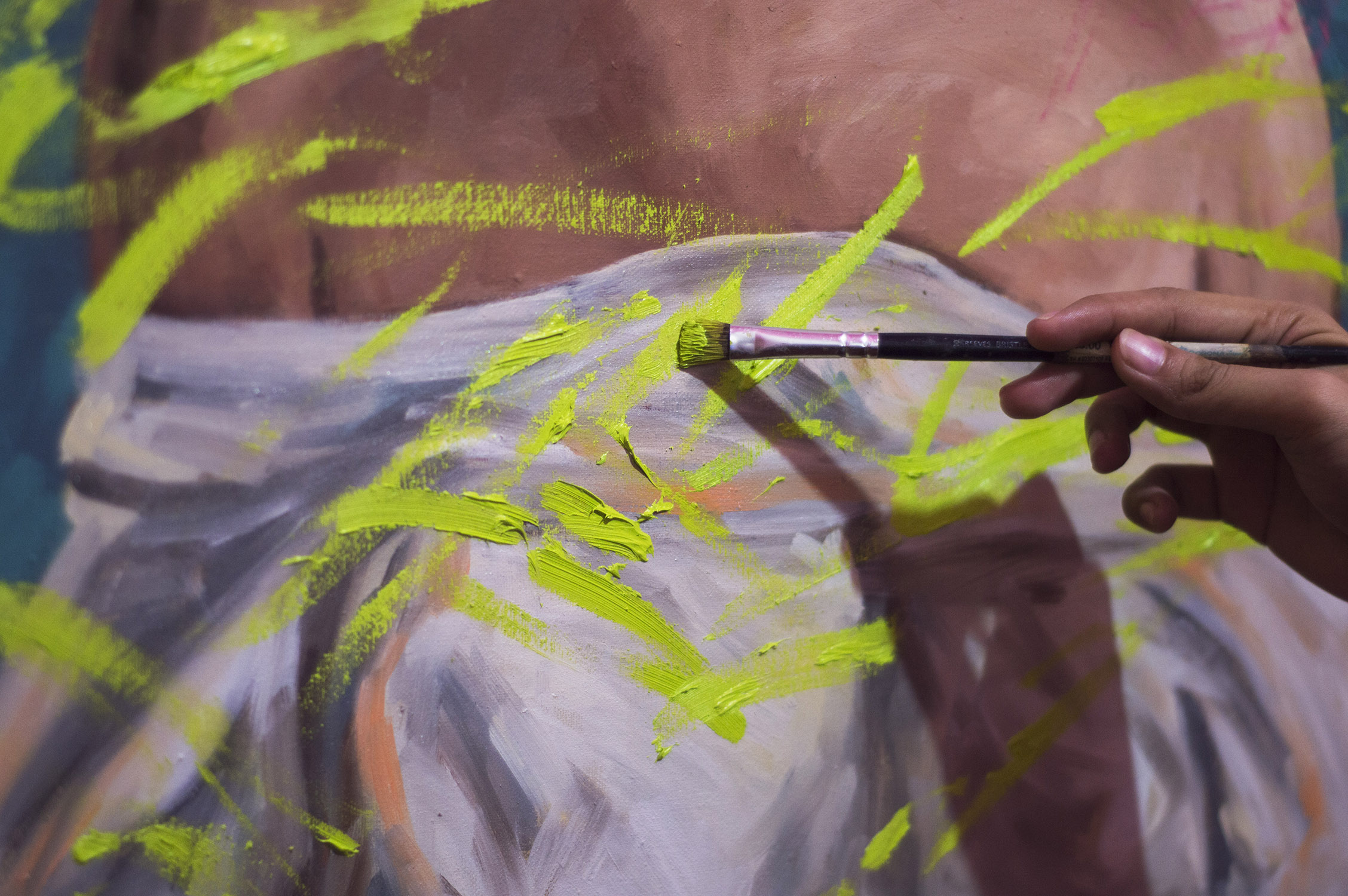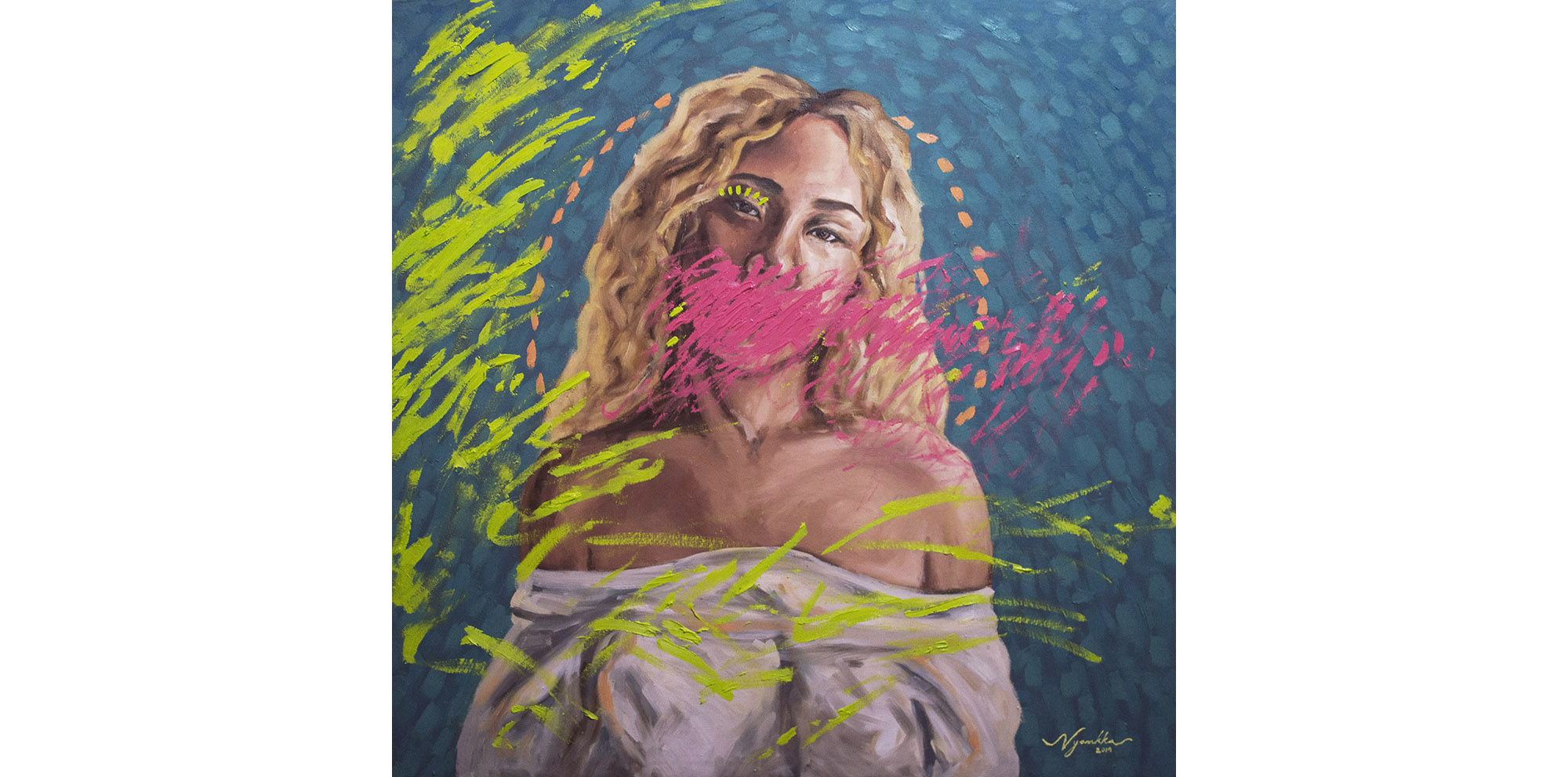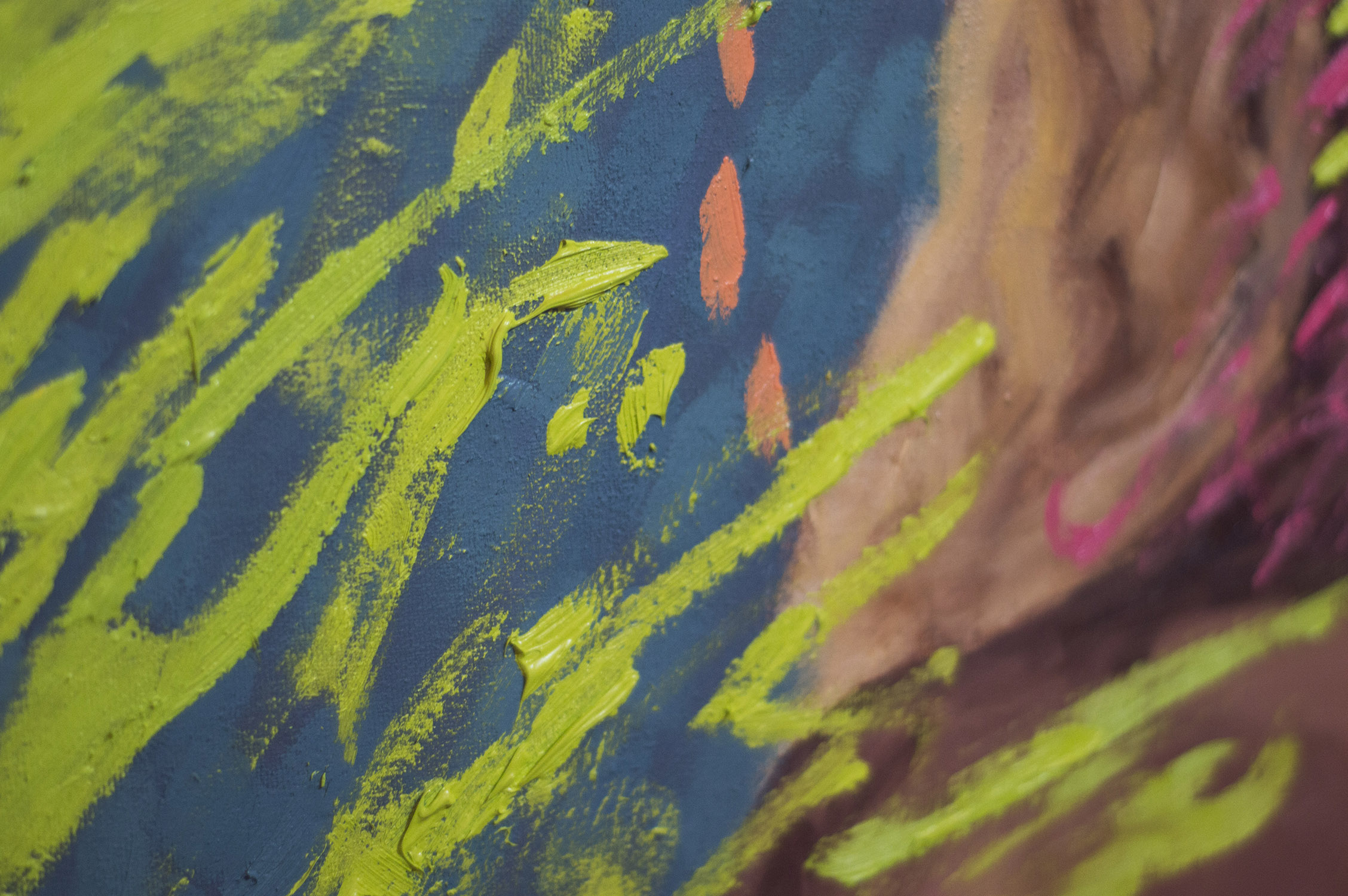 That's awesome. I like the colours and the brush strokes. It looks like tye bubble gum popped. The oink offsets the cooler colours nicely.