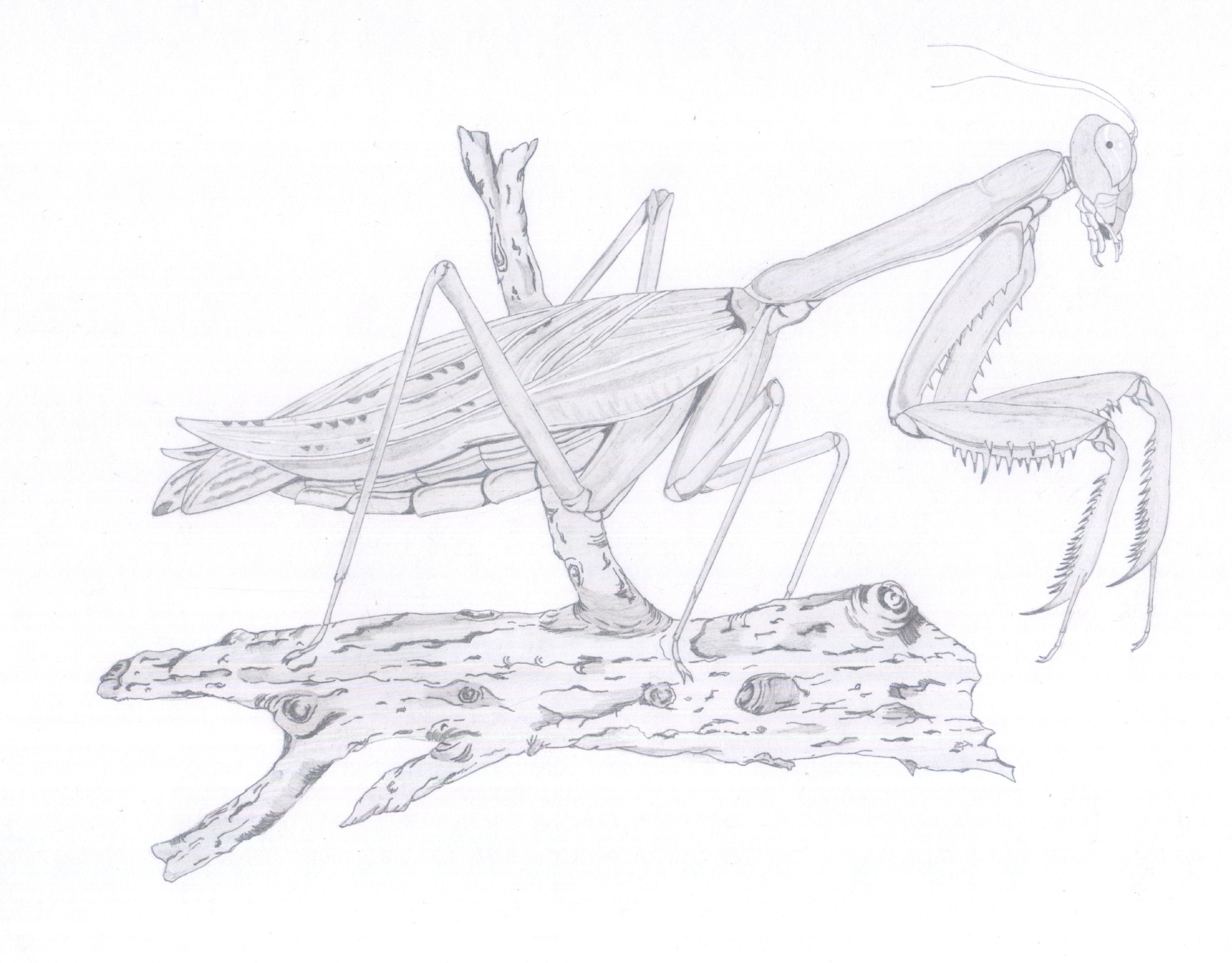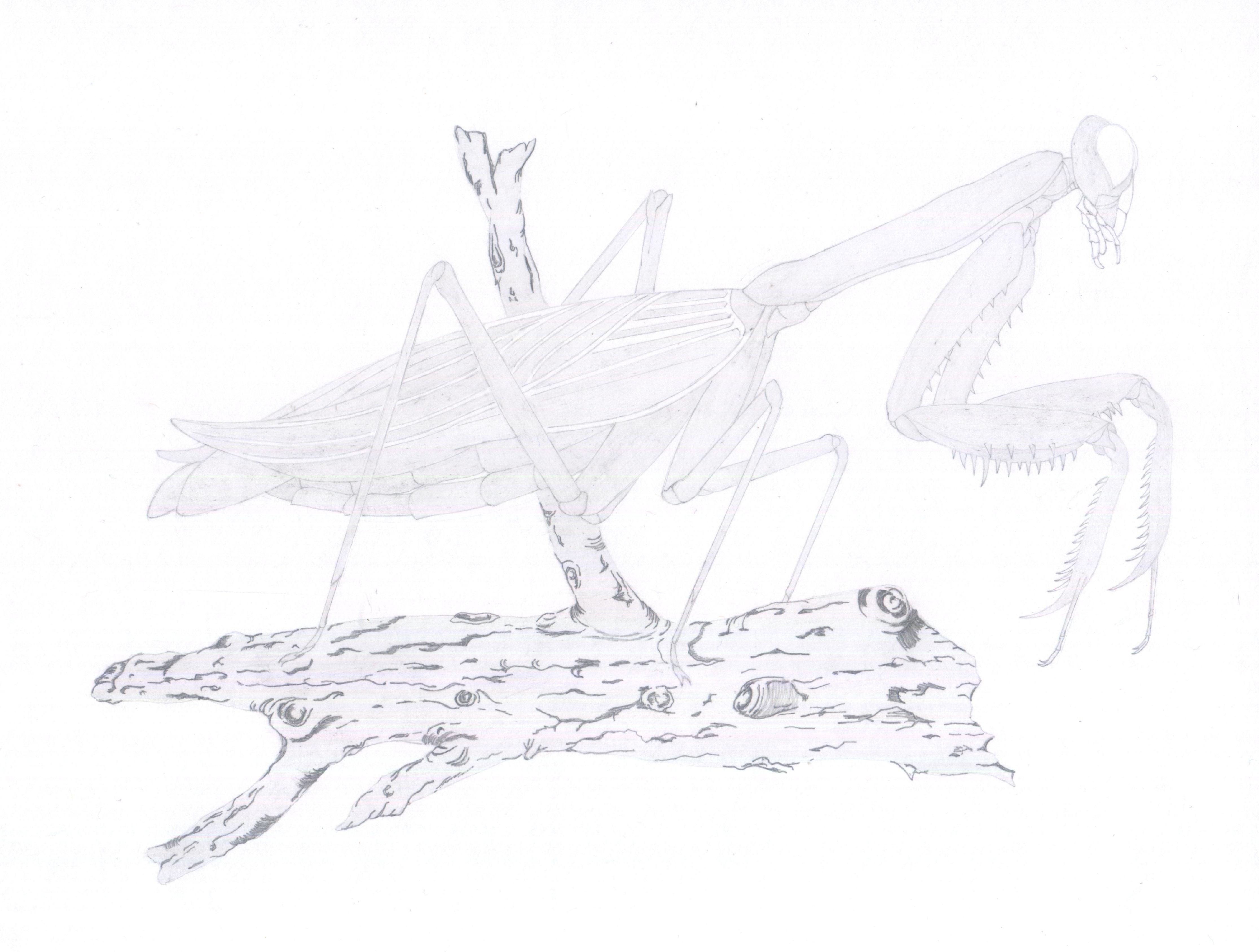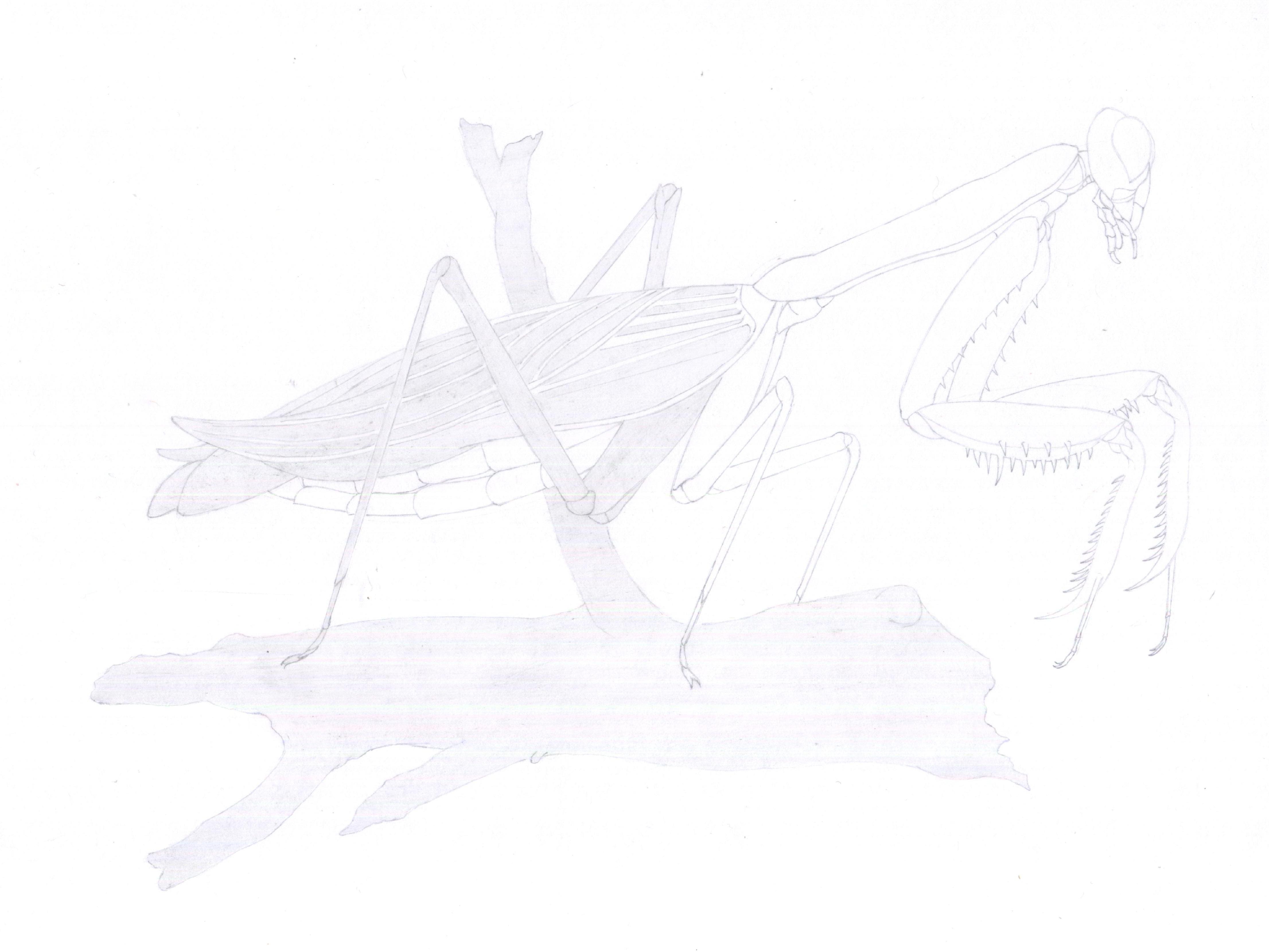 El proceso de desarrollo se los muestro con el dibujo escaneado mientras lo realizaba, les presento la primera imagen con la mantis ya terminada.