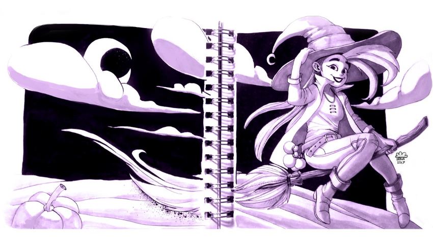 Wow I am super impressed! It is very hard to pick favorites since they are ALL AWESOME! The witch blowing the fish bubble is pretty funny. I think my favorite is the witch riding her broom off the page - this one is so cool since you left the spiral binding in which makes it really seem like the witch is just flying right off the page. I am a huge fan of yours now! Following you and looking forward to more great drawings in my feed. Cheers - Carl