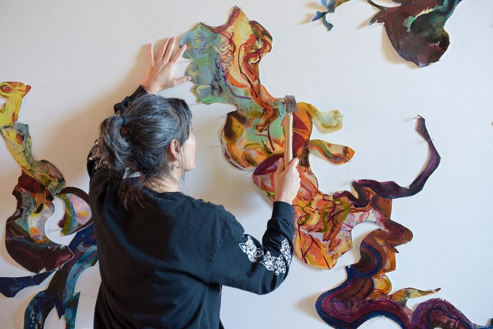 Fine arthojroth (25)in #art • 7 years ago The last few weeks at M Fine Arts has been filled with color and enthusiasm, thanks to Kim Sobel’s paintings and cutouts. I have had the pleasure of assisting her throughout her installation process.