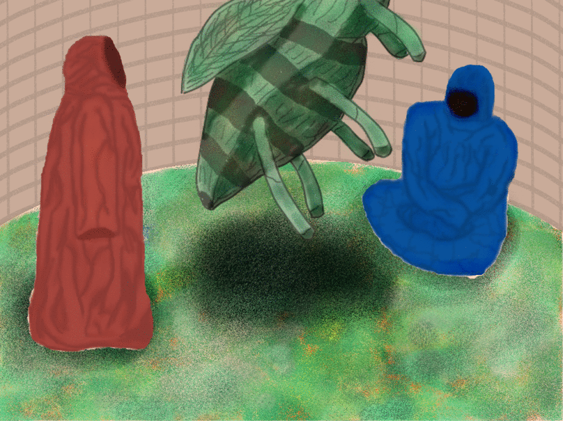 “That's it?” Orvus said, disheartened. “I think not,” said the old man, “here, come help.” They both stood firm and exerted force on the statue, in an attempt to rotate it back facing east. Kogg was incredibly excited now, and hopped up and down. That statue gave in and without too much effort, they had managed to get it back facing eastward. Again, from beneath the two heard something give way. The fourth circular step platform with the statue started to sink lower than the third. It continued down and when they were waist deep, Orvus looked at his friend, “We could still climb out at this point.” The old man smiled at Orvus. The platform sank deeper, and deeper until even the statue was beneath ground level. They both looked up the shaft they were sinking into, then the old man sat down.